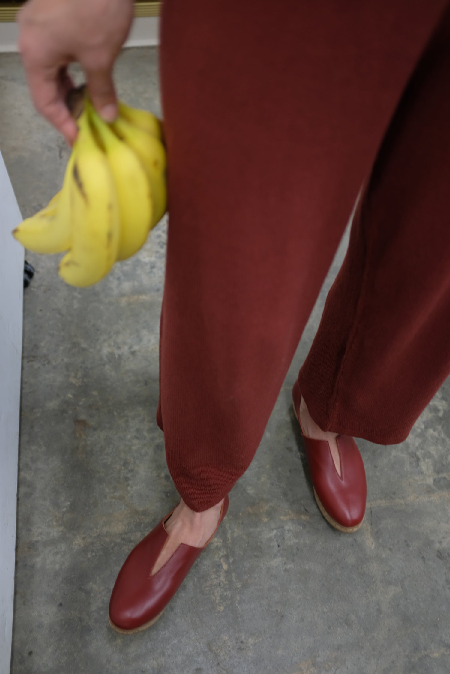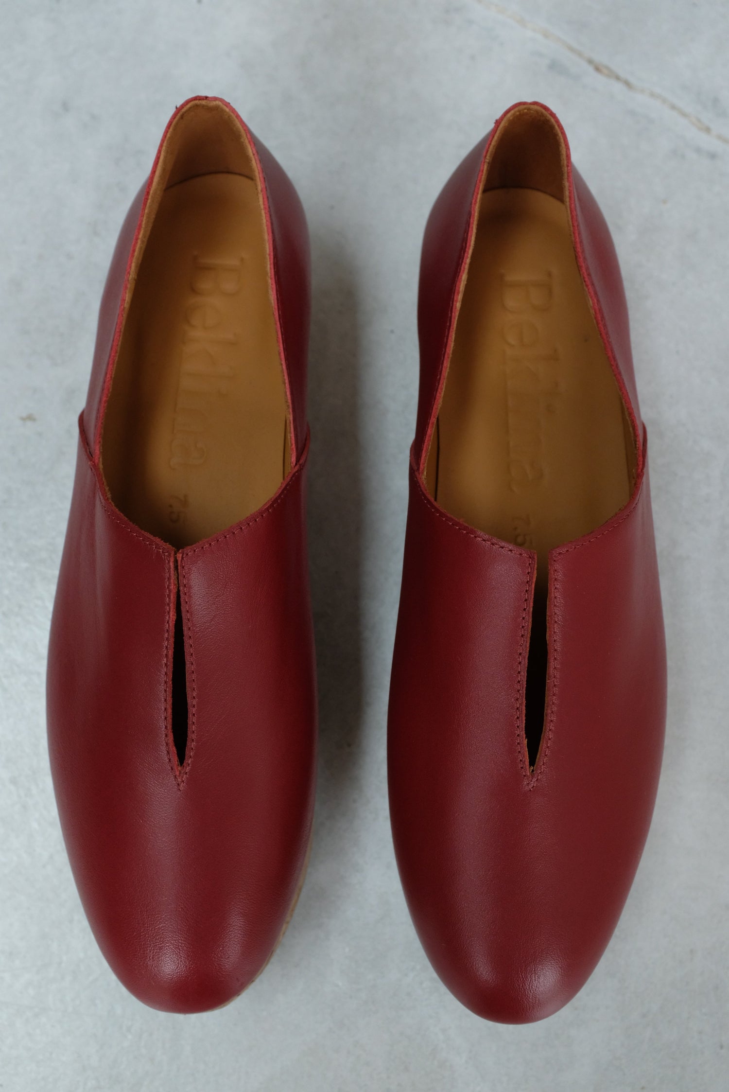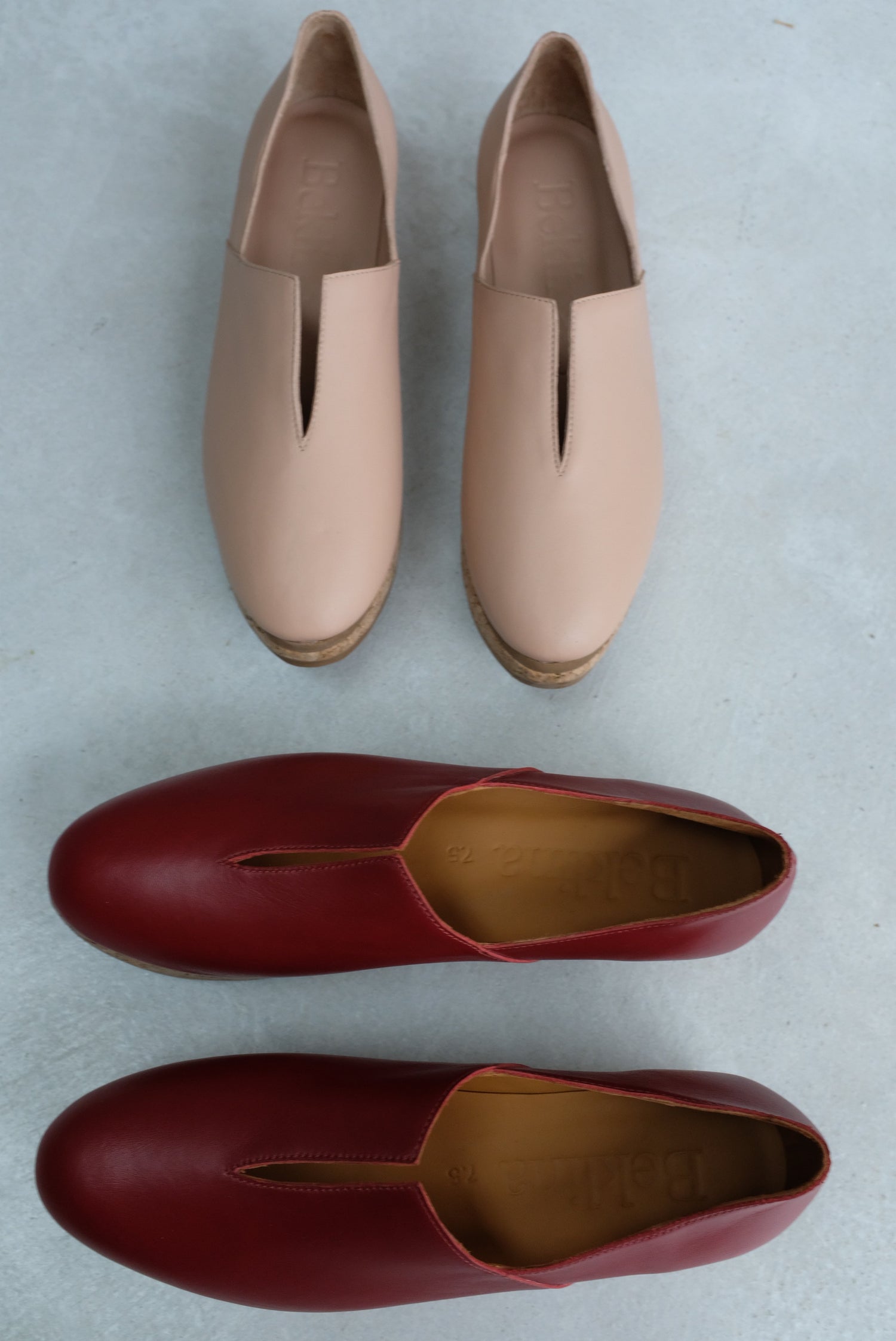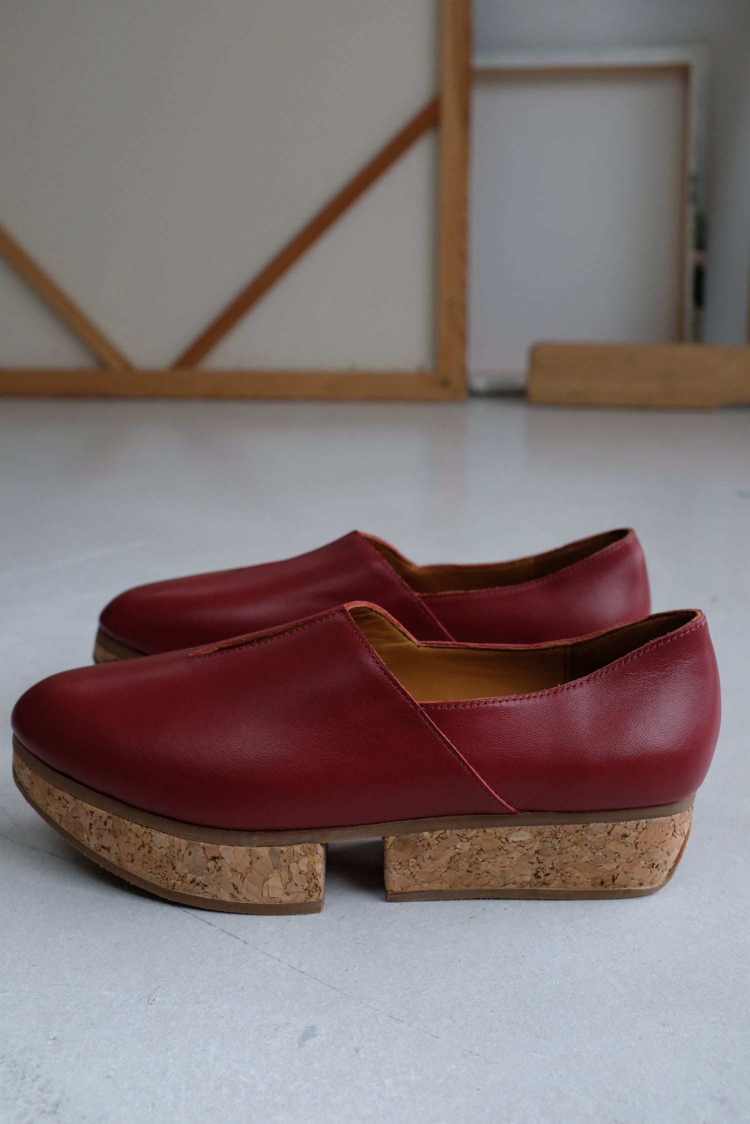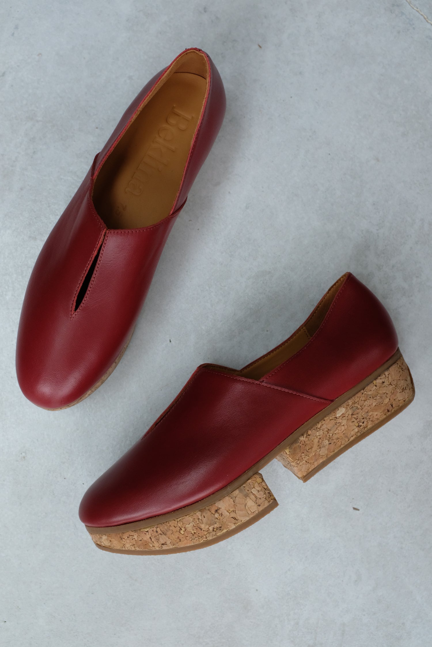Leather slip on shoe, split cork 1 1/4" platform heel, all leather upper, v-detail, walking shoe.