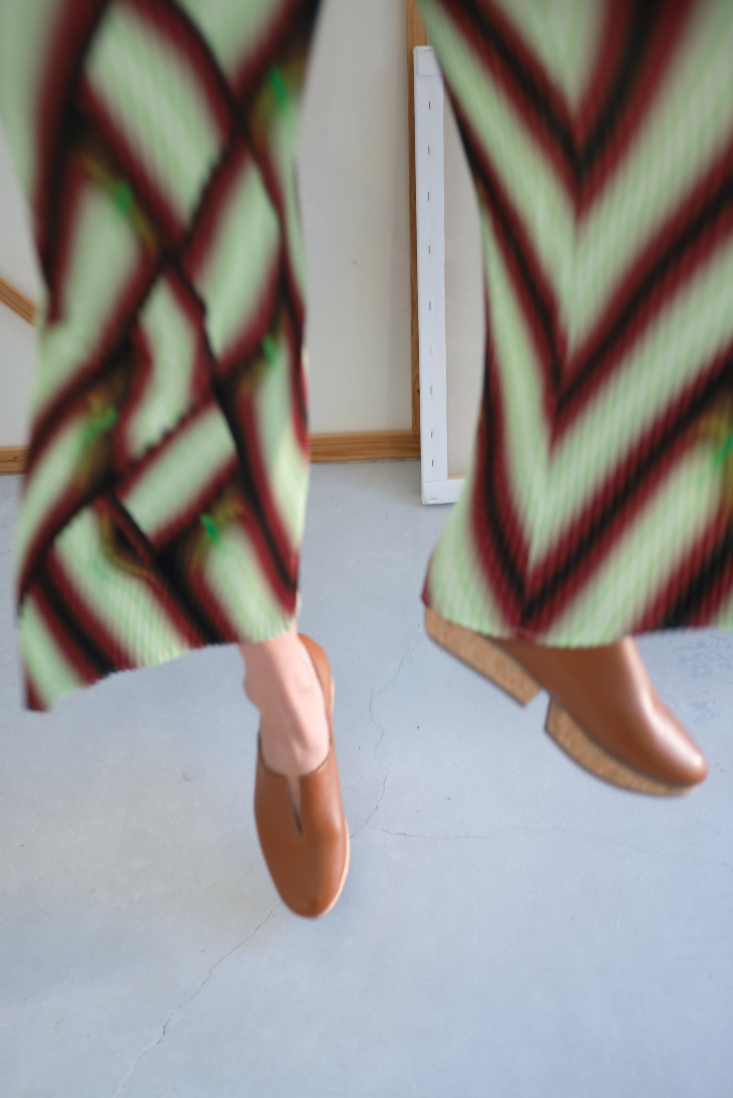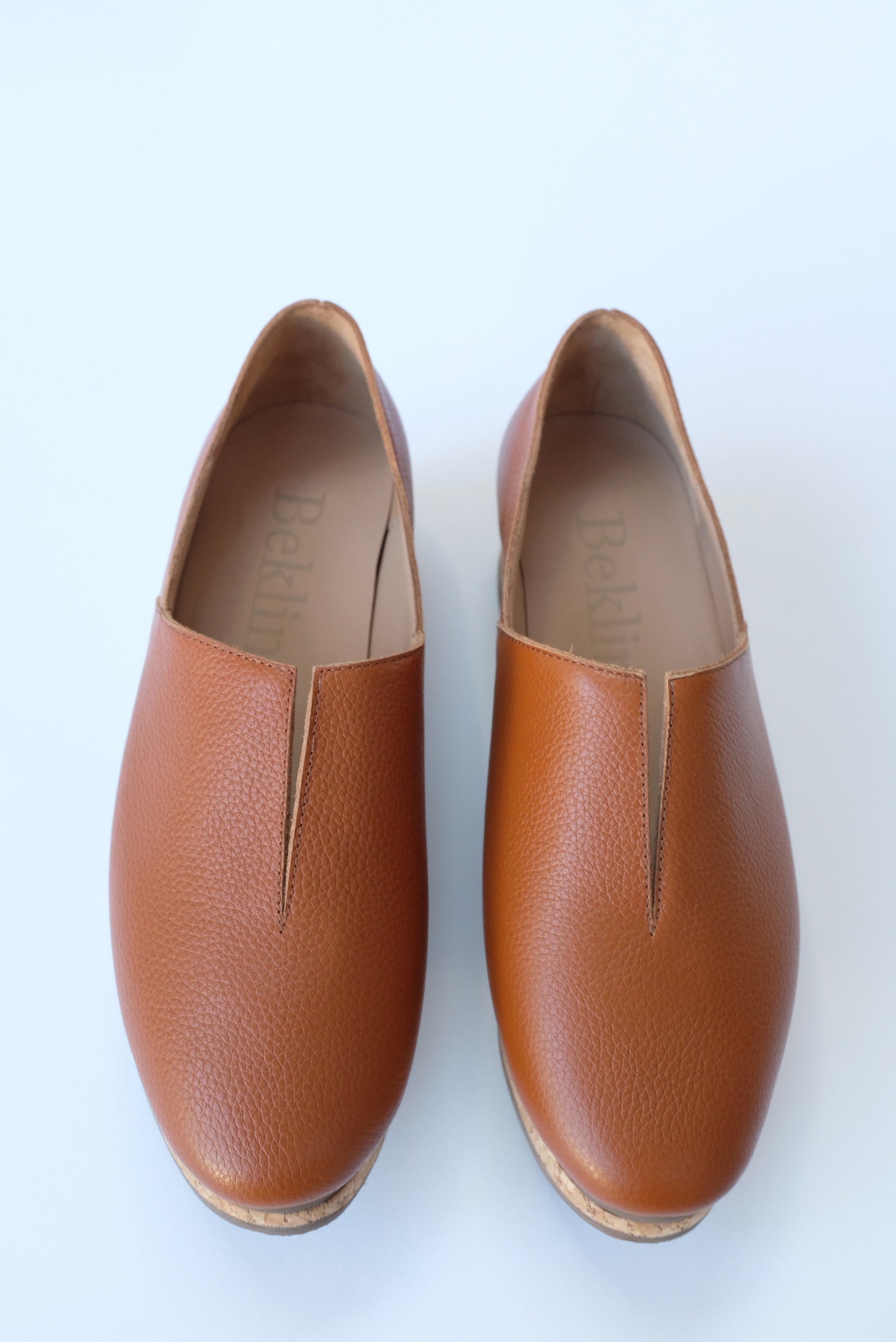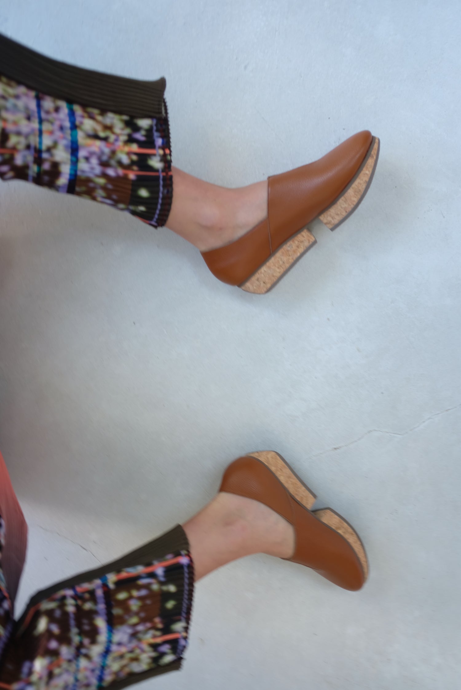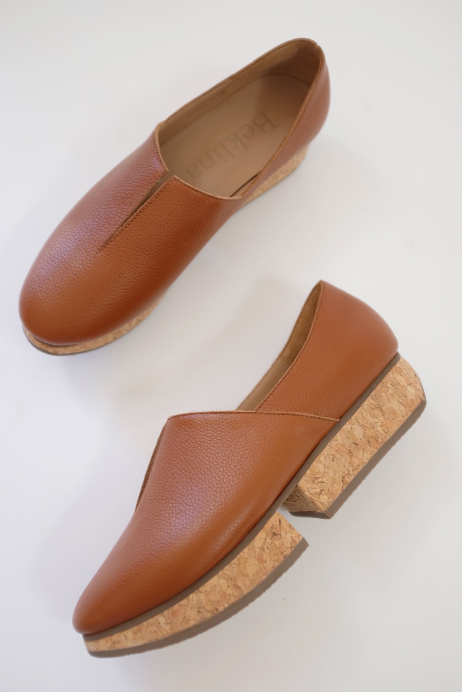 Leather slip on shoe, split cork 1 1/4" platform heel, all leather upper, v-detail, walking shoe. A best selling shoe in the shop. These are hard to keep in stock due to their cult following :)
