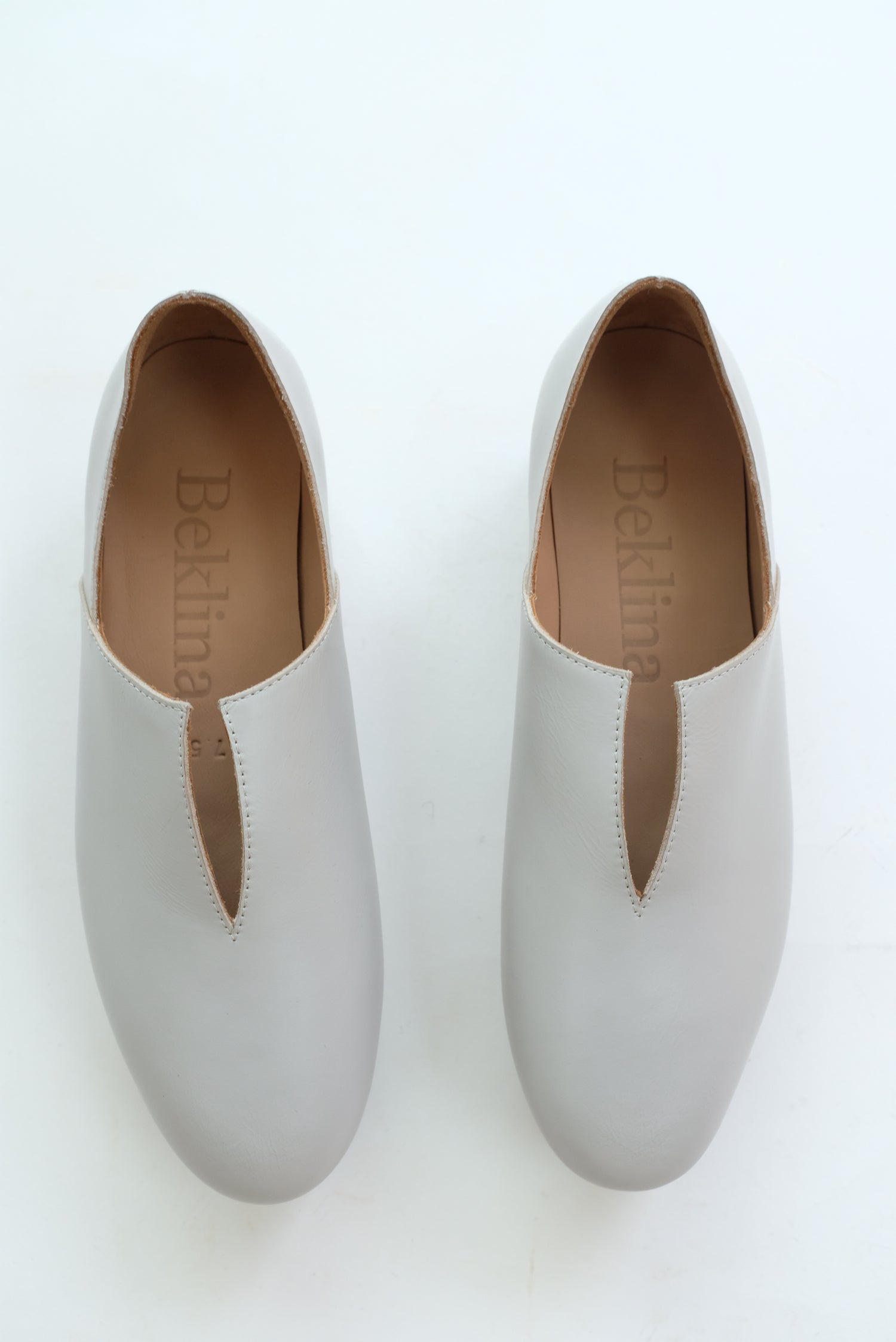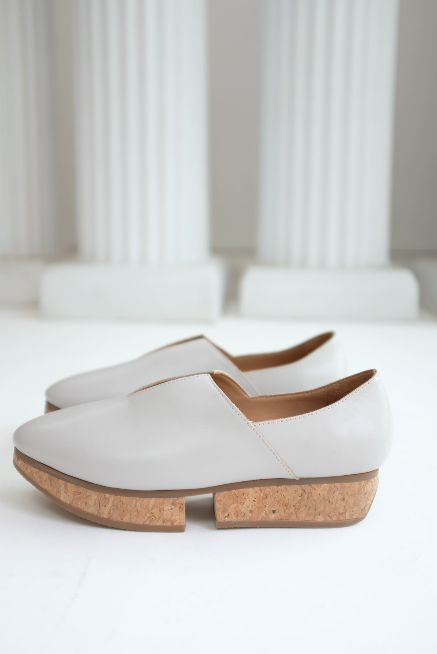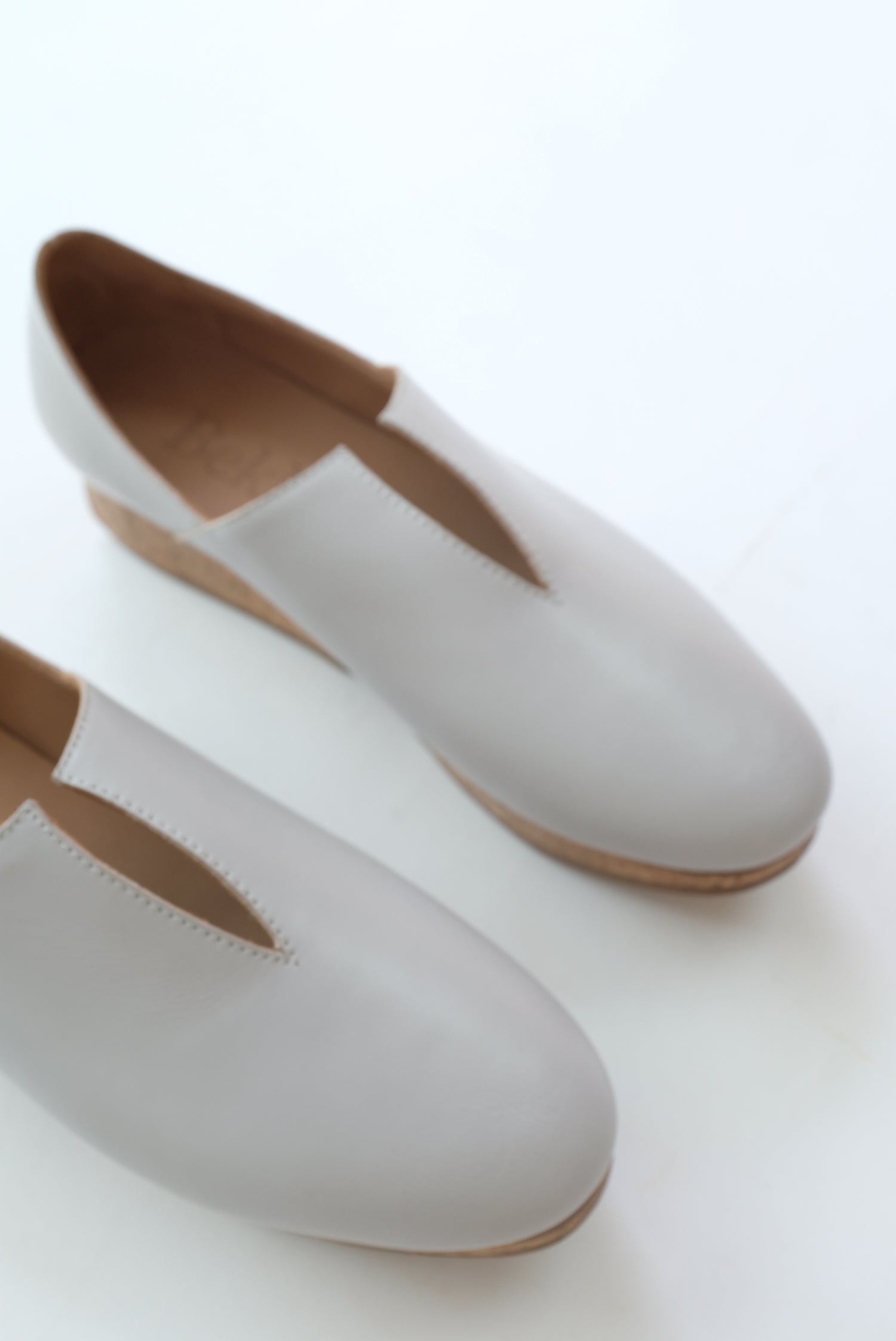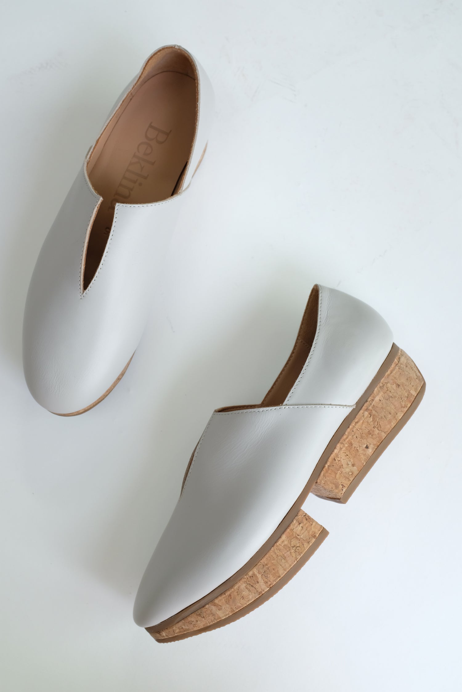 Leather slip on shoe, split cork 1 1/4" platform heel, all leather upper, v-detail, walking shoe. A best selling shoe in the shop. These are hard to keep in stock.