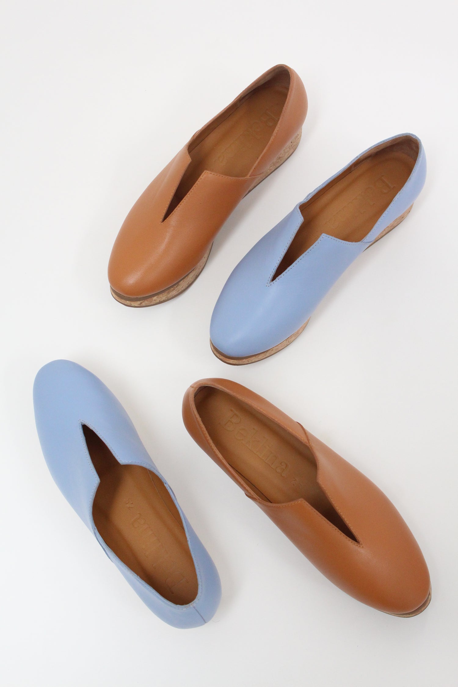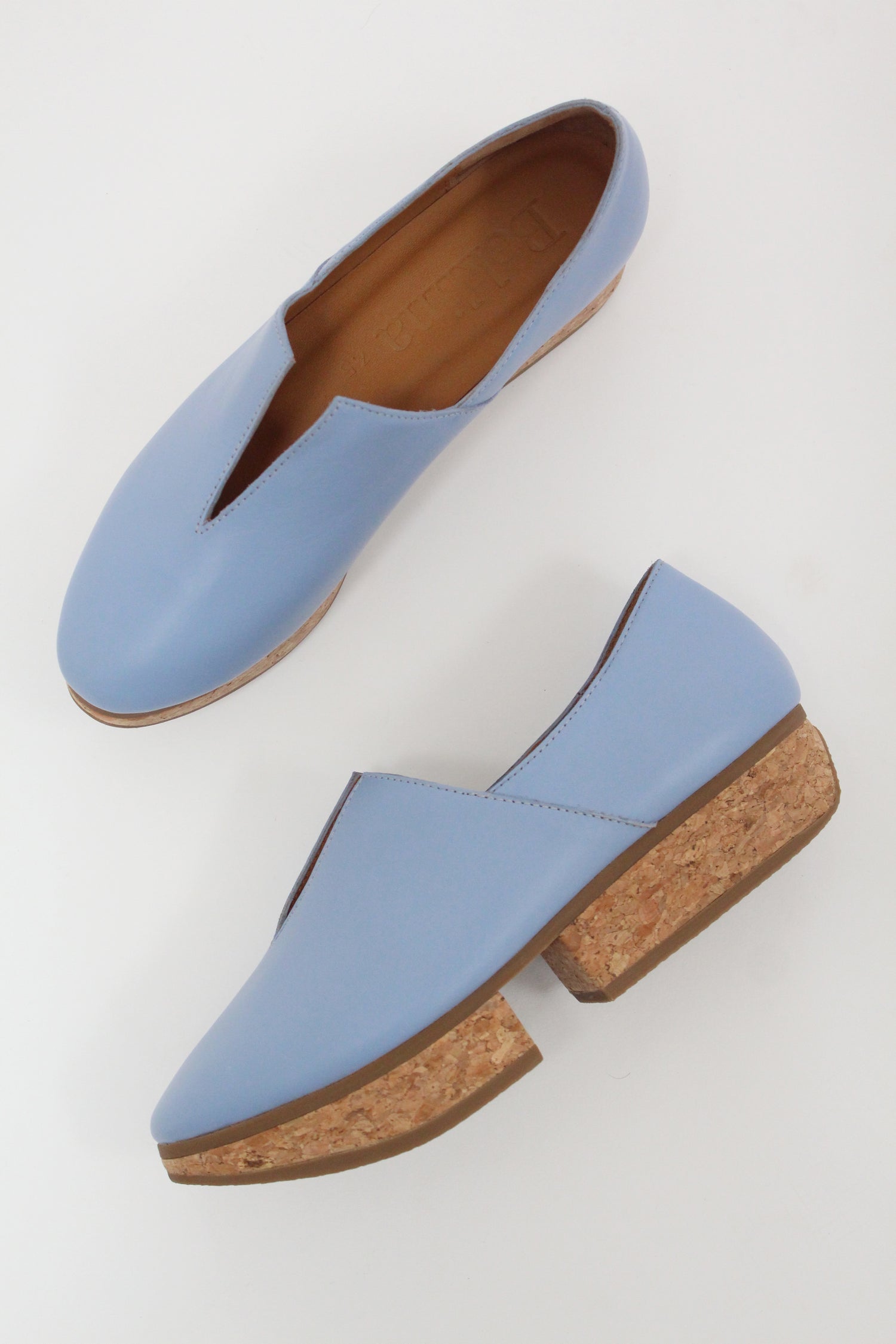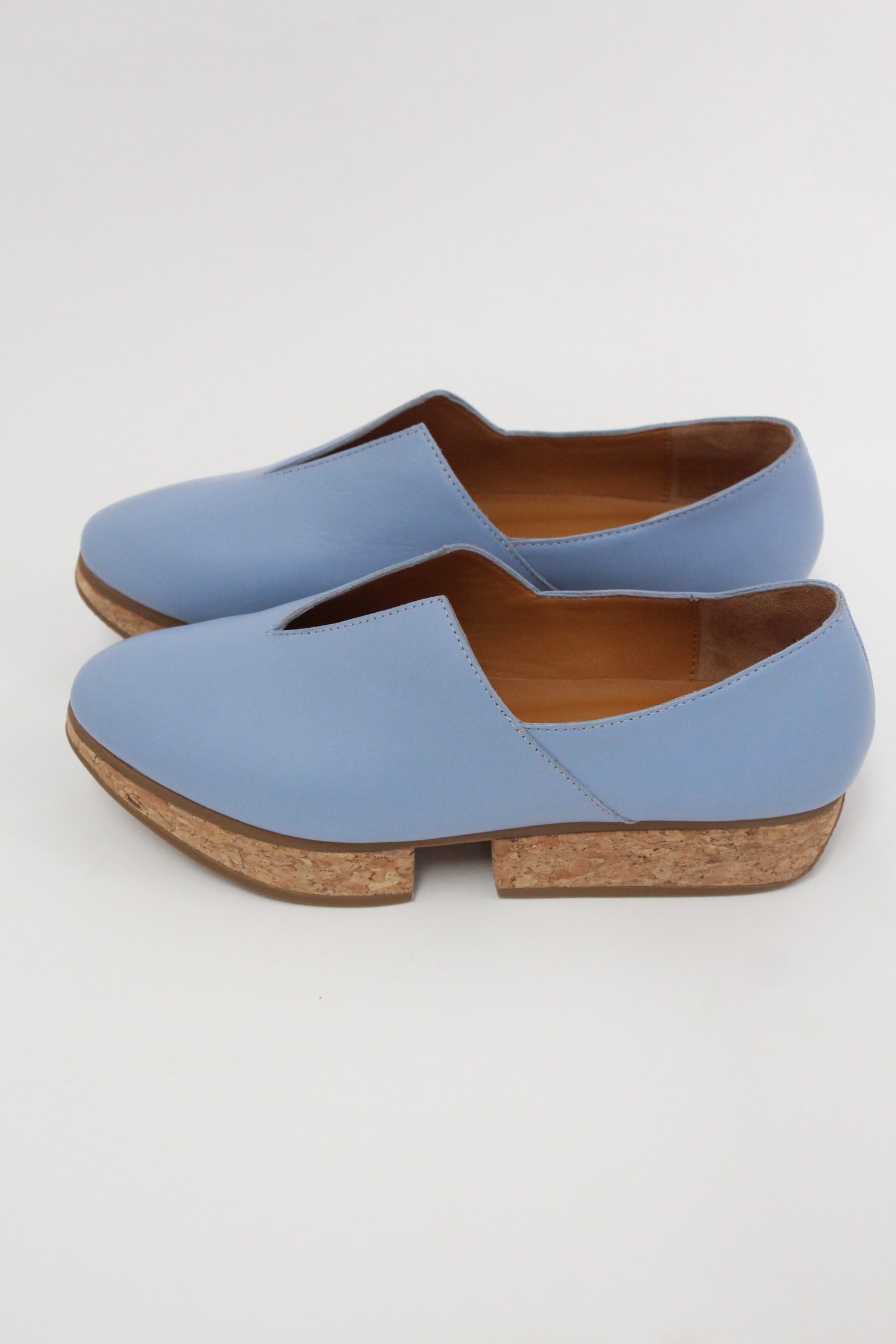 Leather slip on shoe, split cork 1 1/4" platform heel, all leather upper, v-detail, walking shoe. A best selling shoe in the shop. These are hard to keep in stock.