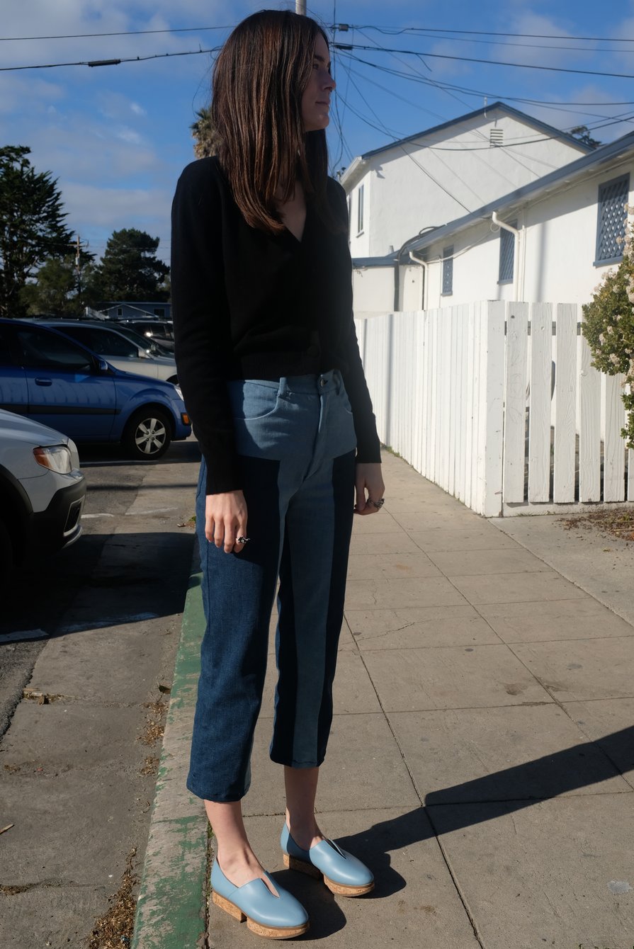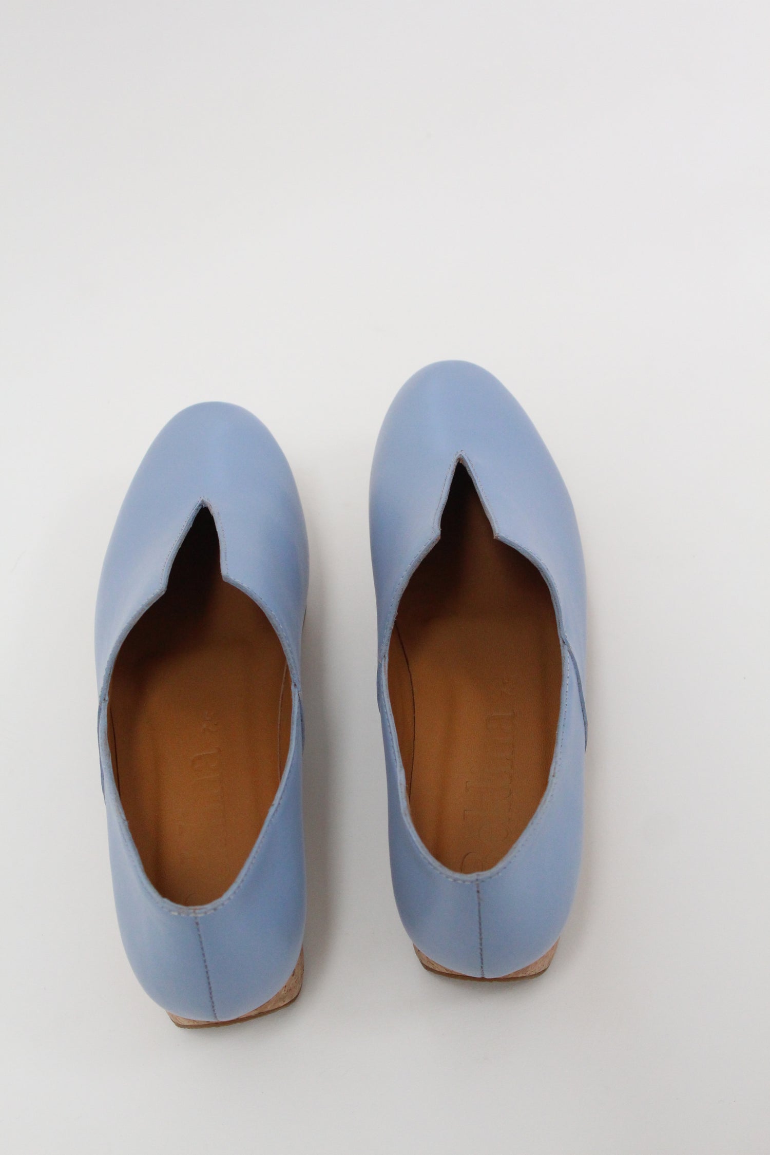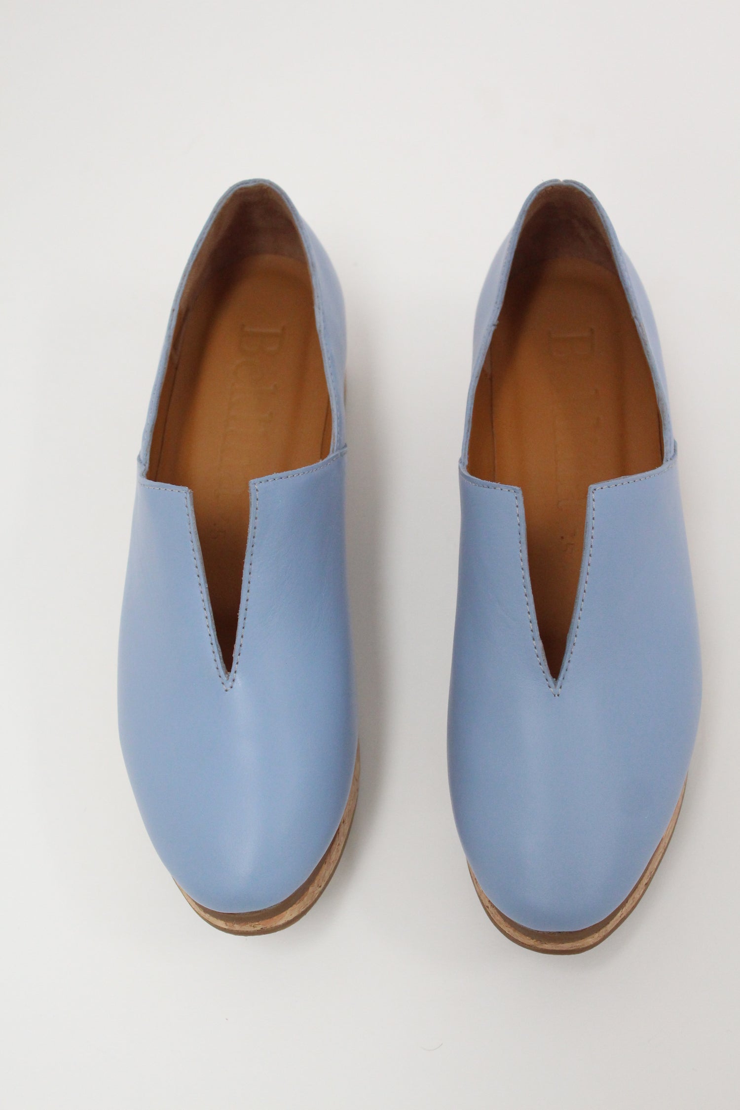 Leather slip on shoe, split cork 1 1/4" platform heel, all leather upper, v-detail, walking shoe. A best selling shoe in the shop. These are hard to keep in stock.