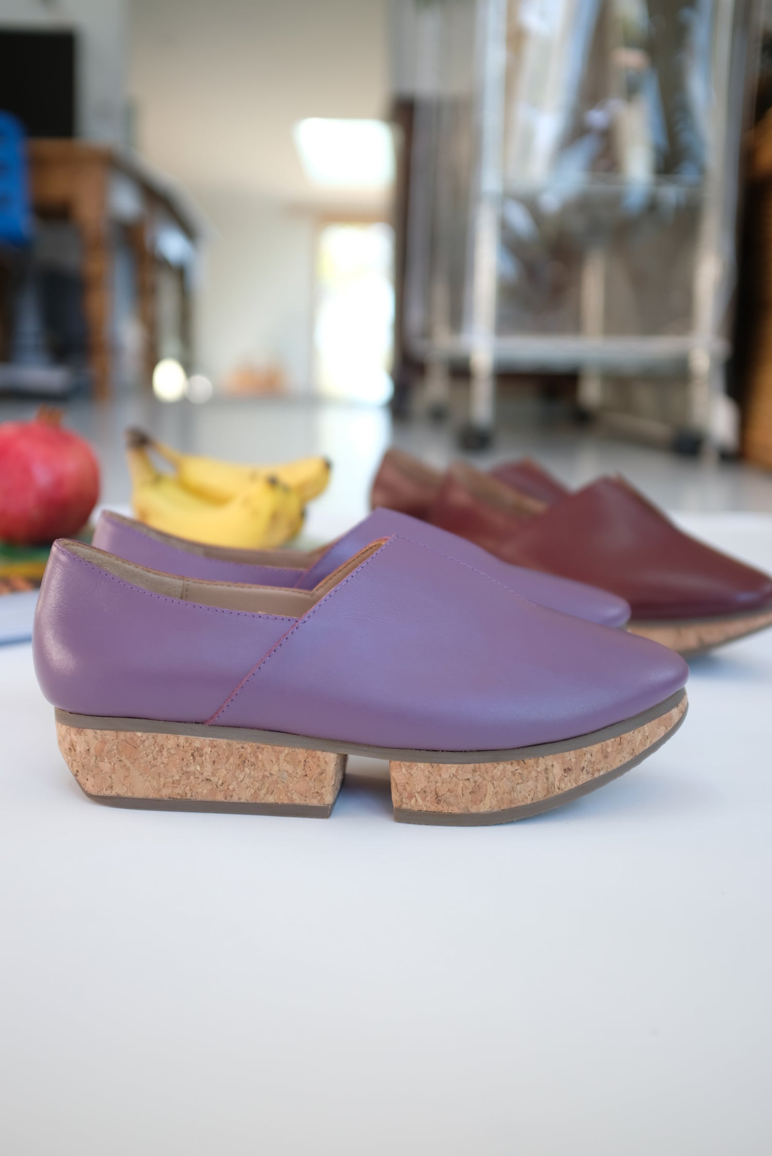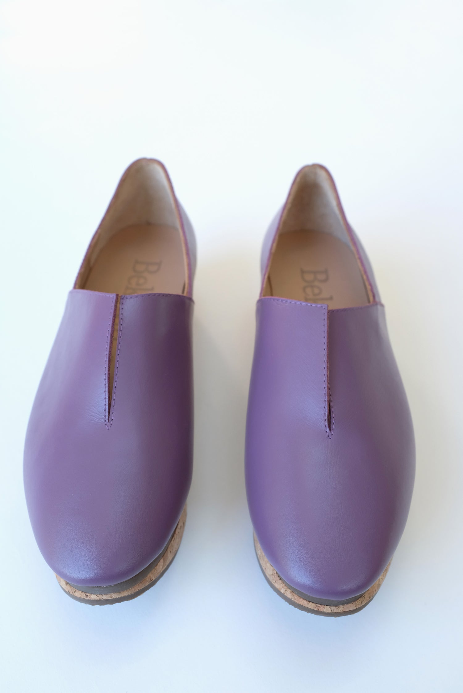 Leather slip on shoe, split cork 1 1/4" platform heel, all leather upper, v-detail, walking shoe. A best selling shoe in the shop. These are hard to keep in stock due to their cult following :)