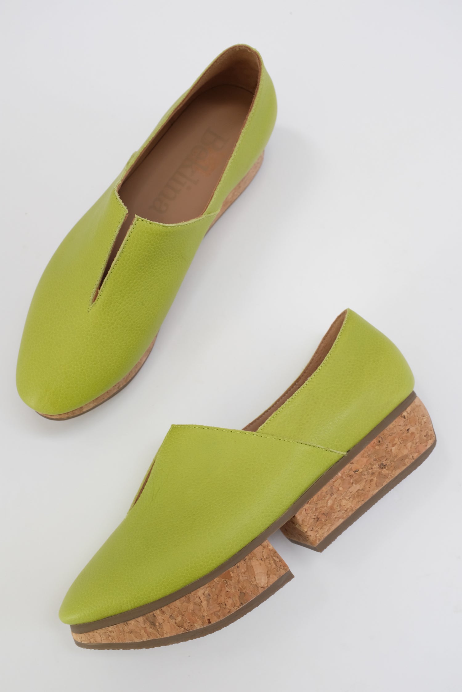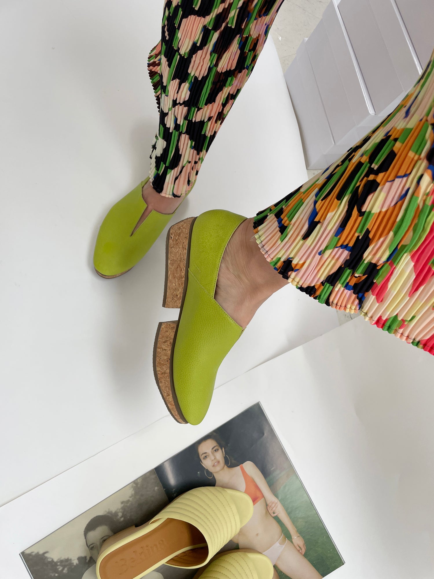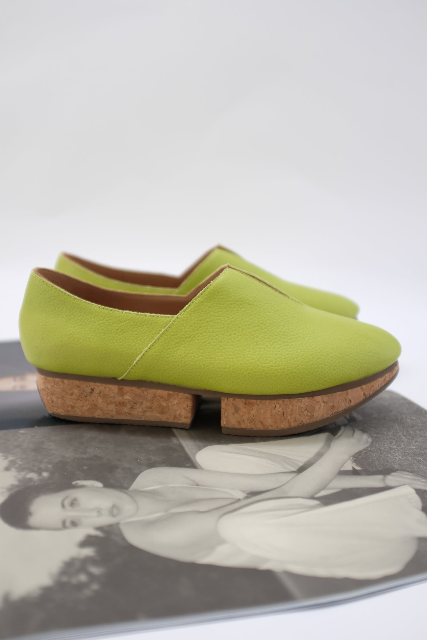 Leather slip on shoe, split cork 1 1/4" platform heel, all leather upper, v-detail, walking shoe. A best selling shoe in the shop. These are hard to keep in stock due to their cult following :)