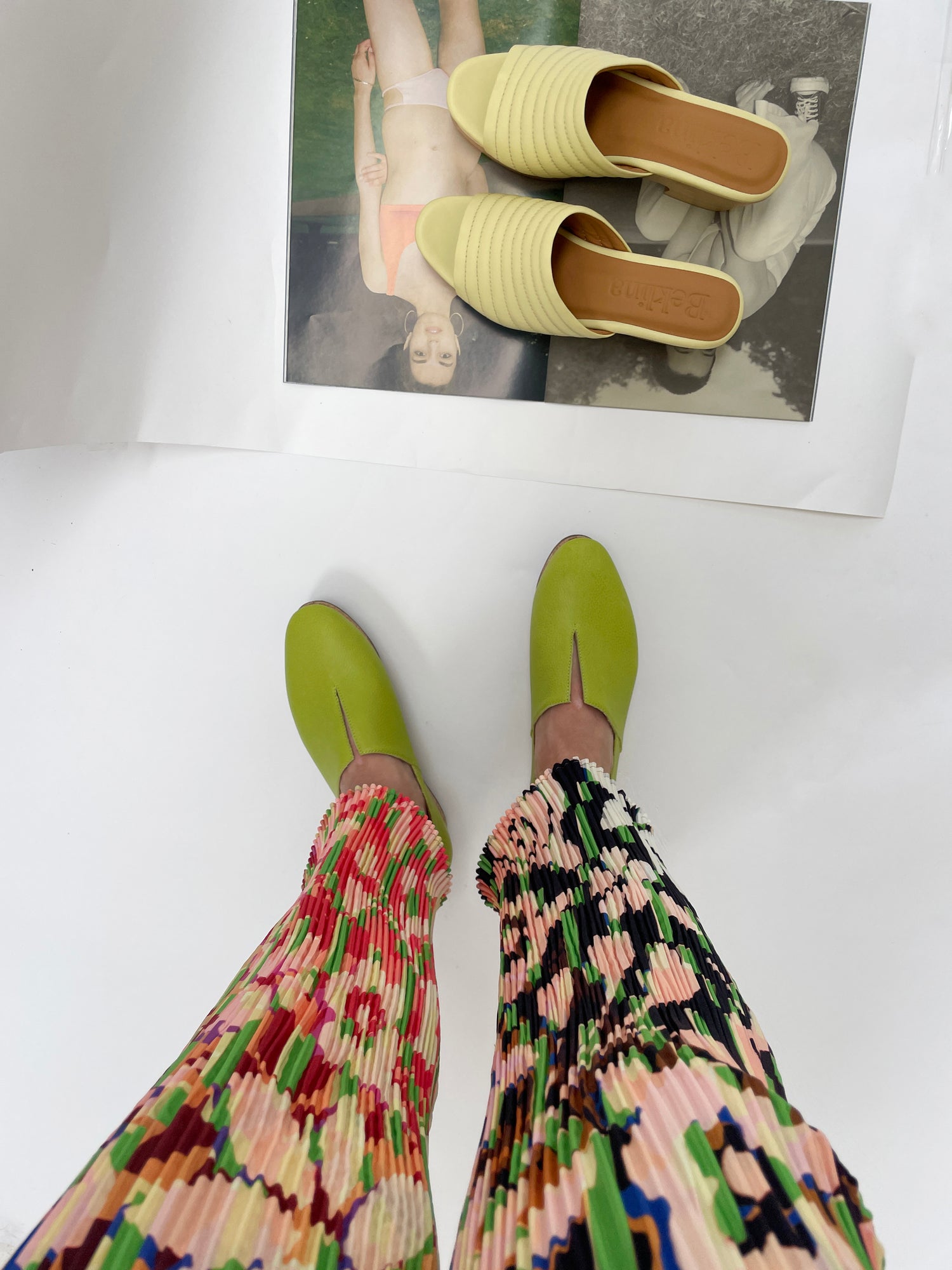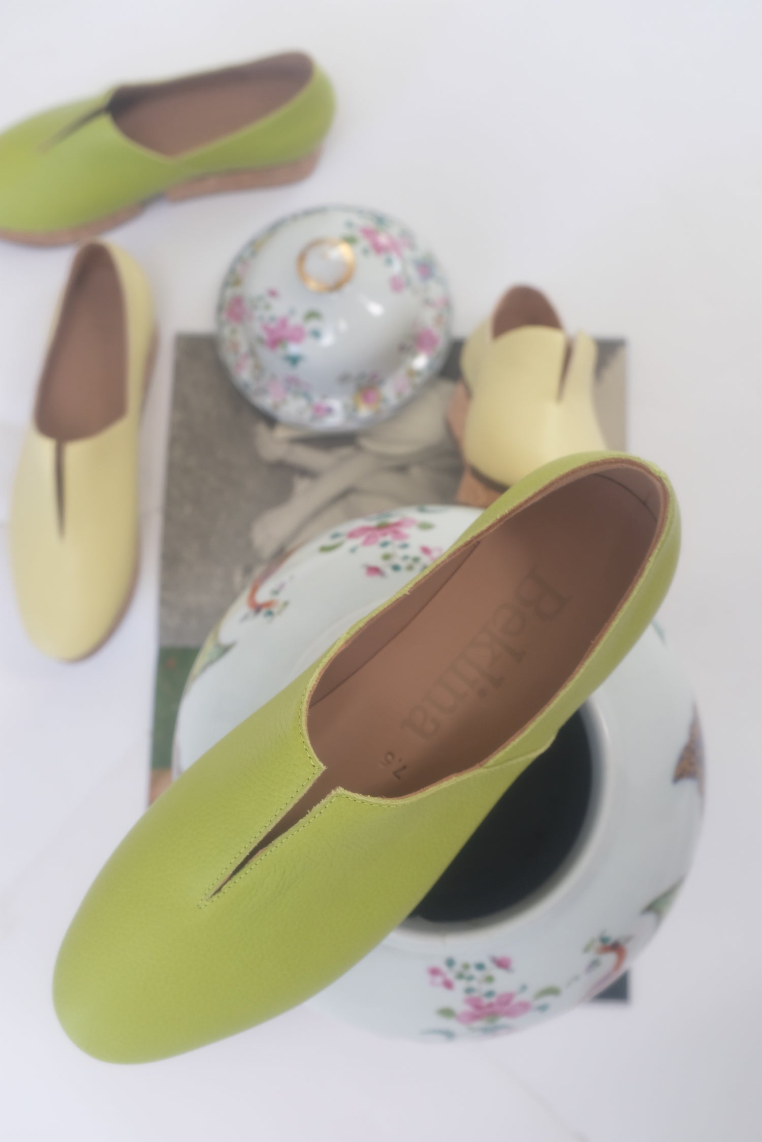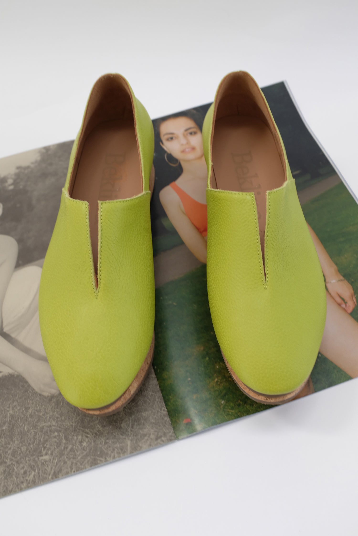 Leather slip on shoe, split cork 1 1/4" platform heel, all leather upper, v-detail, walking shoe. A best selling shoe in the shop. These are hard to keep in stock due to their cult following :)