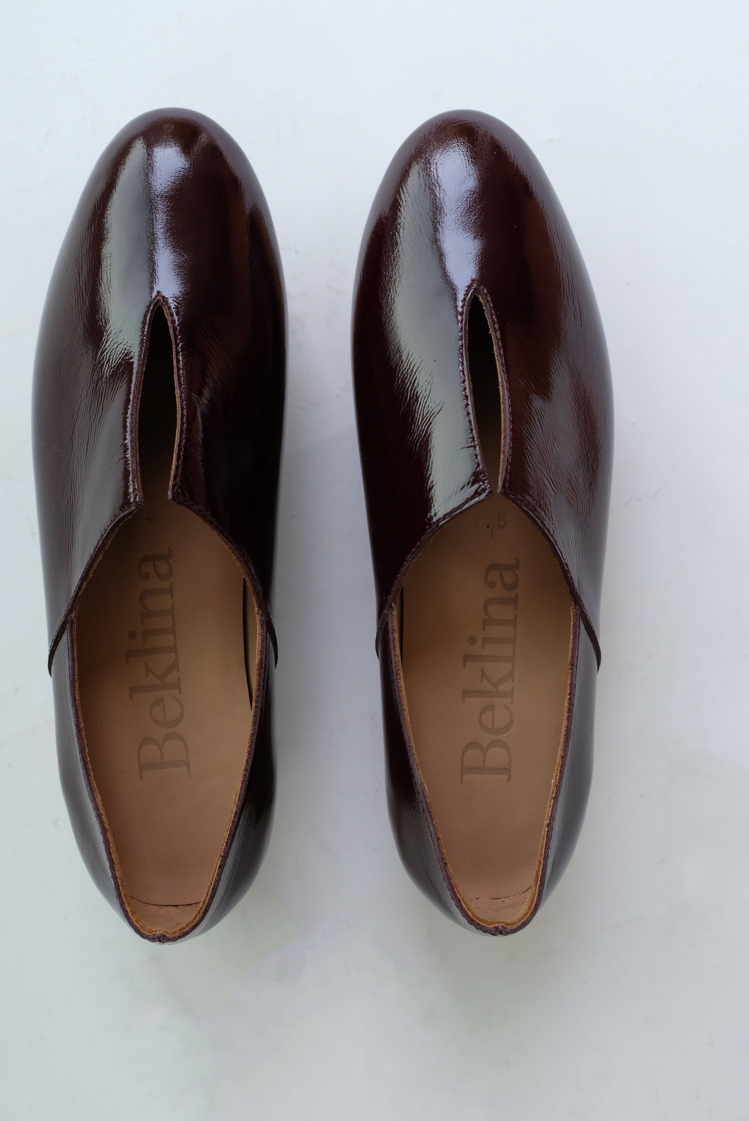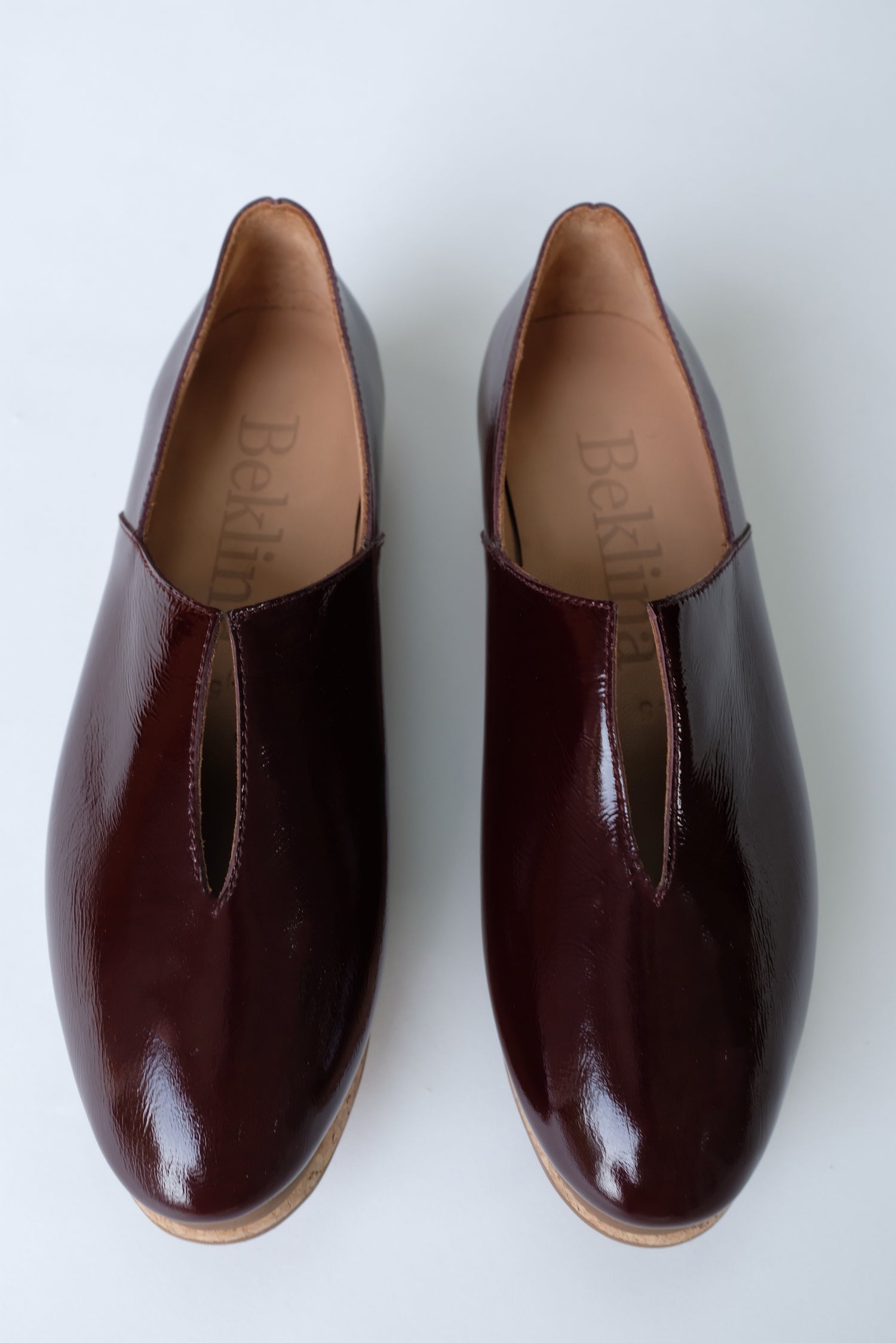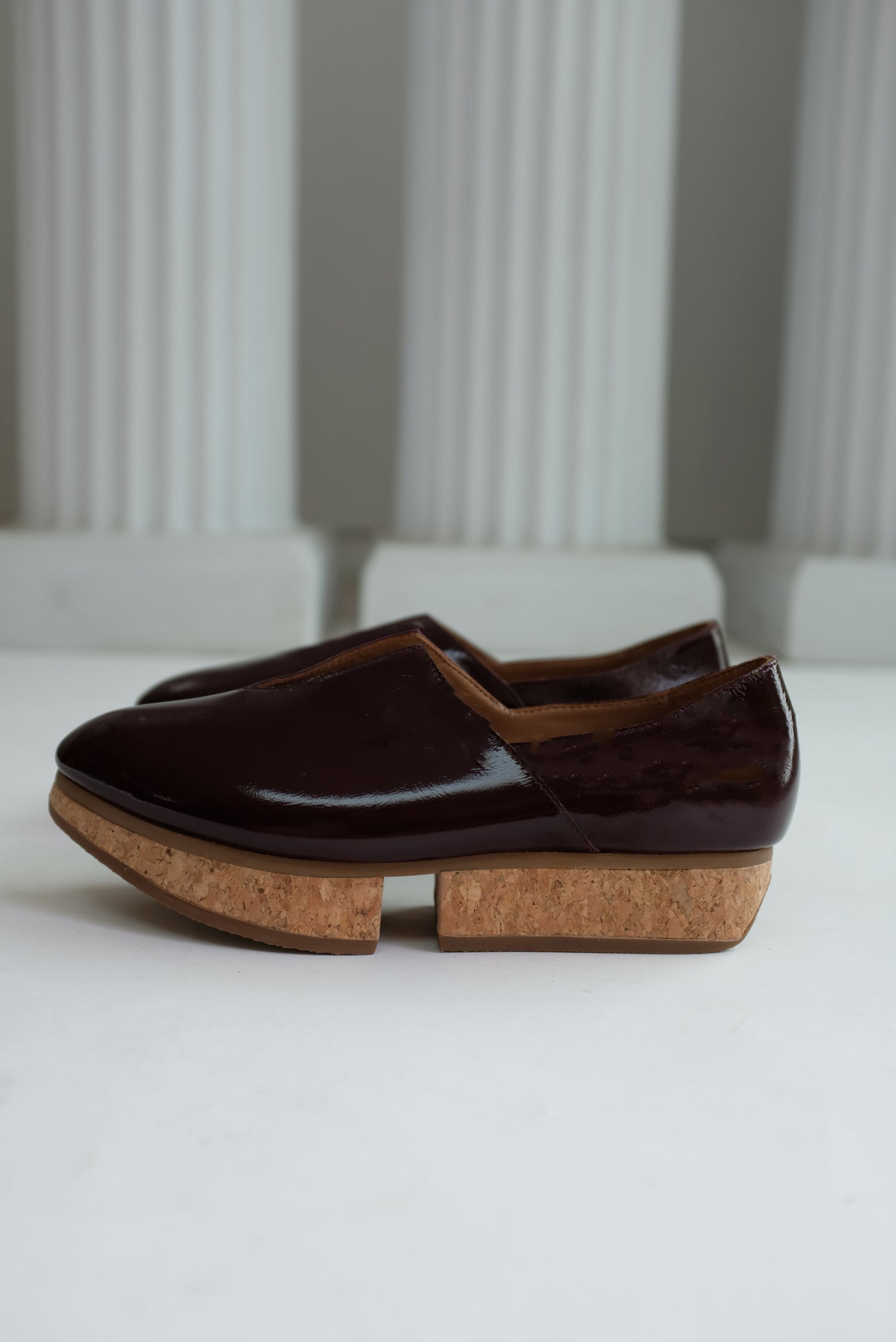 Leather slip on shoe, split cork 1 1/4" platform heel, all leather upper, v-detail, light weight patent, walking shoe. A best selling shoe in the shop. These are hard to keep in stock.