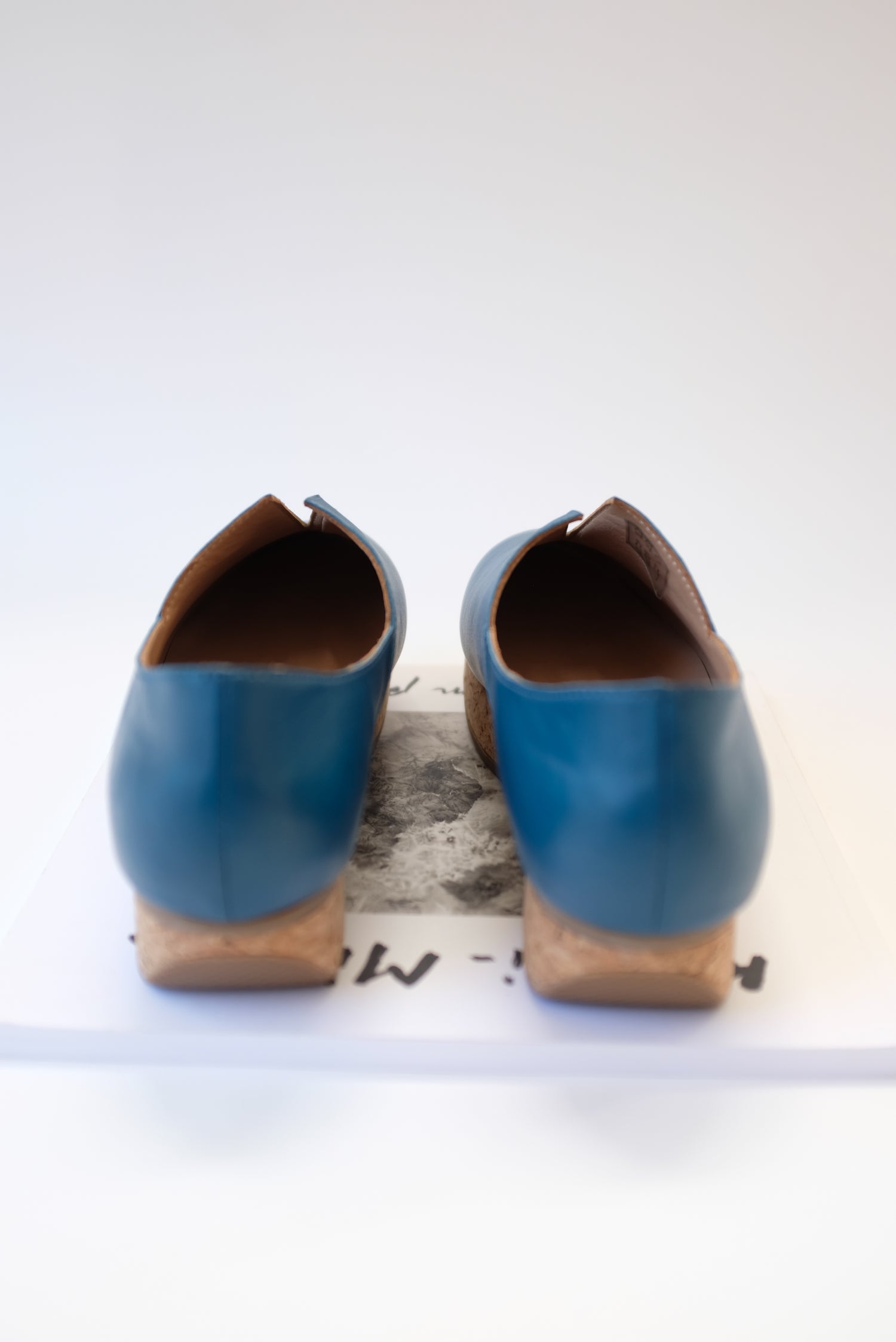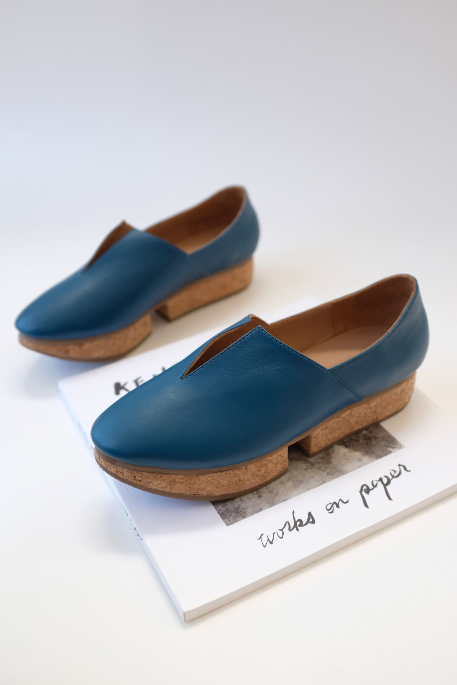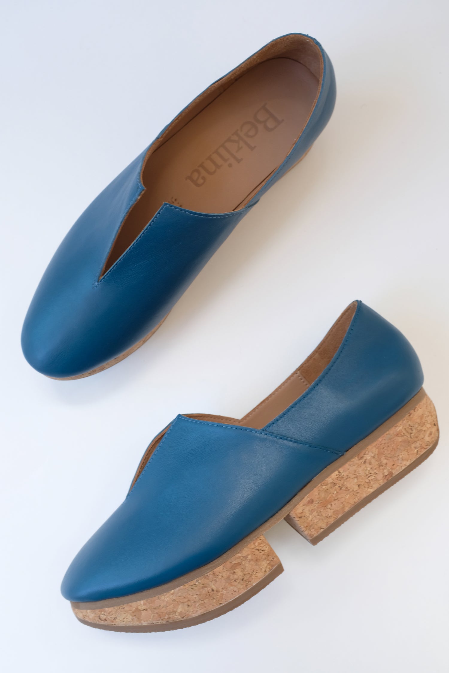 Leather slip on shoe, split cork 1 1/4" platform heel, all leather upper, v-detail, walking shoe. A best selling shoe in the shop. These are hard to keep in stock due to their cult following :)