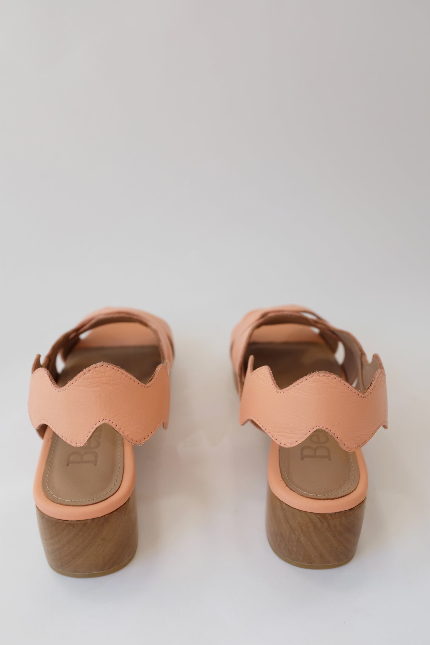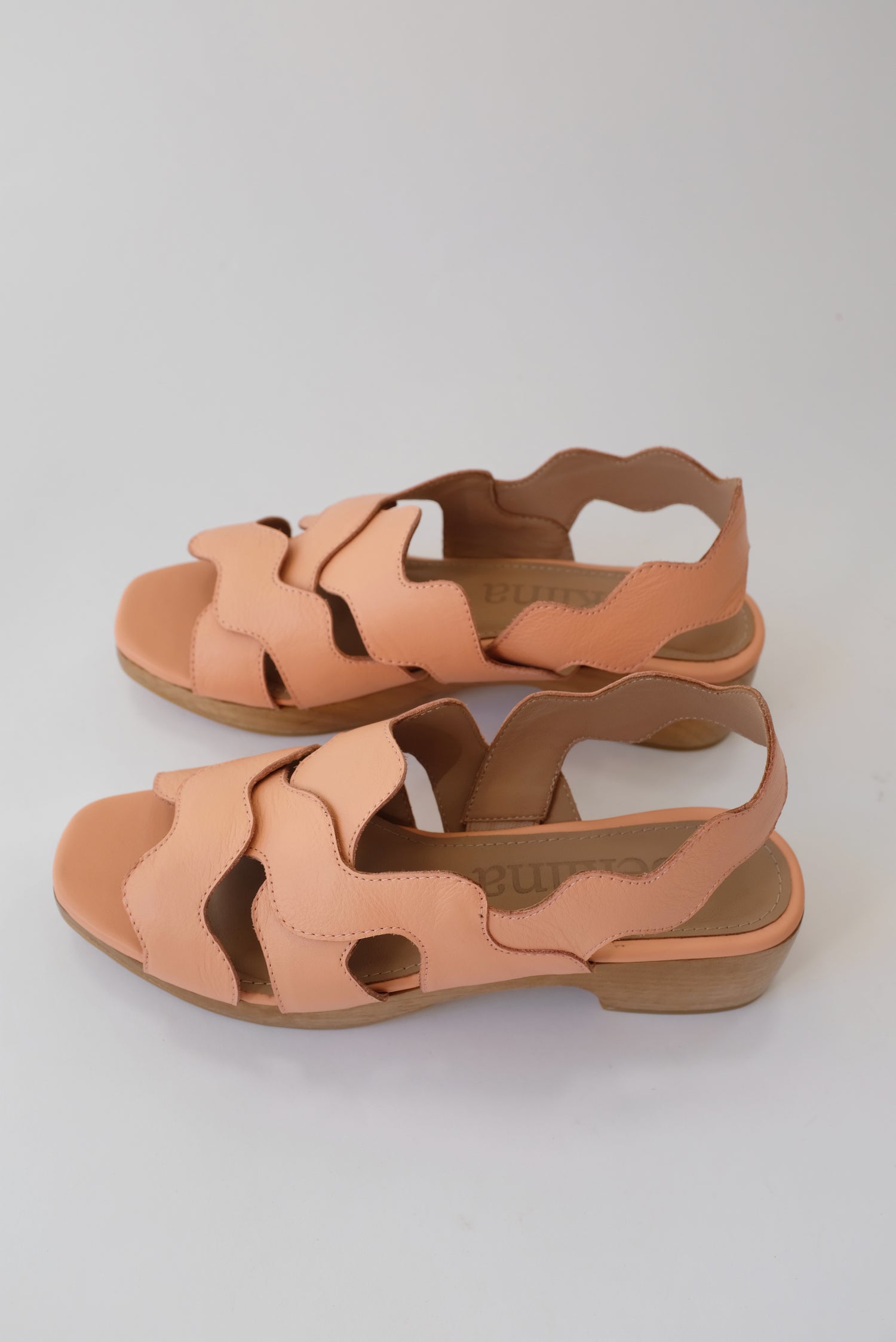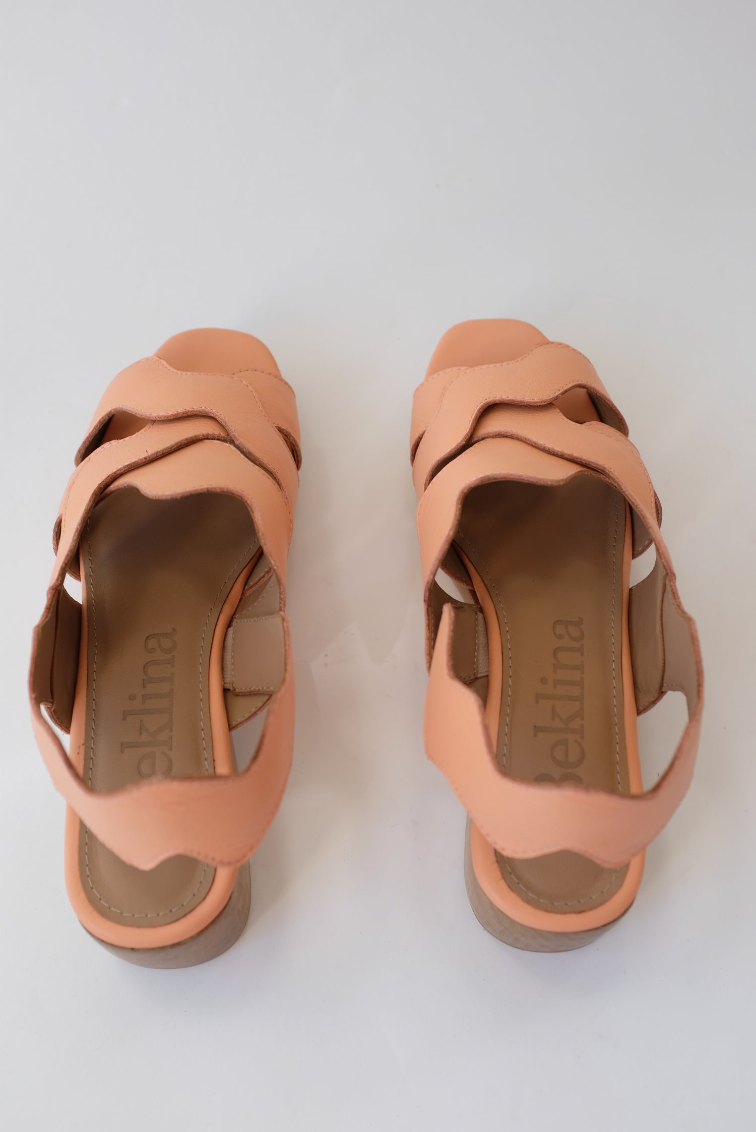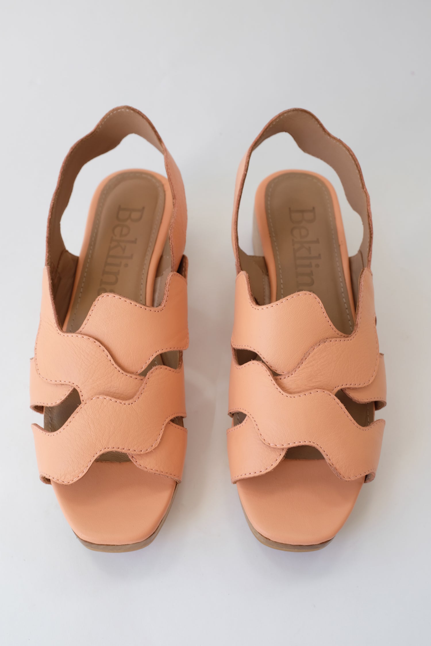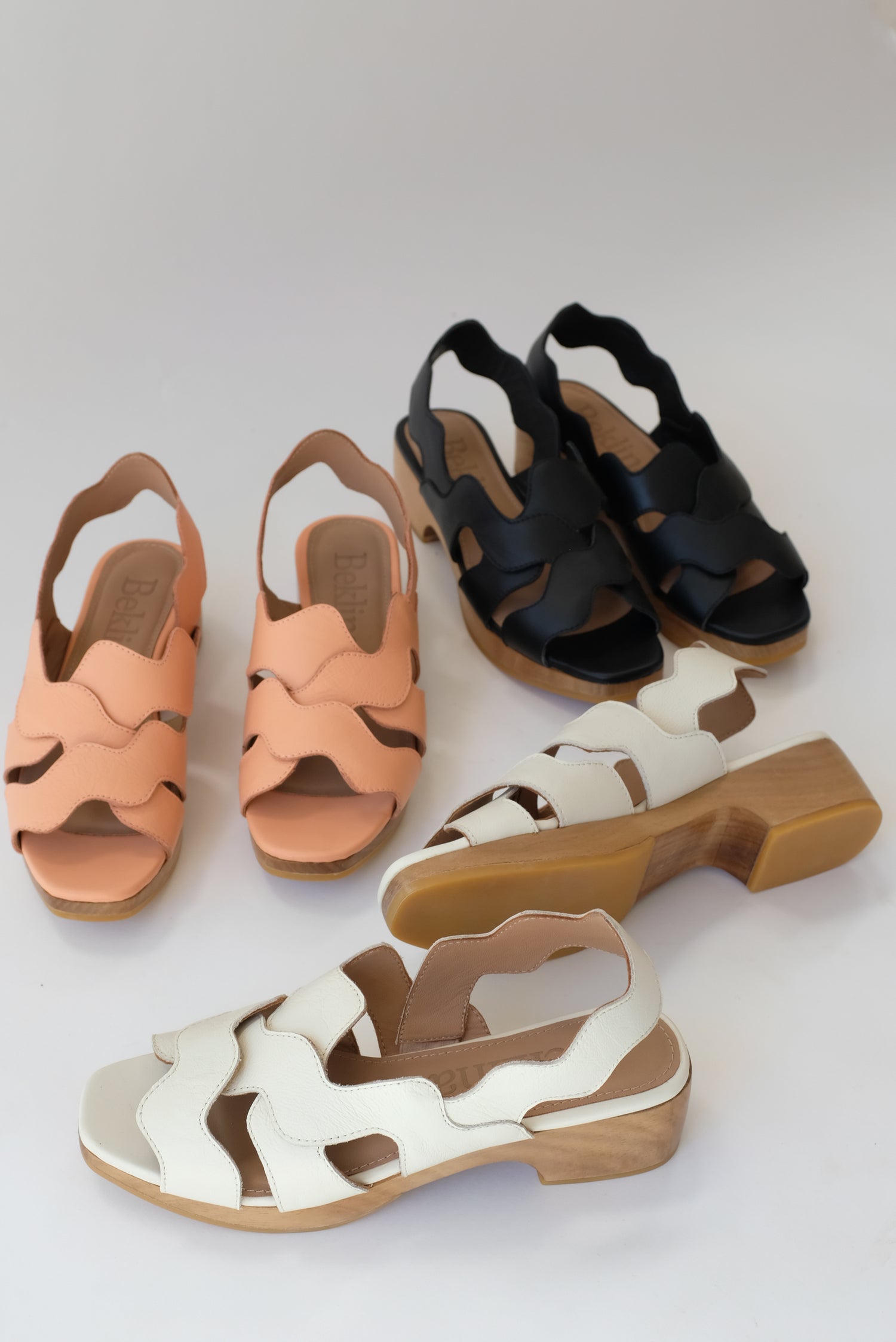 Sling back clog sandal, iconic hand cut and layered wiggle leather collage, art for your feet. Soft glove leather upper, hand carved wooden platform heel.