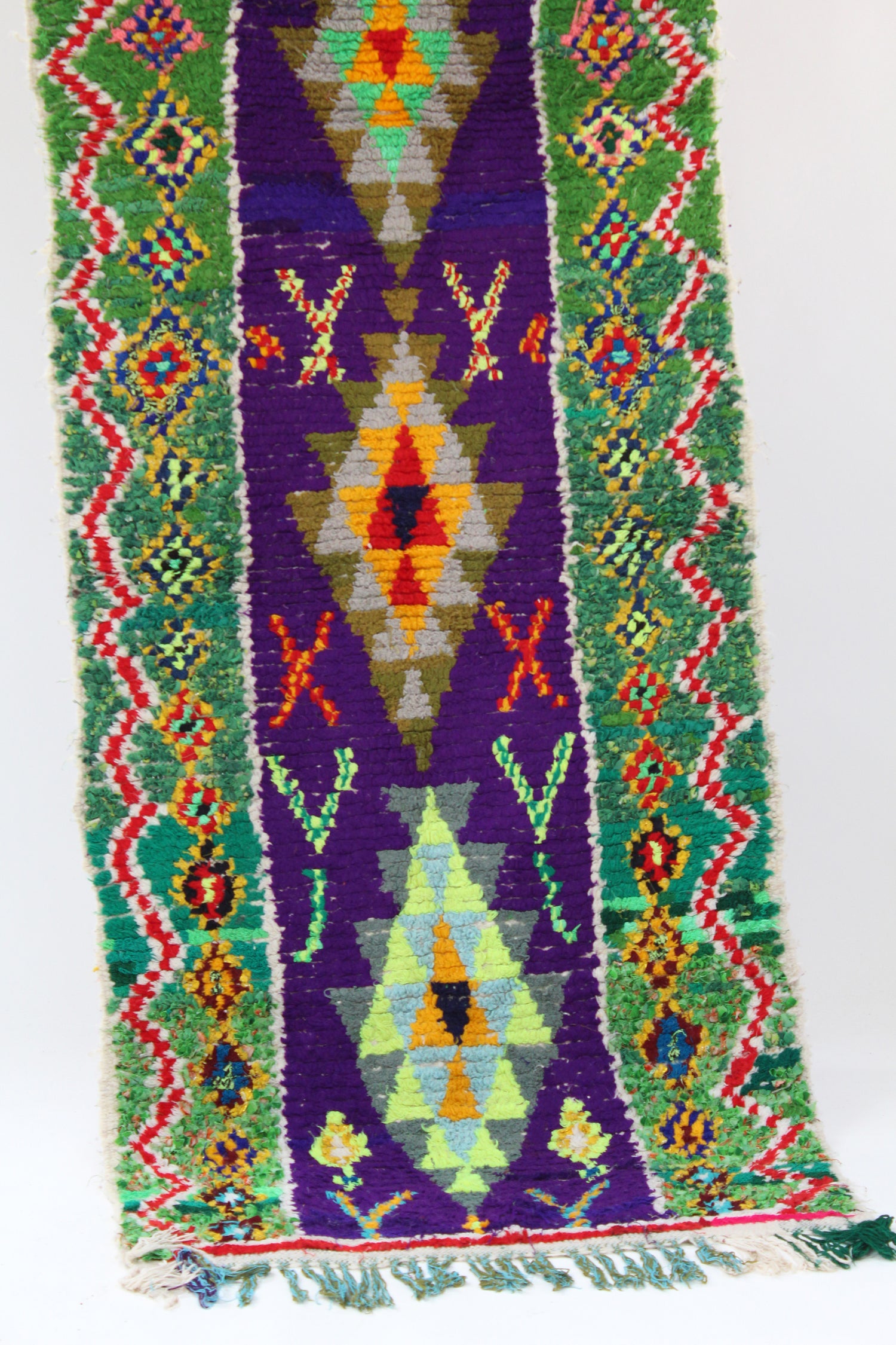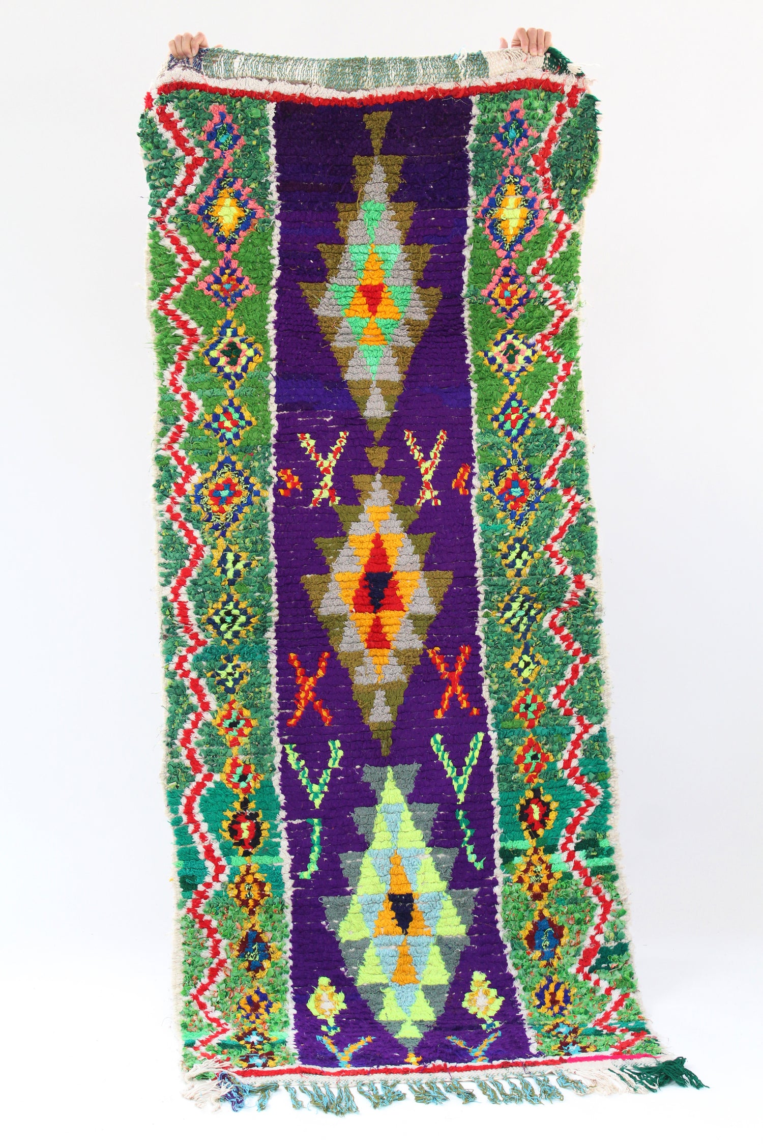 Morocco's Berber craft Boucherouite rugs. Can also be hung on walls. Authentic vintage rugs that make a colorful and warm statement. Made from sustainable materials by local artisans – including cotton, nylon and wool. Each is one of a kind.