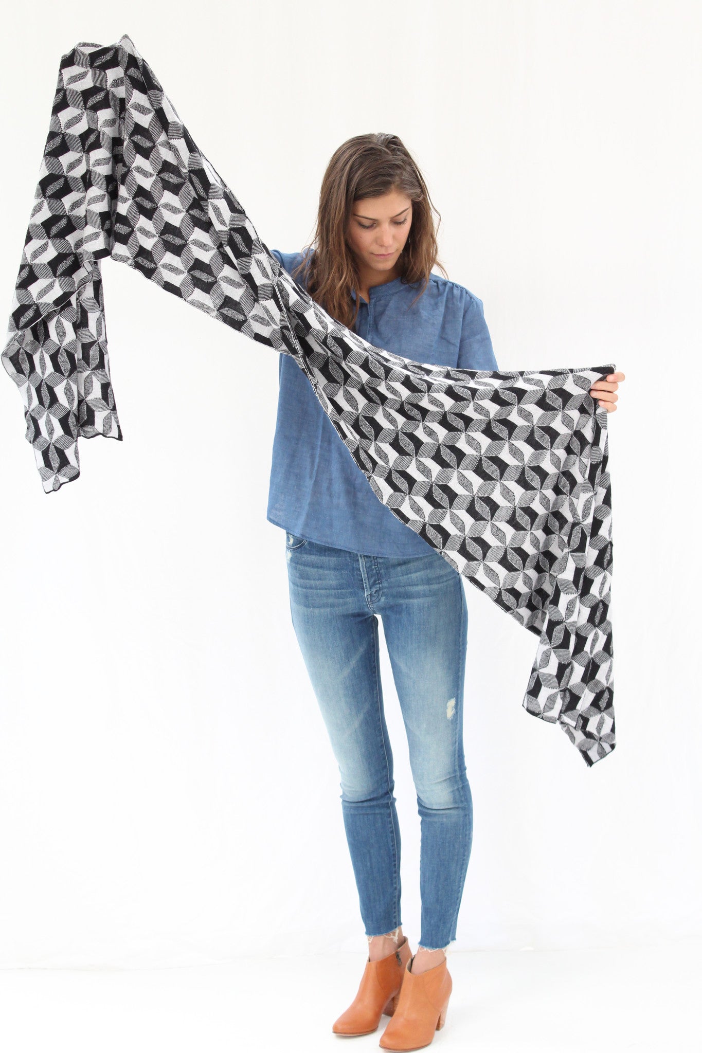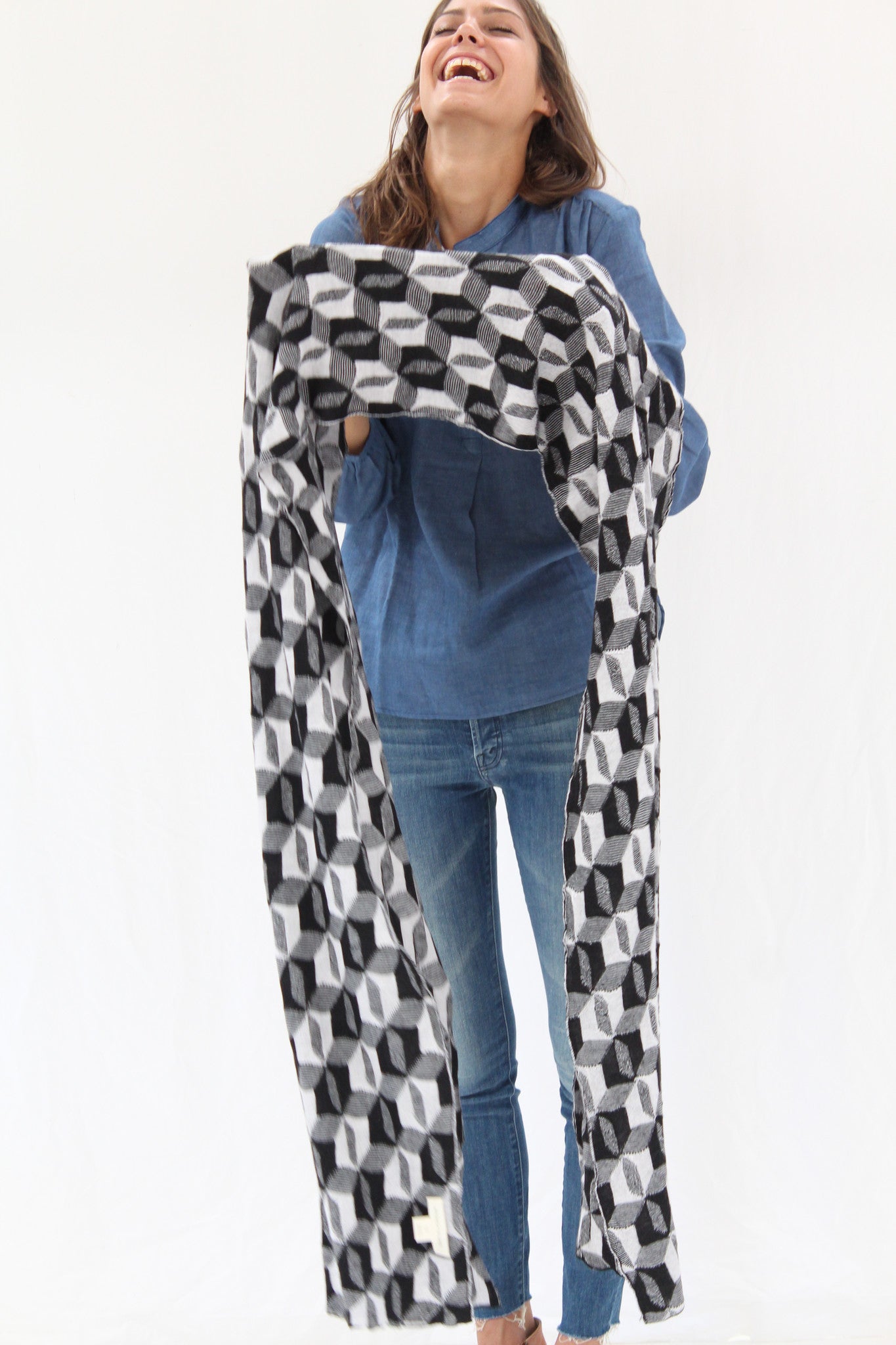 Thick, super soft scarf in Micaela Greg's signature geometric pattern. 100% wool. Hand wash, dry flat. 20" x 96"