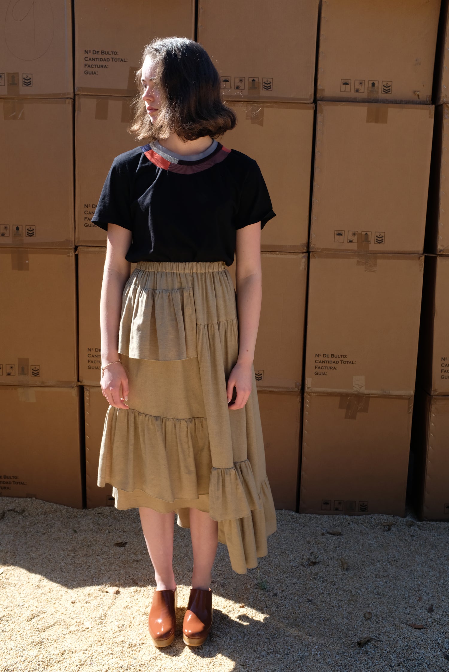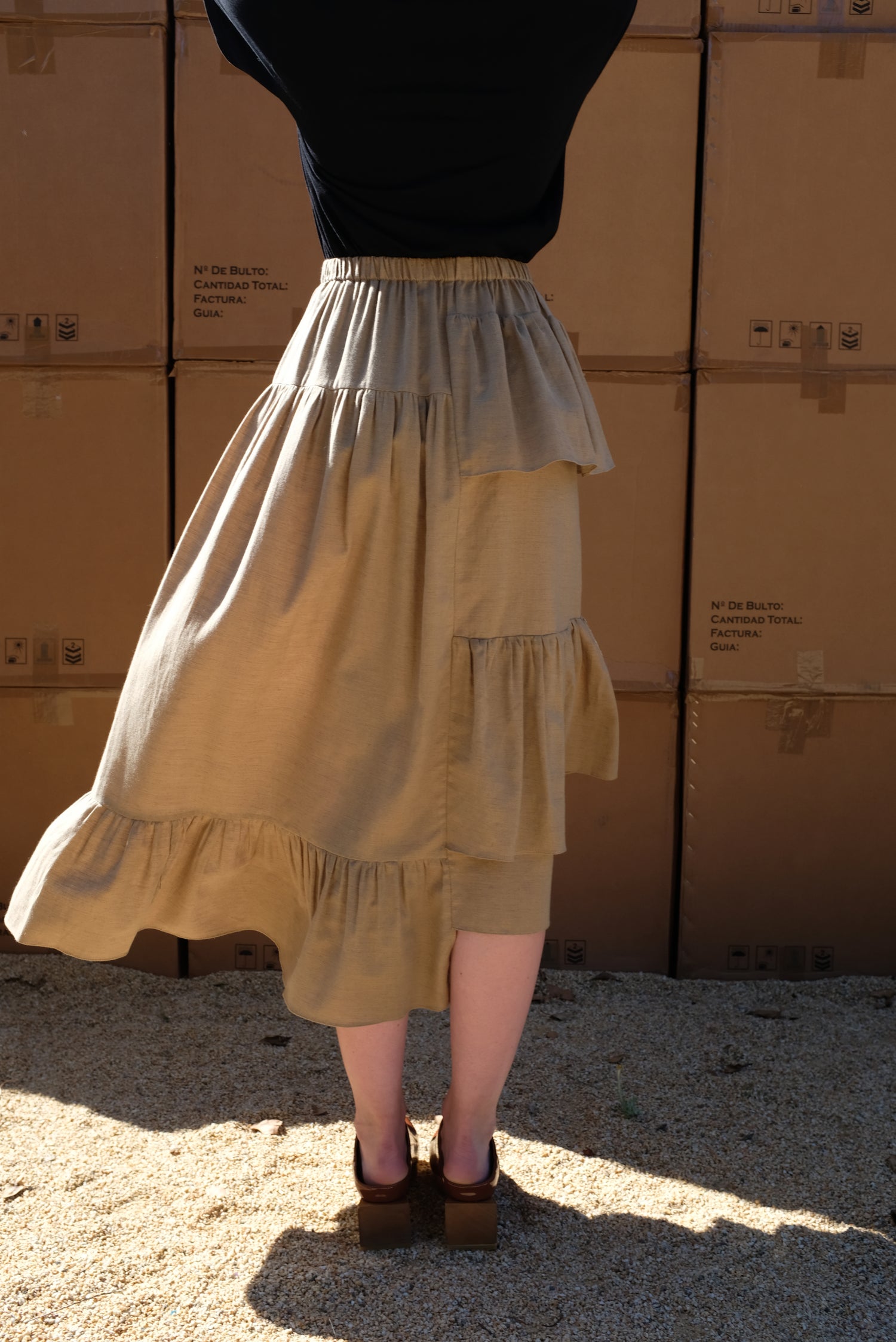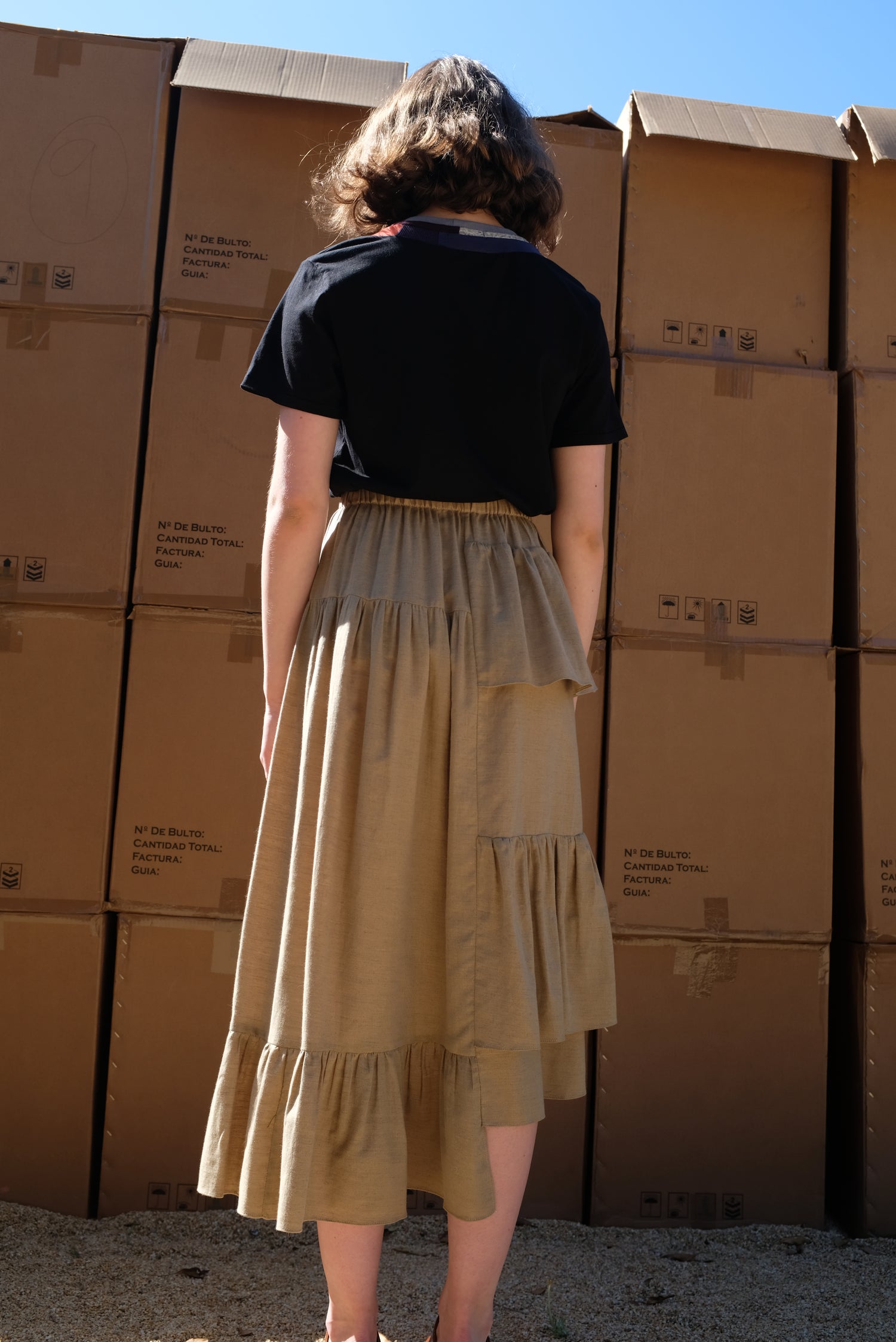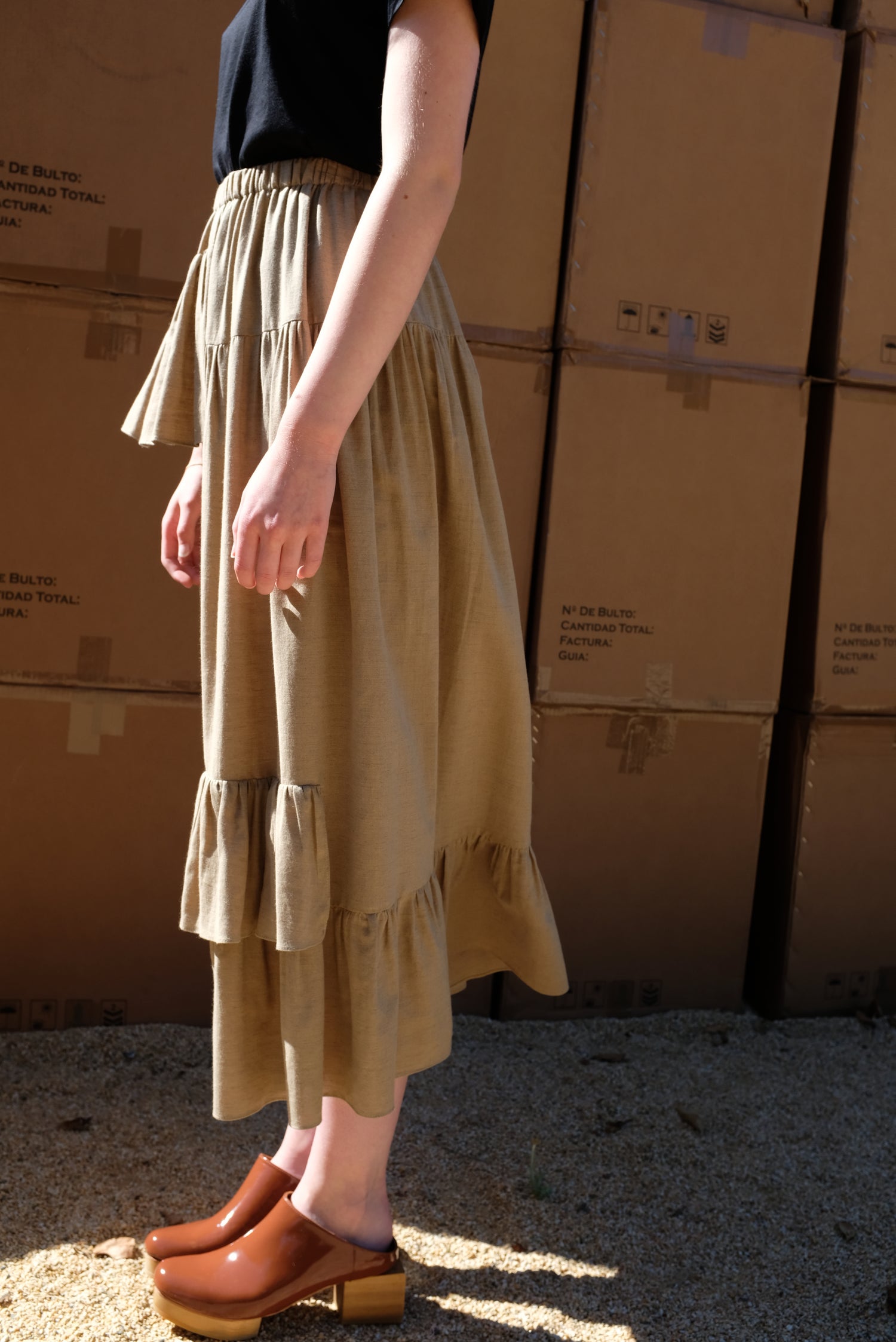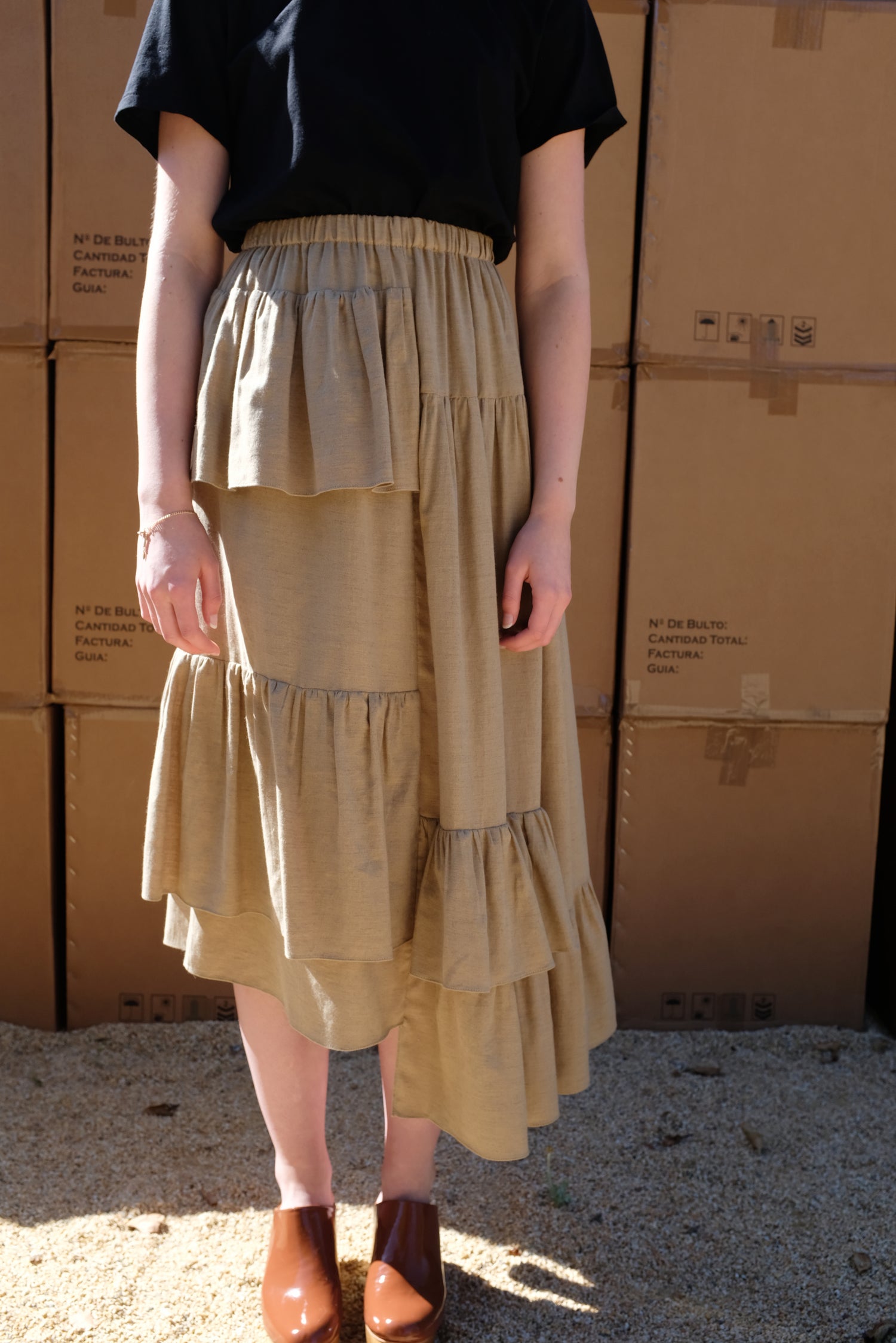 Ruffle skirt with uneven stepped hem line, and elastic waistband. 85% cotton, 15% wool. Longest length of size small is 35".