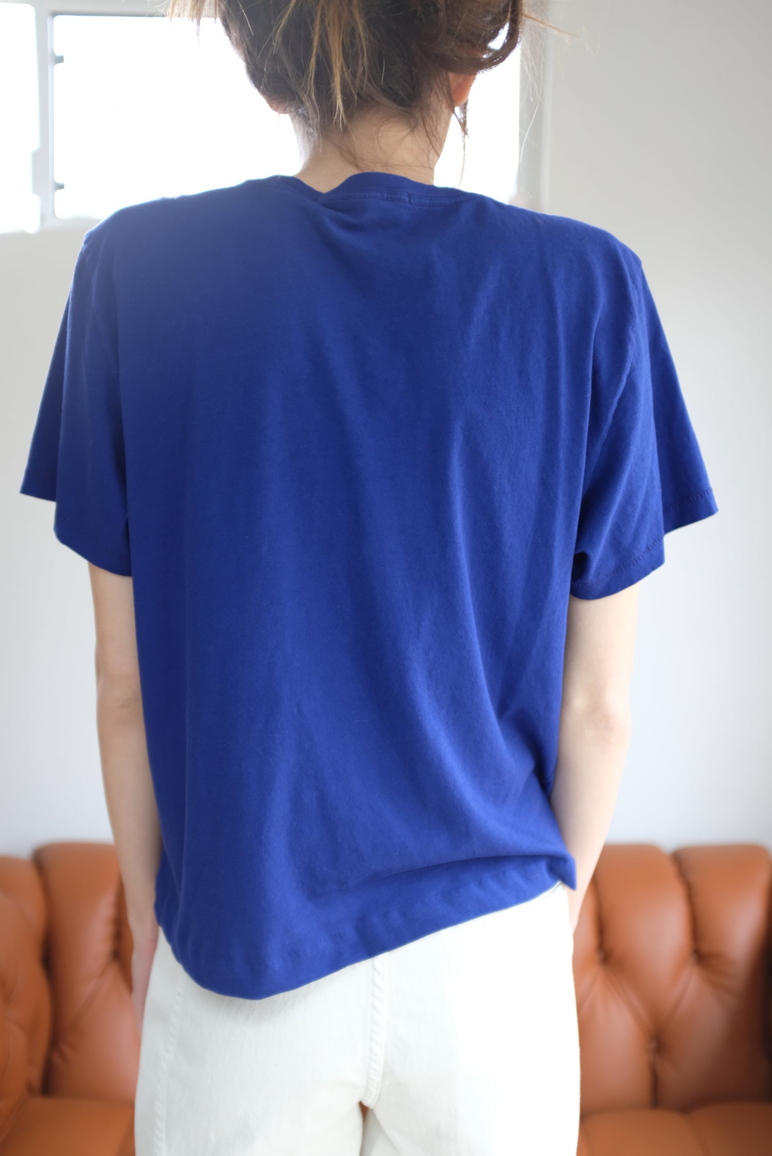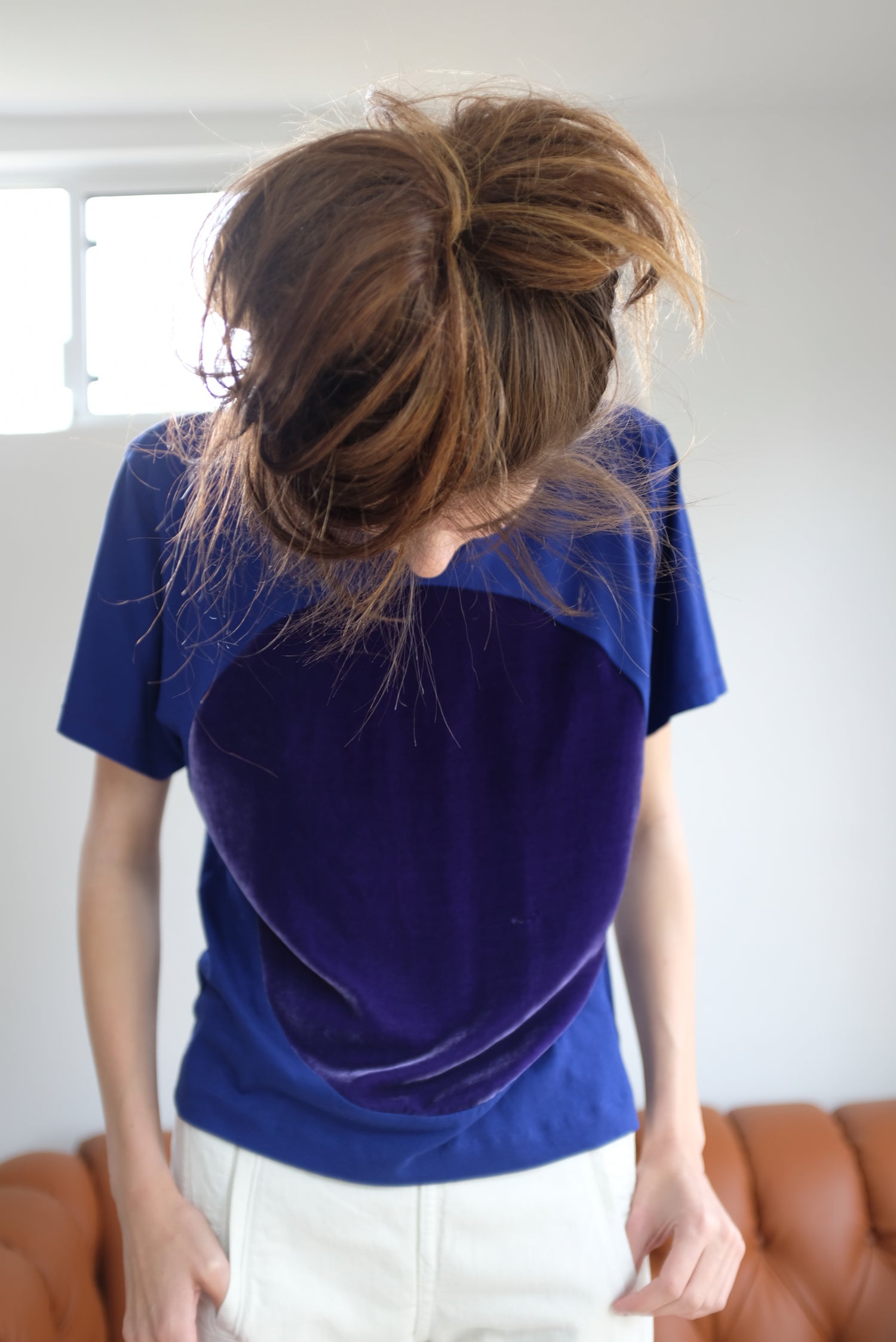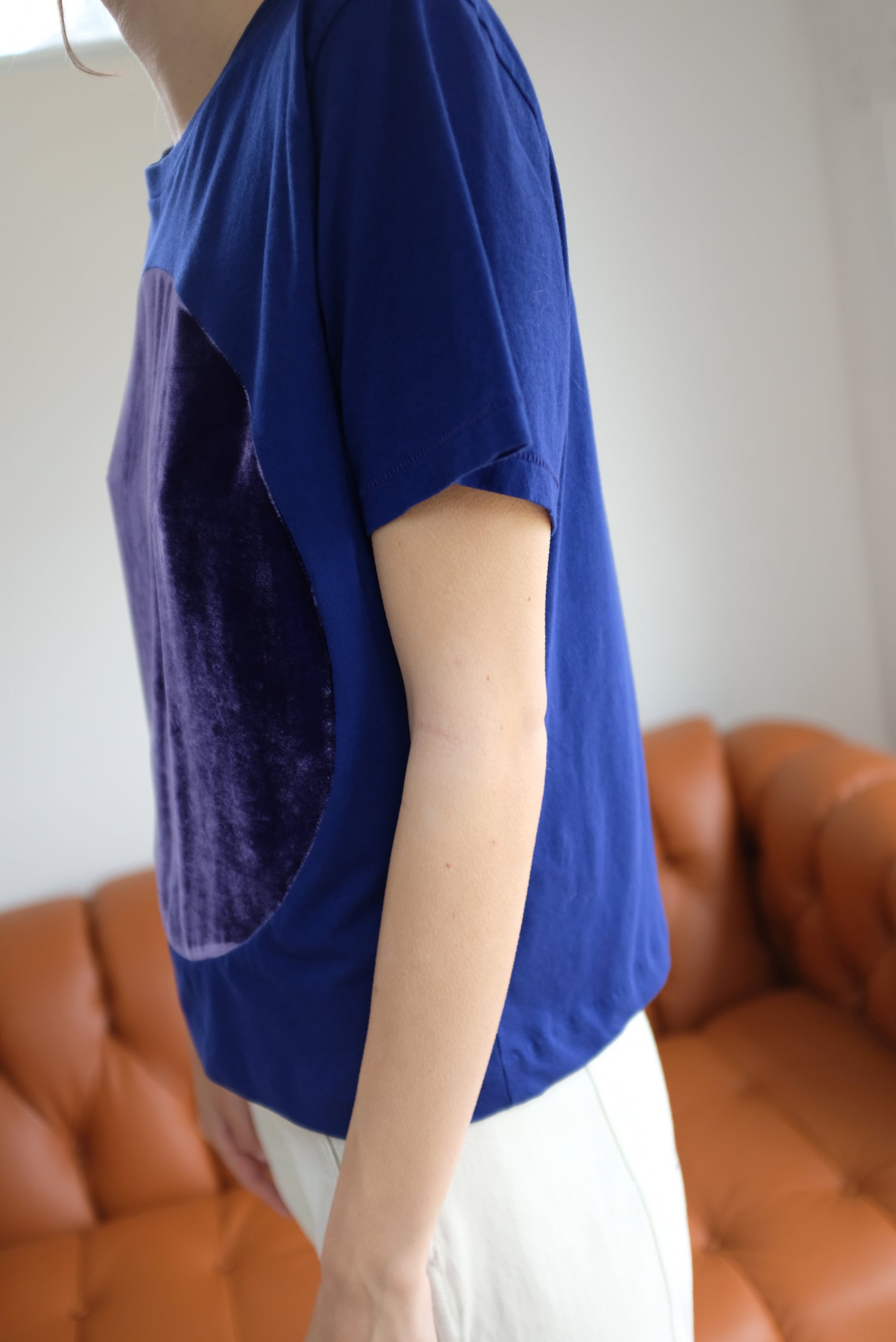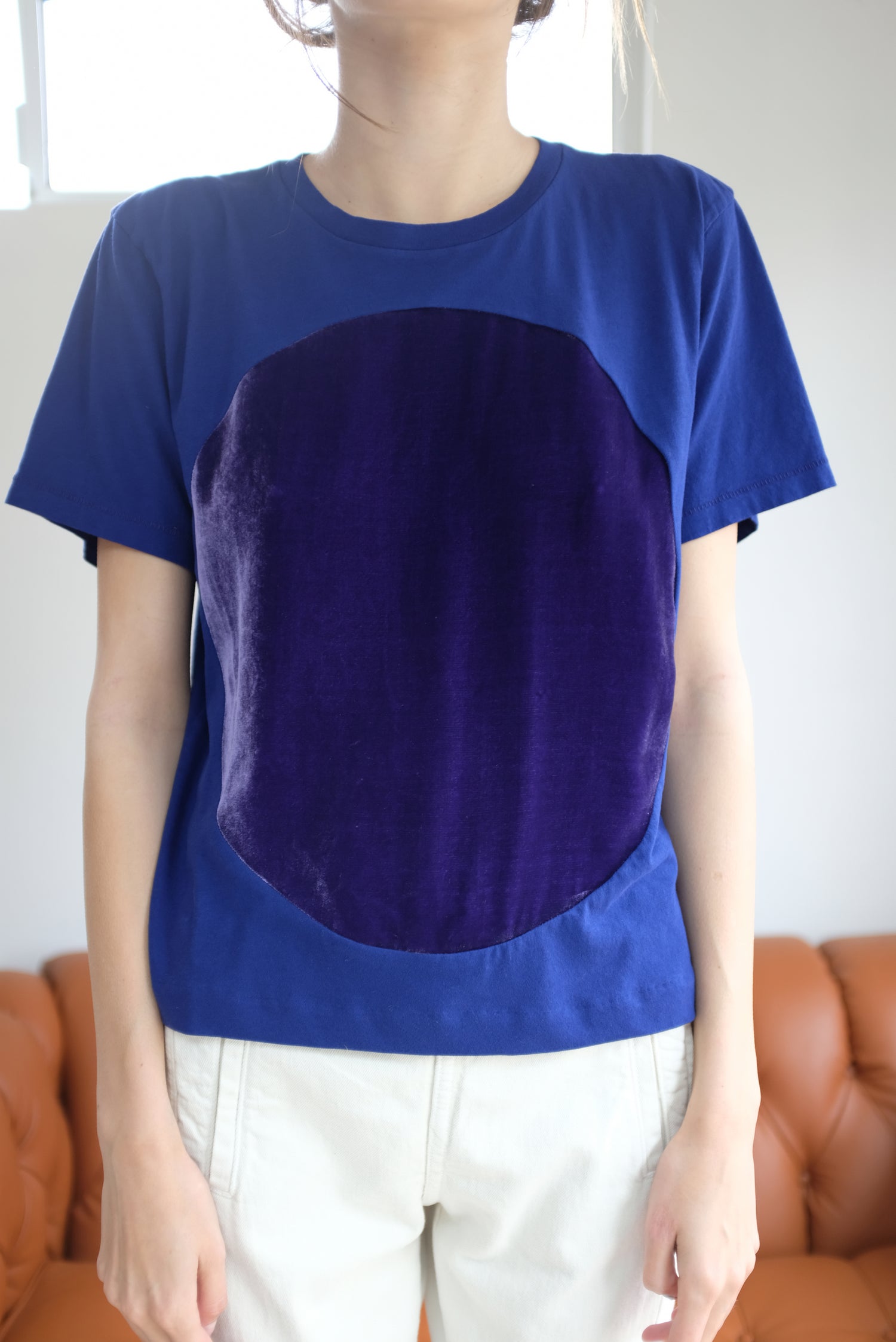 Beklina exclusive, slightly cropped version made just for us. 100% Cotton, jersey boxy fitting tee with hand sewn velvet detail. Unisex. A very dark bluish purple.