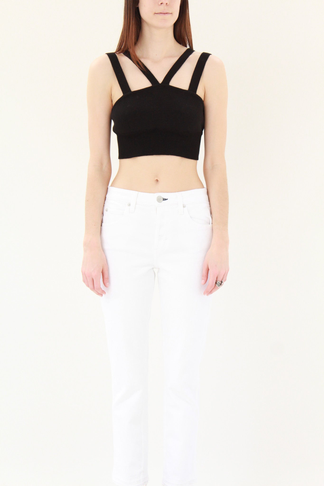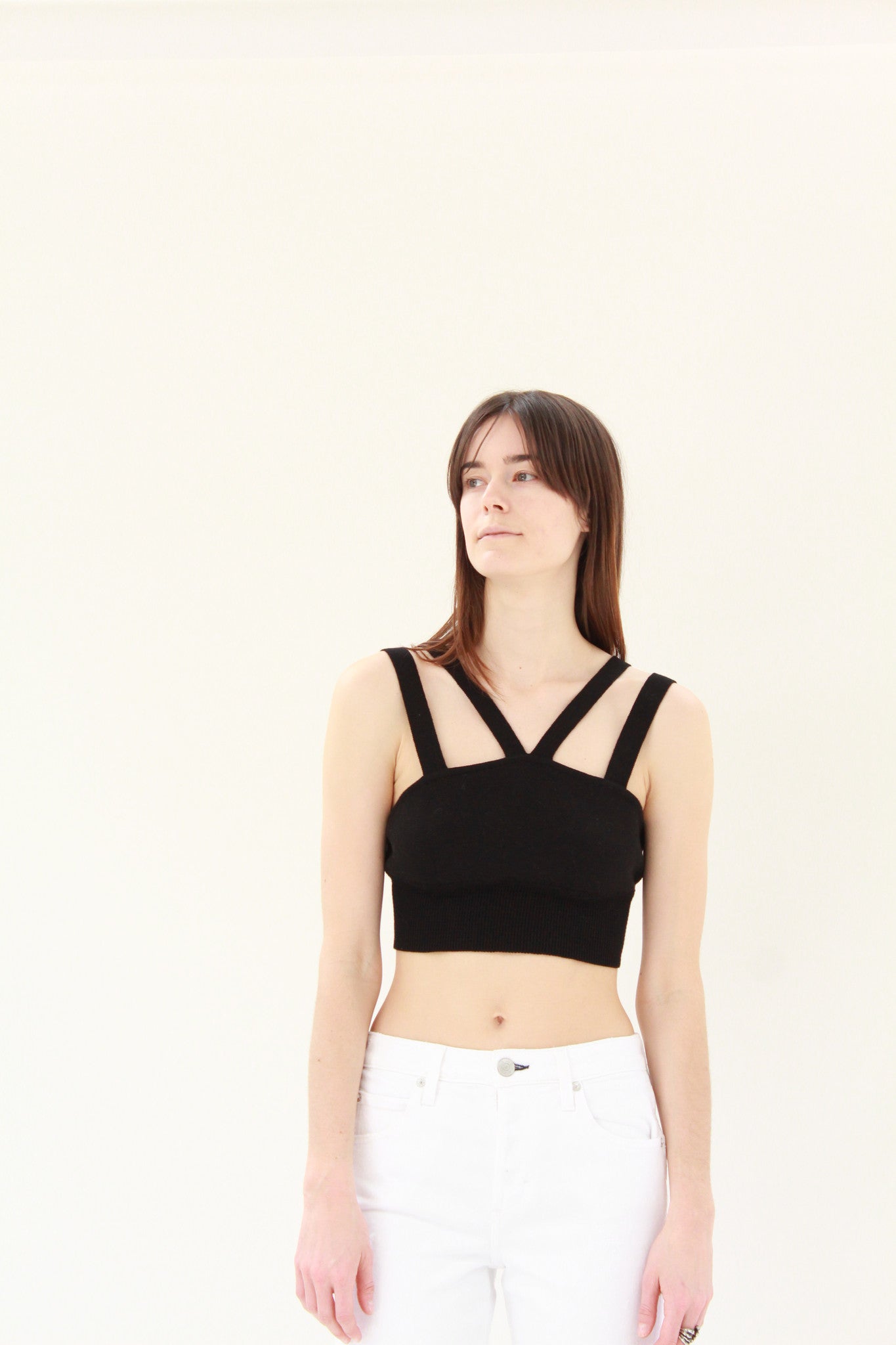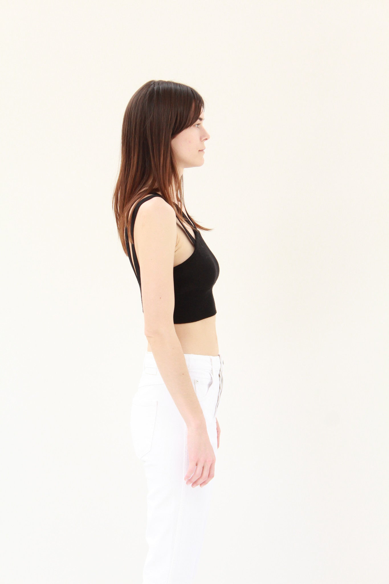 Organic cotton knit crop top with layered racer back straps. Ideal for layering under sheer tops or with your favorite high-waisted jeans. The knit is not sheer and is substantial enough to be worn on it's own. In other words, works as a top or bra.