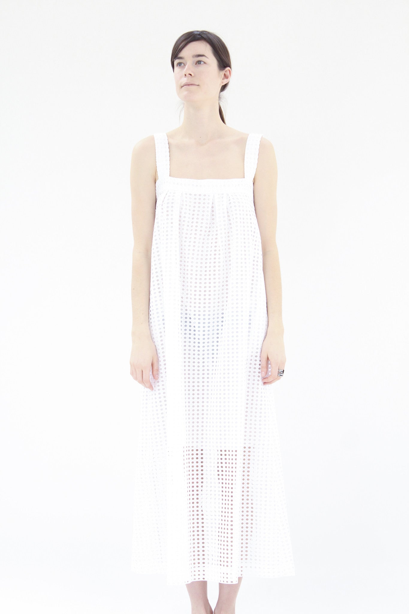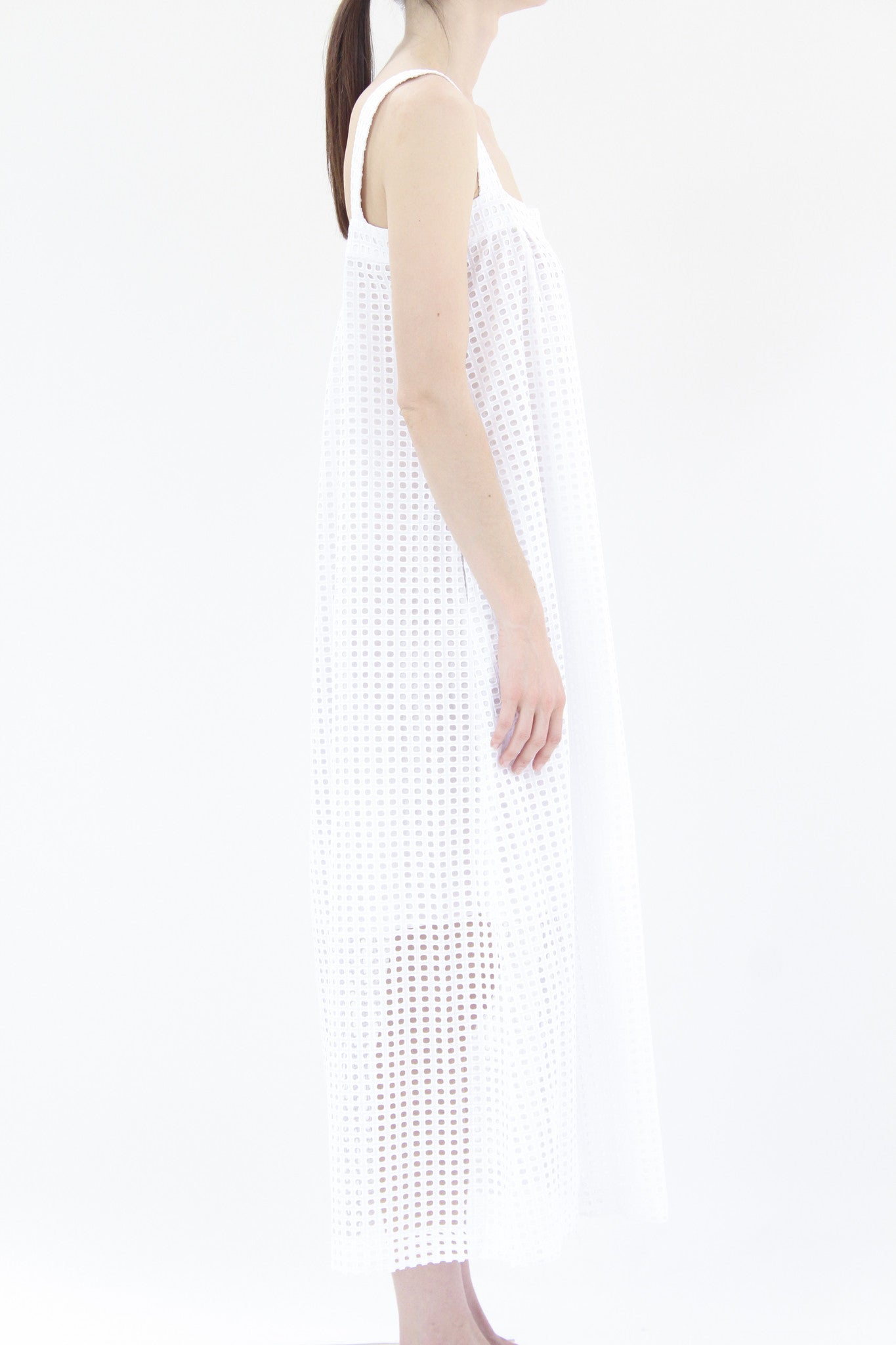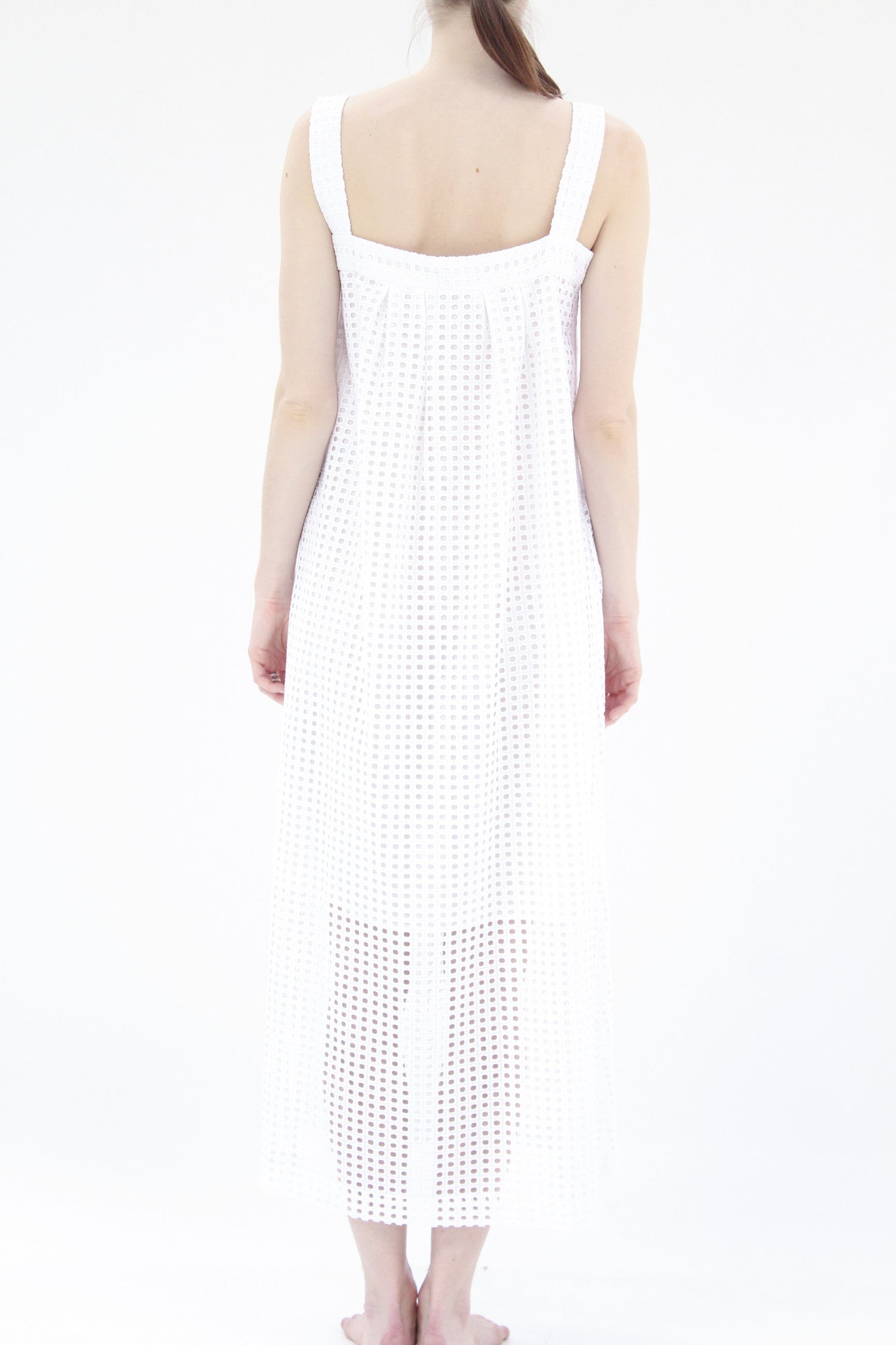 100% cotton, gorgeous white dress, lattice woven cotton, lined, easy fitting, pull over head style.