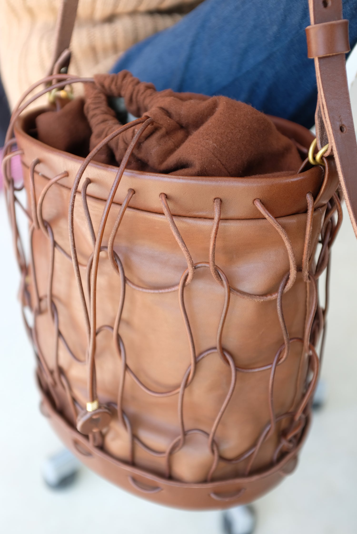 Unstructured bag with outer leather net detail and drawstring closure. Two internal pockets, structured base, fixed substantial leather handle with long adjustable strap drop. 100% Leather. Dust bag included.