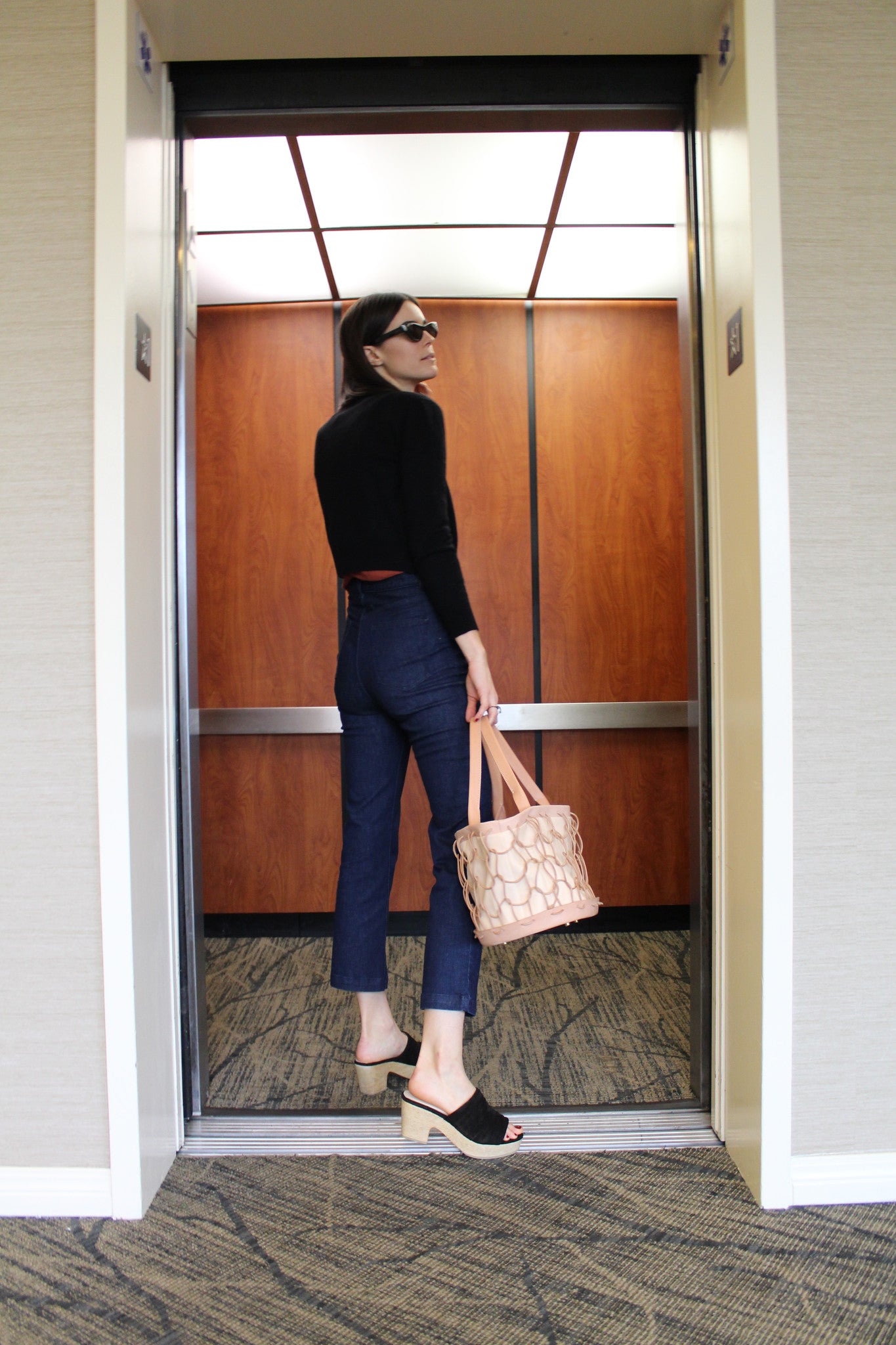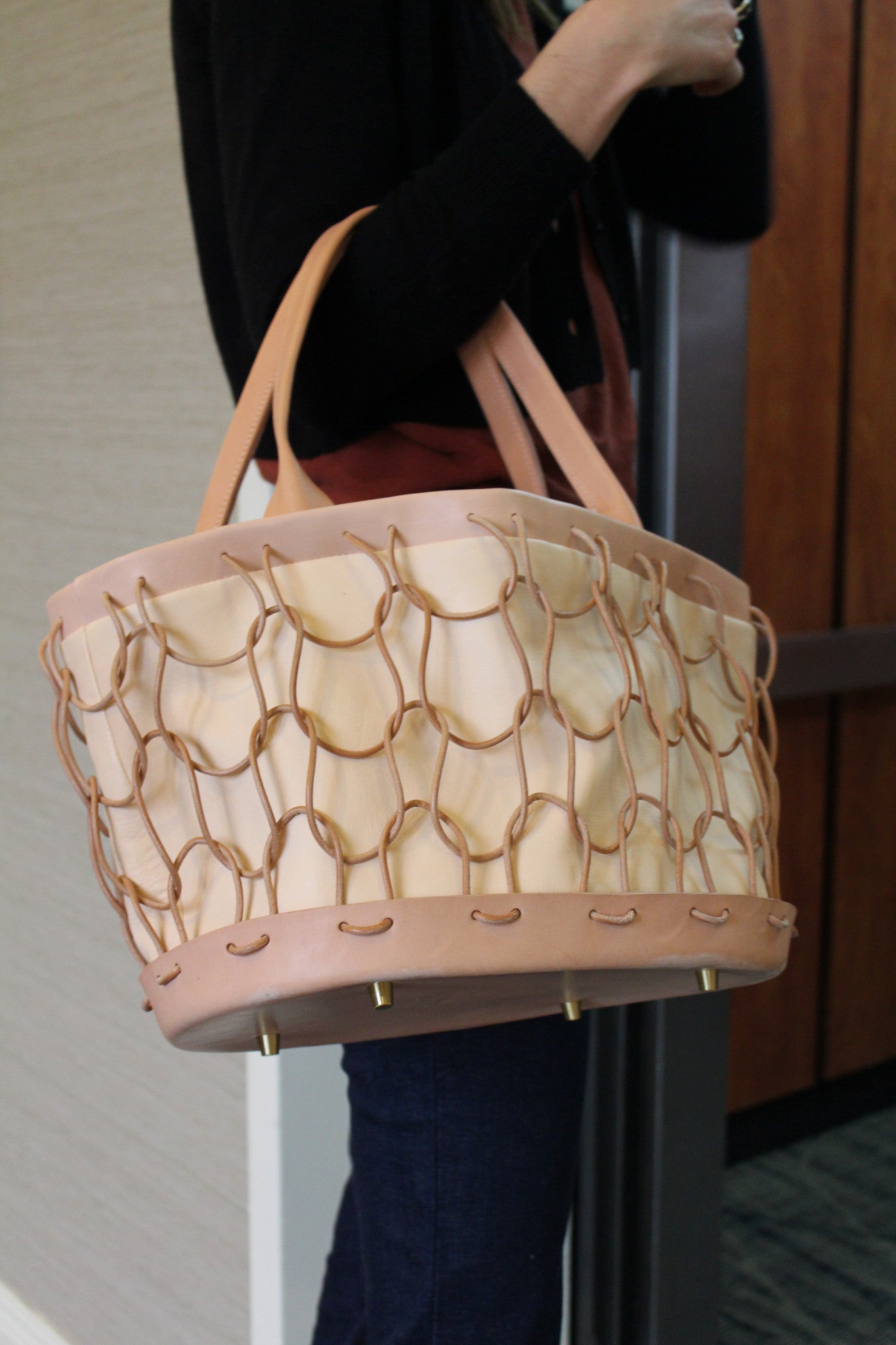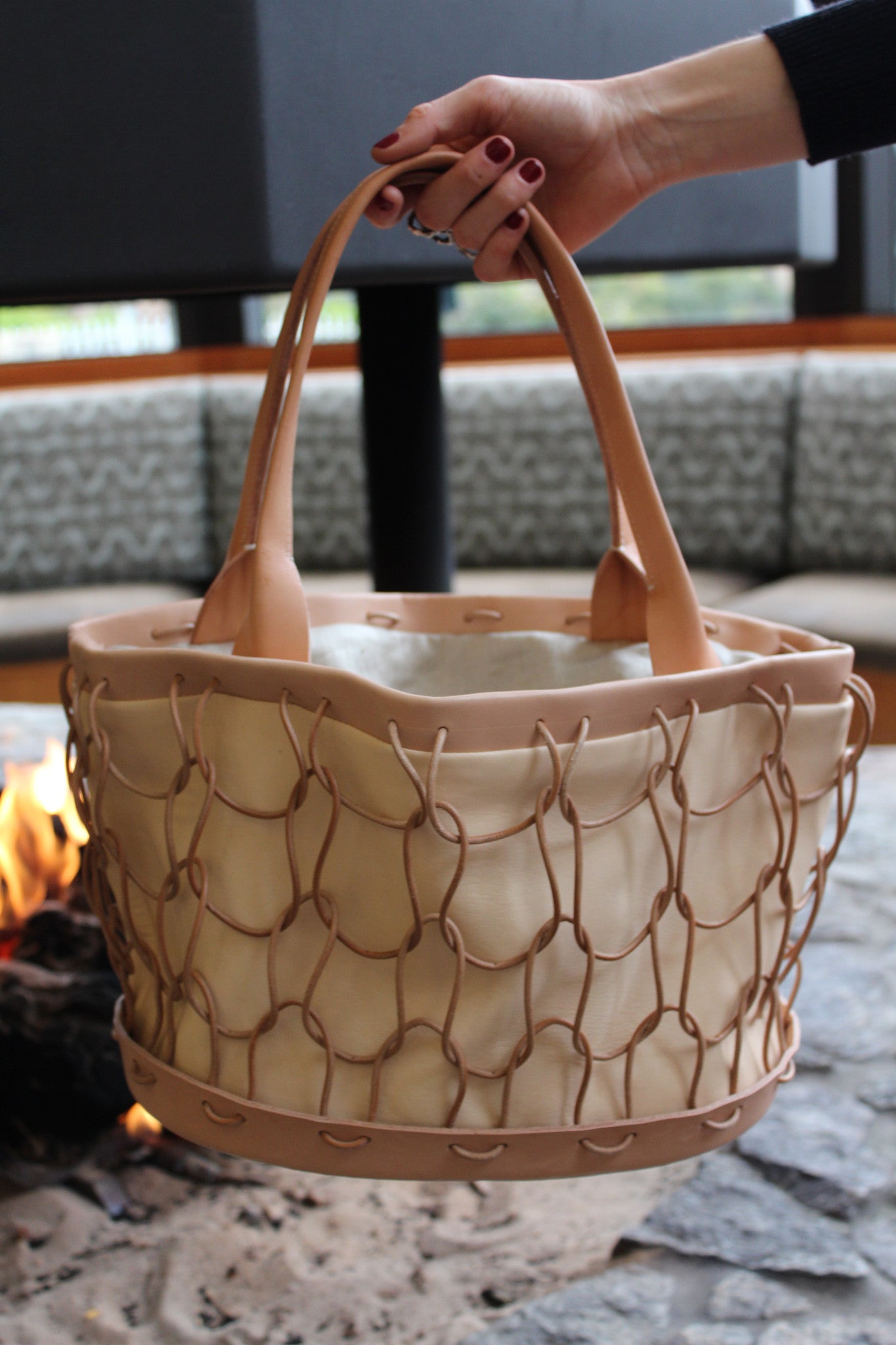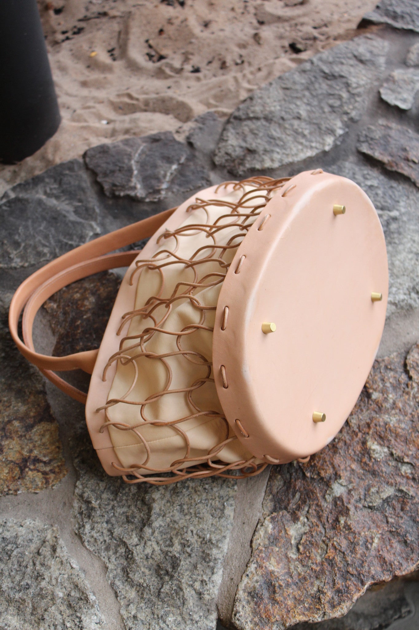 Unstructured bag with outer leather net detail and drawstring closure. 100% Leather. Dust bag included.