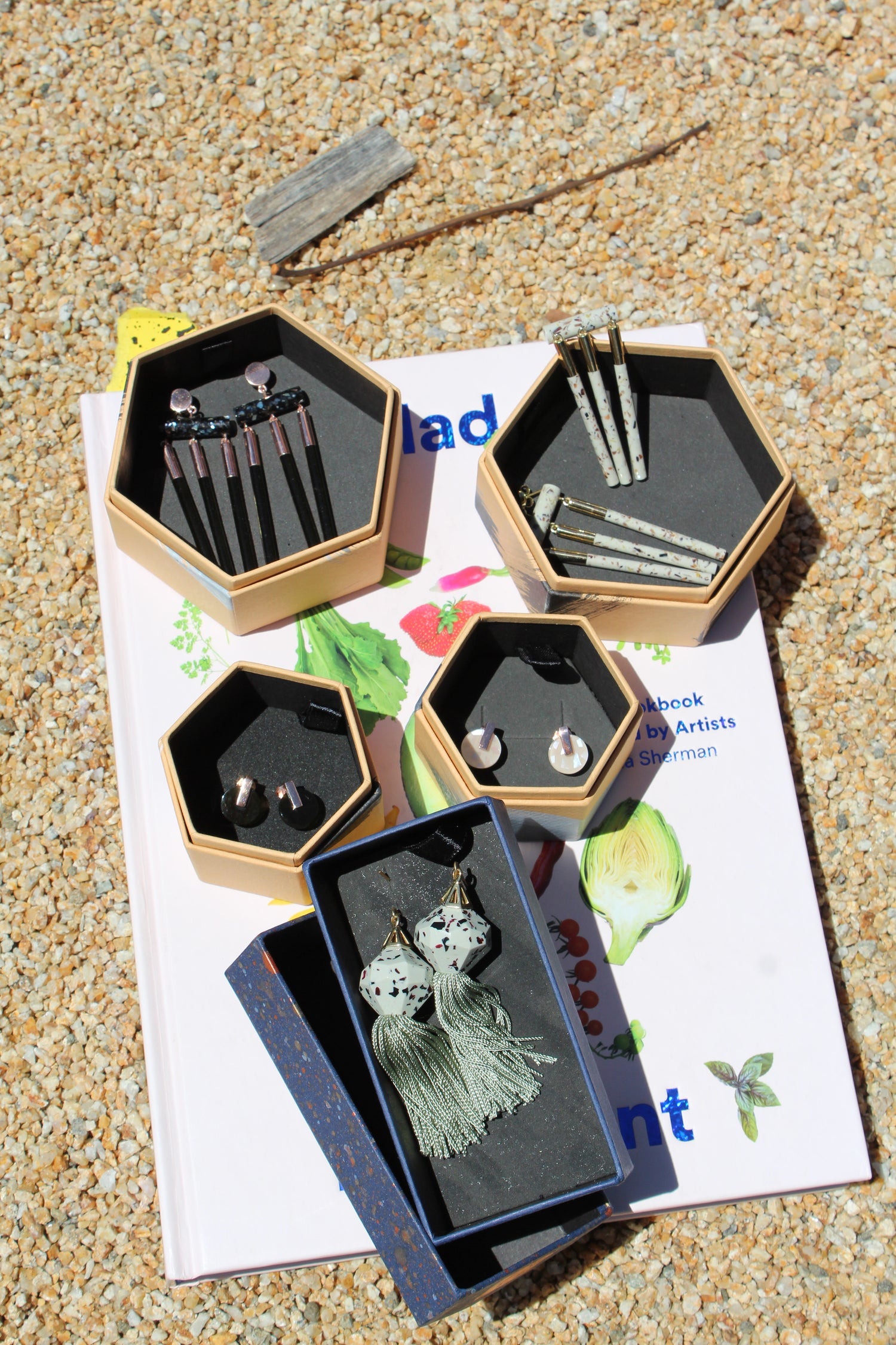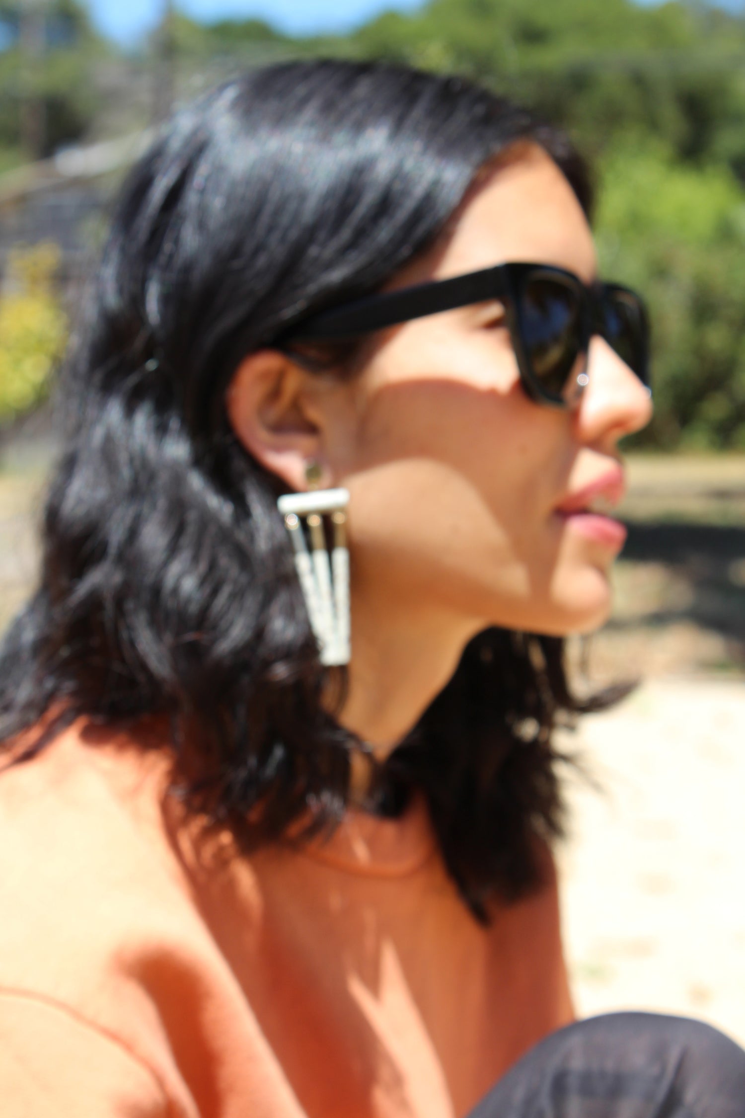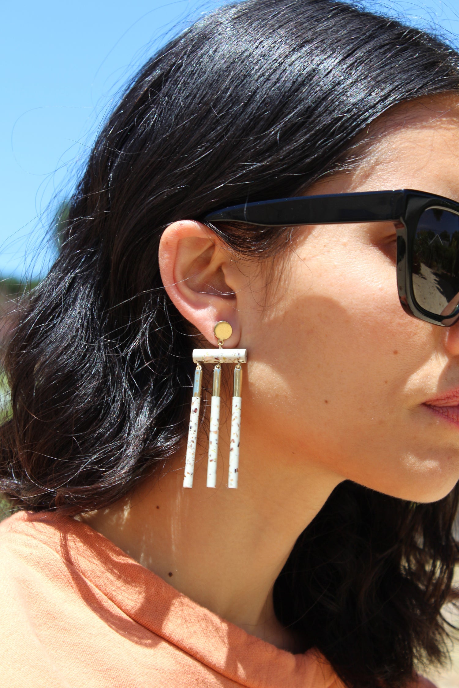 Gold plated stud drop earring with 3 movable resin rod components. Available in granite, and olive. Approx. 2 1/4"