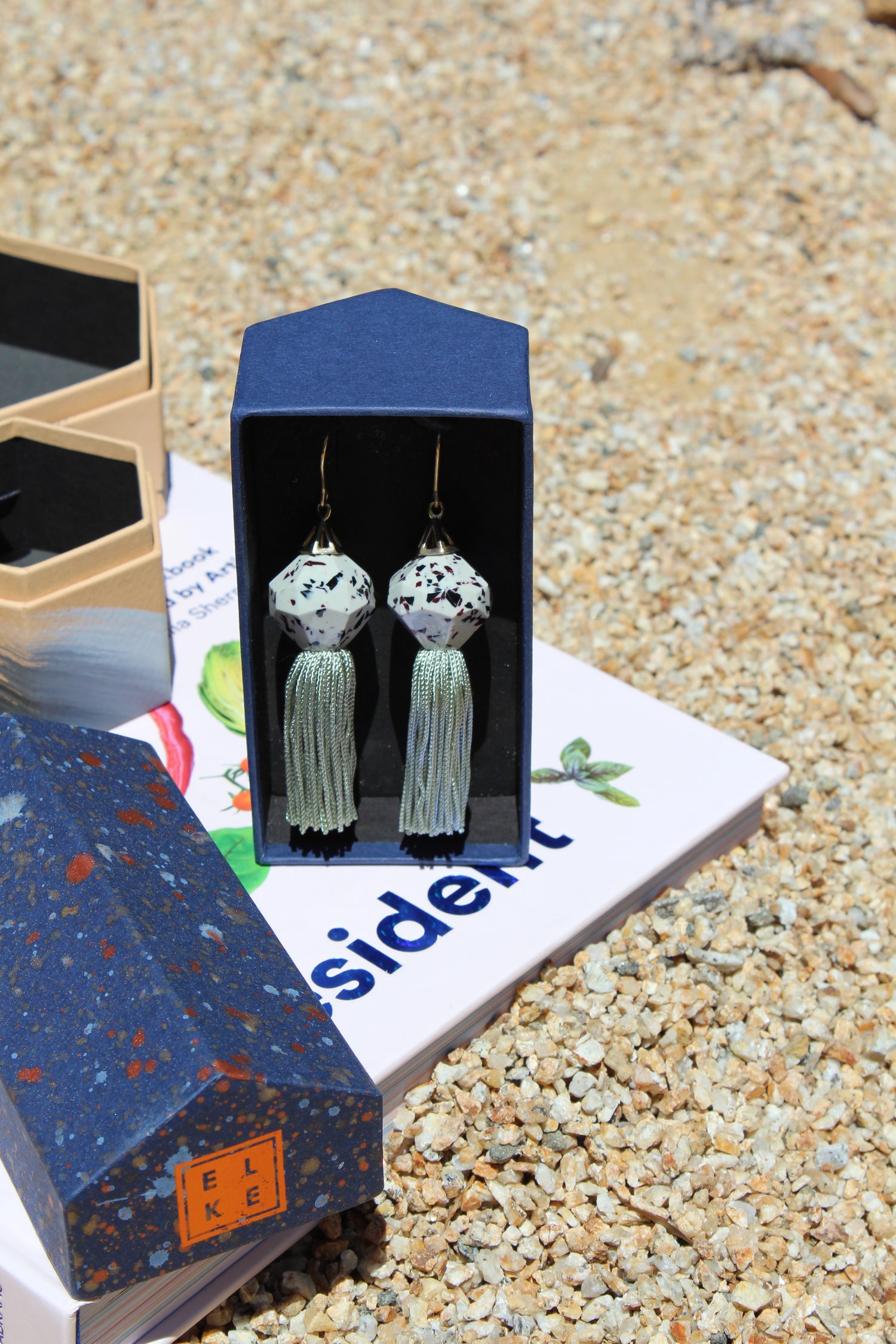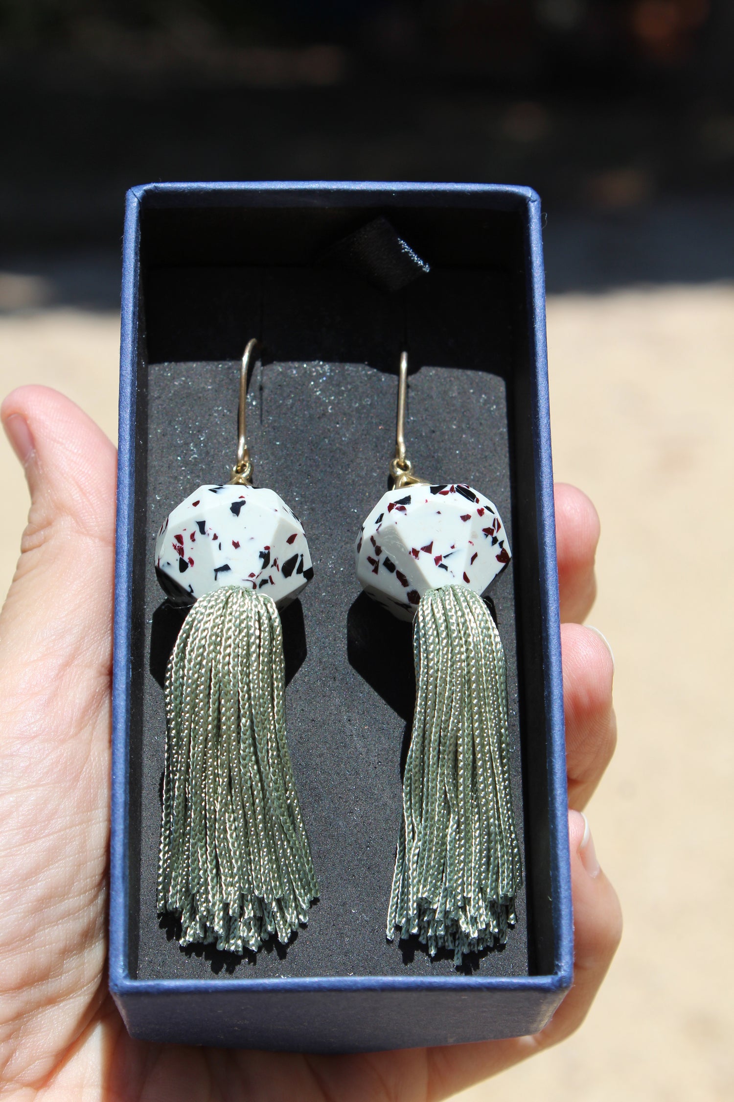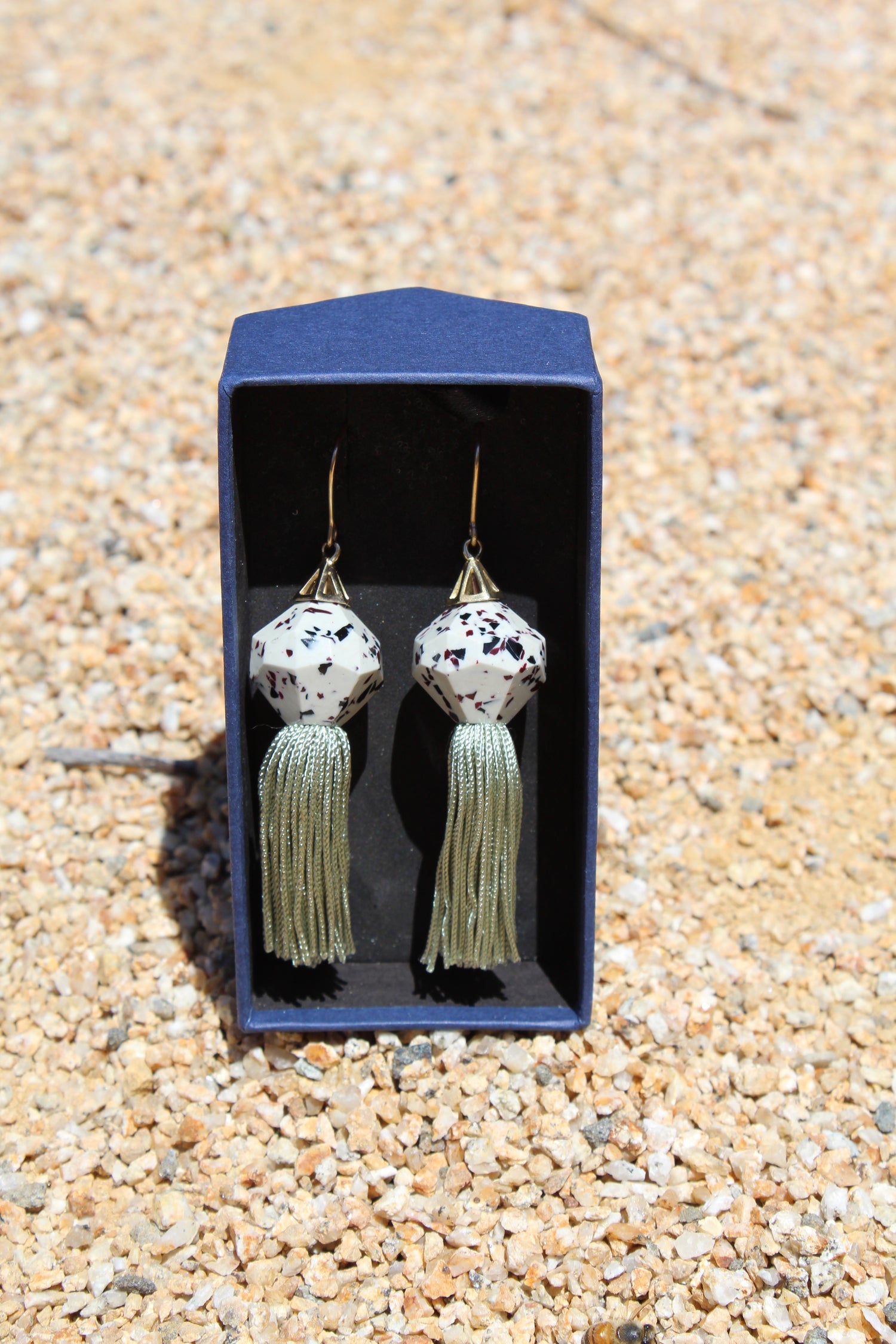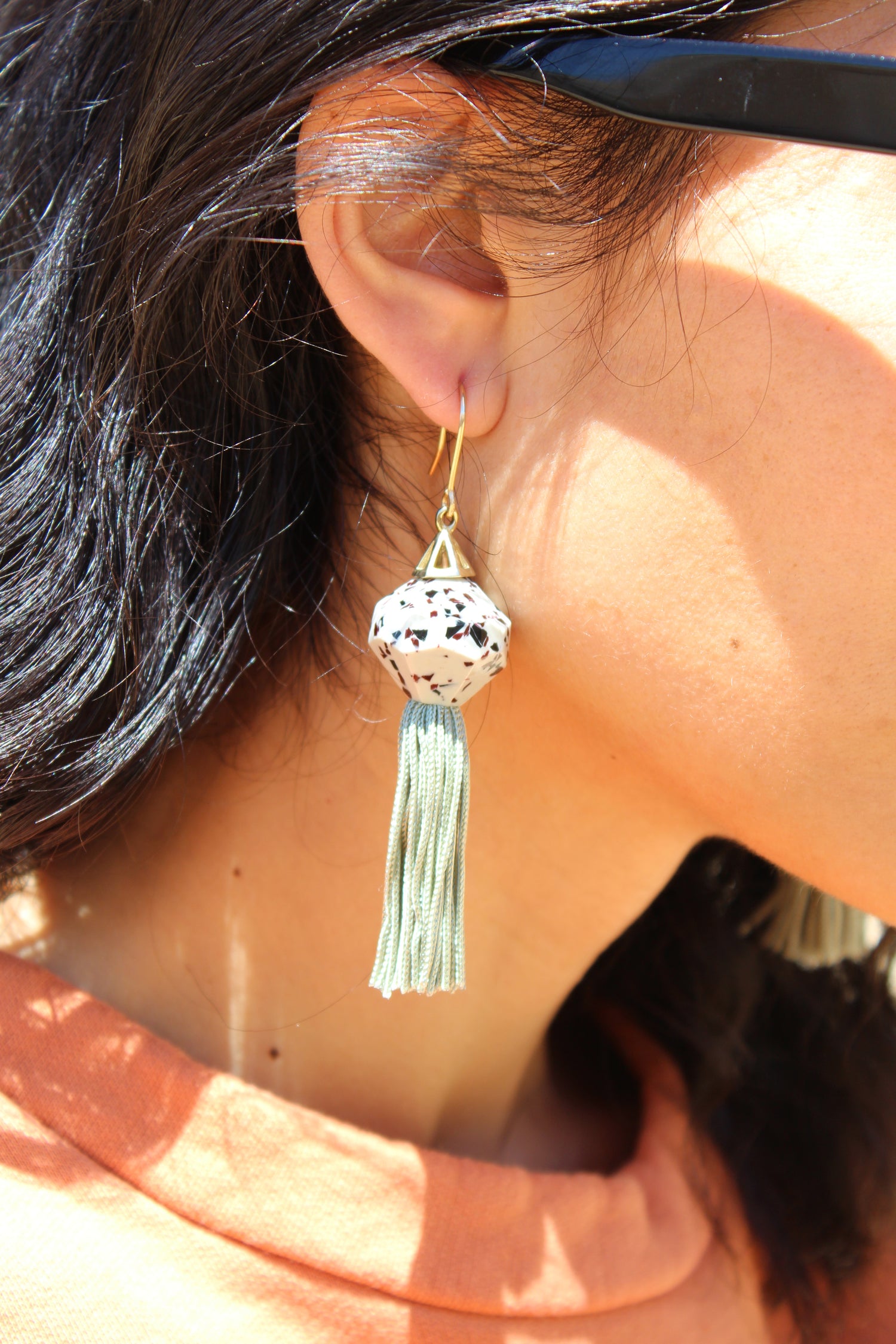 Granite colored resin with brass detail, mint silk tassels. Approx. 2"