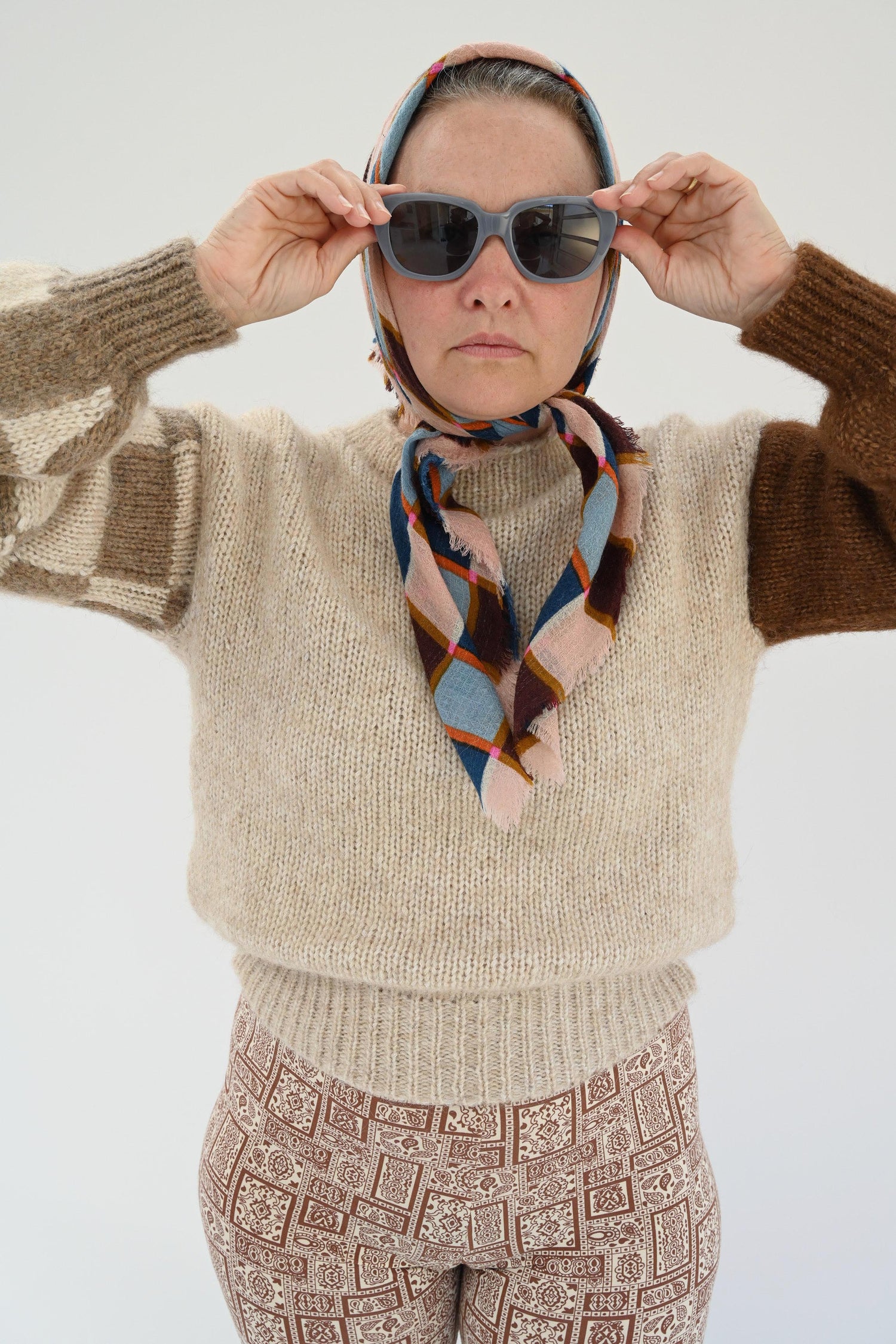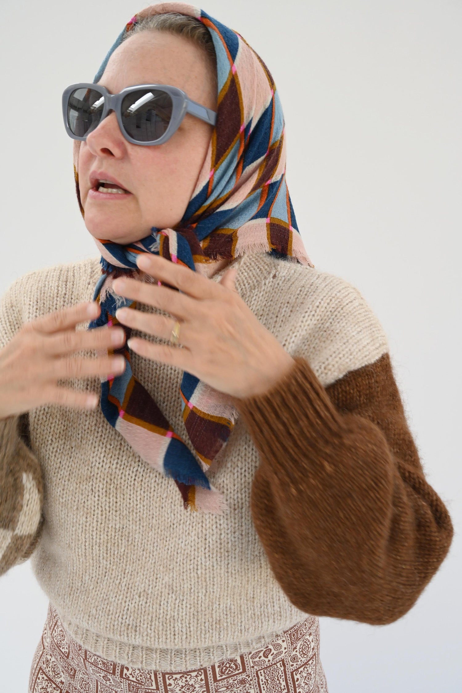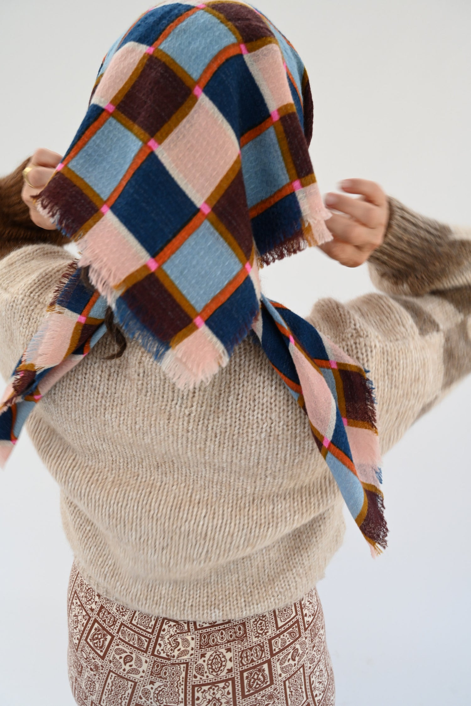 Gorgeous square patterned scarf. Eyelash trim. 80% Wool, 20% Cashmere.