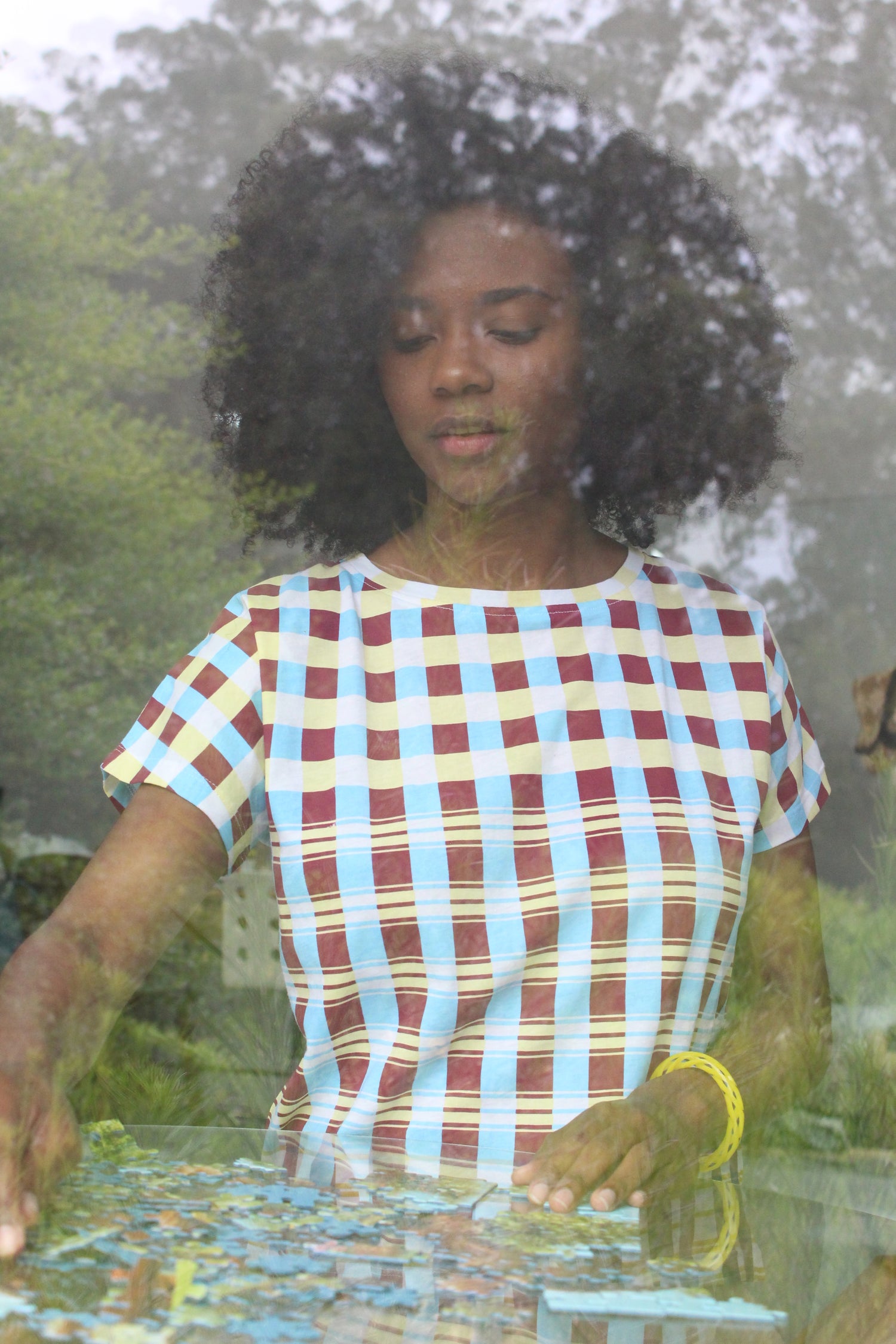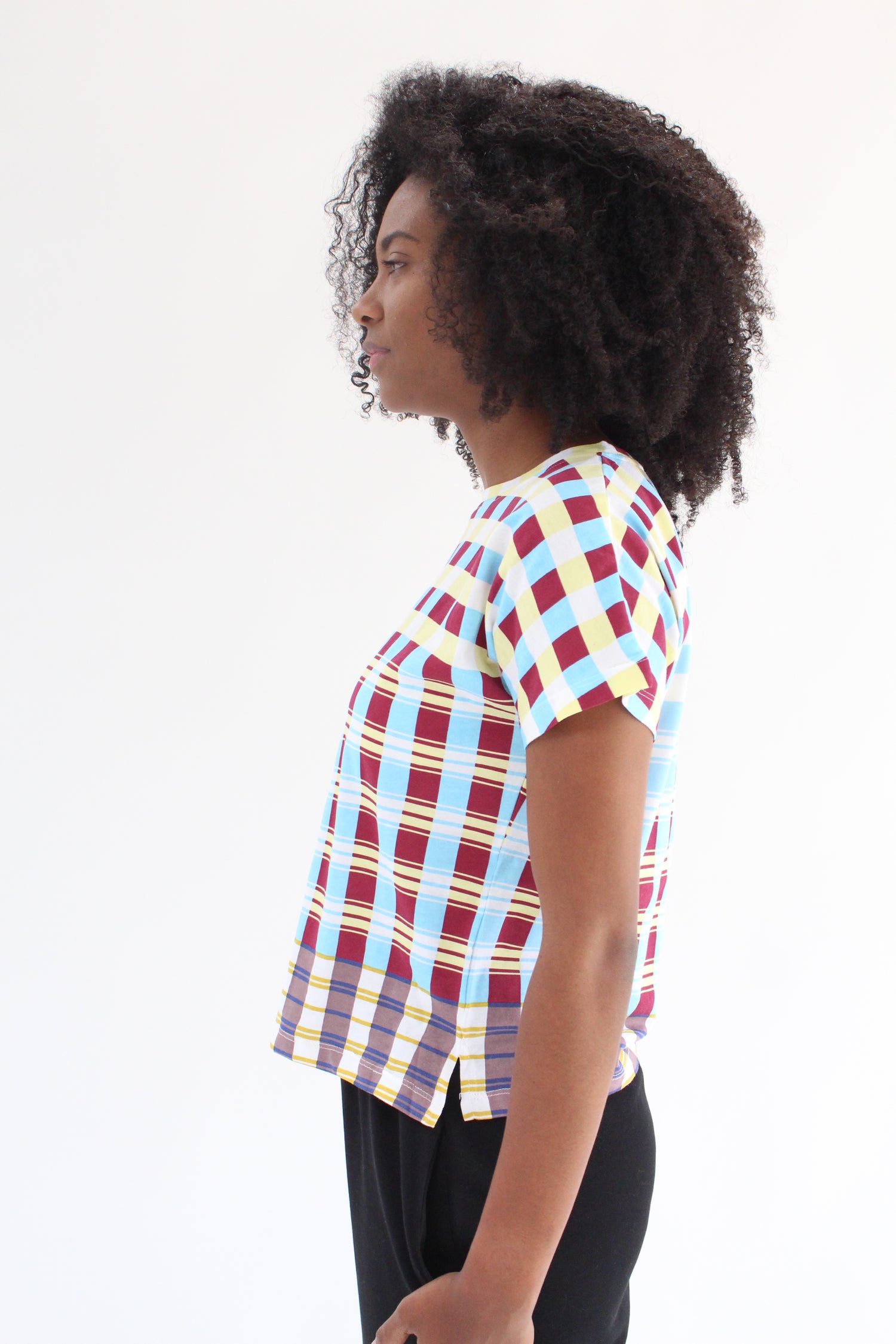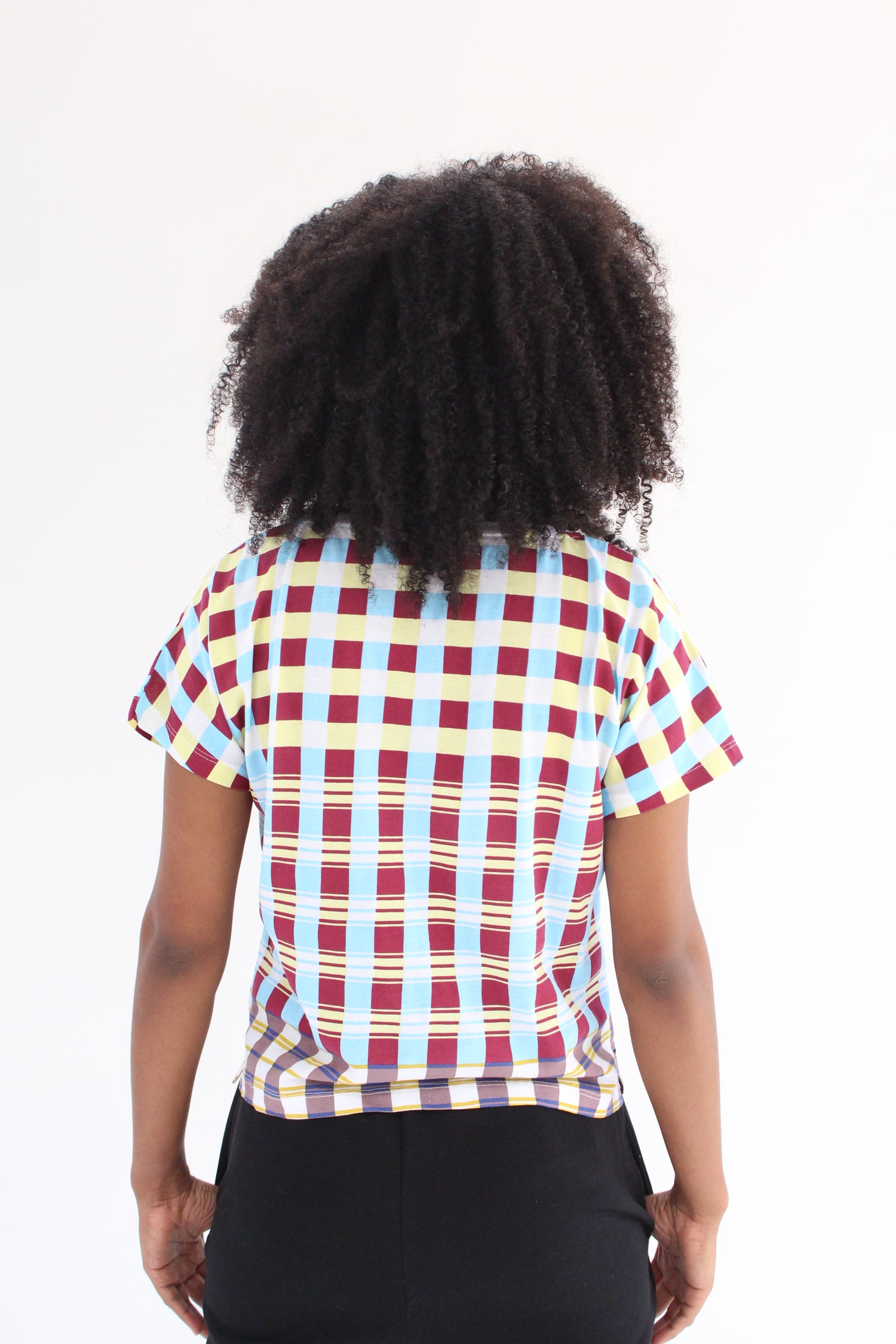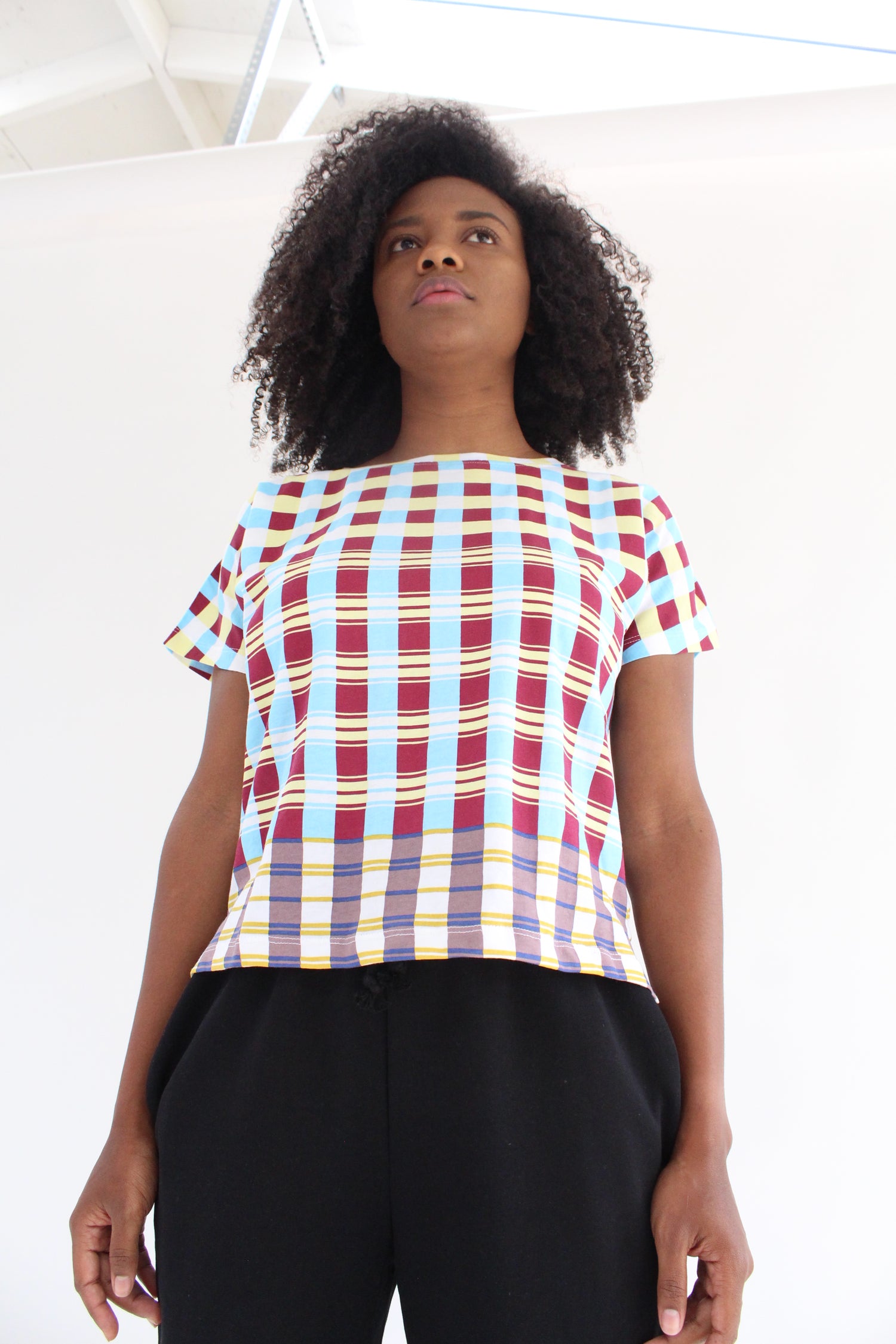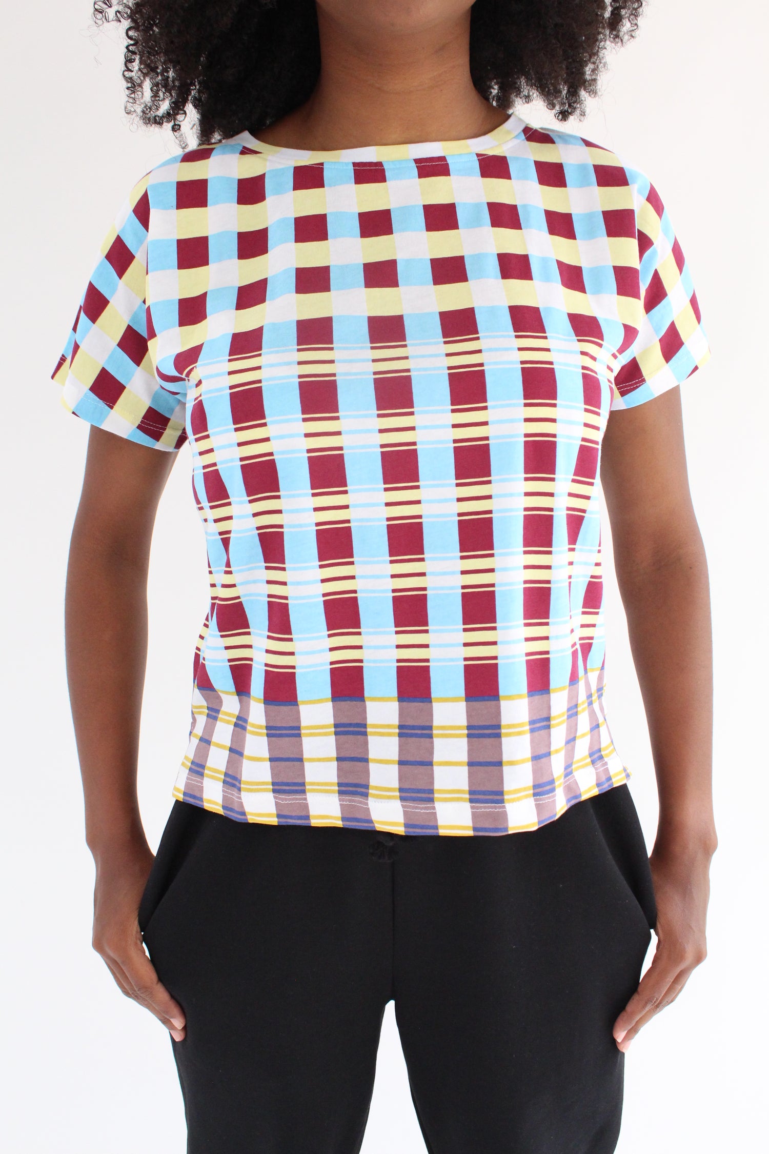 Square plaid cotton t-shirt. Round neckline, slight stretch to fabric. 100% Cotton.