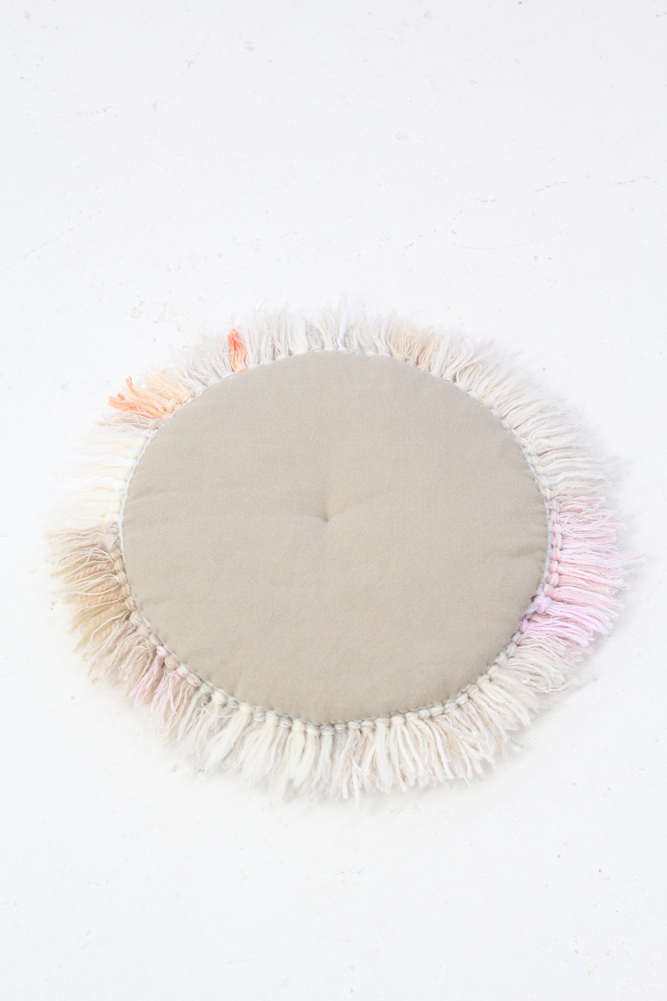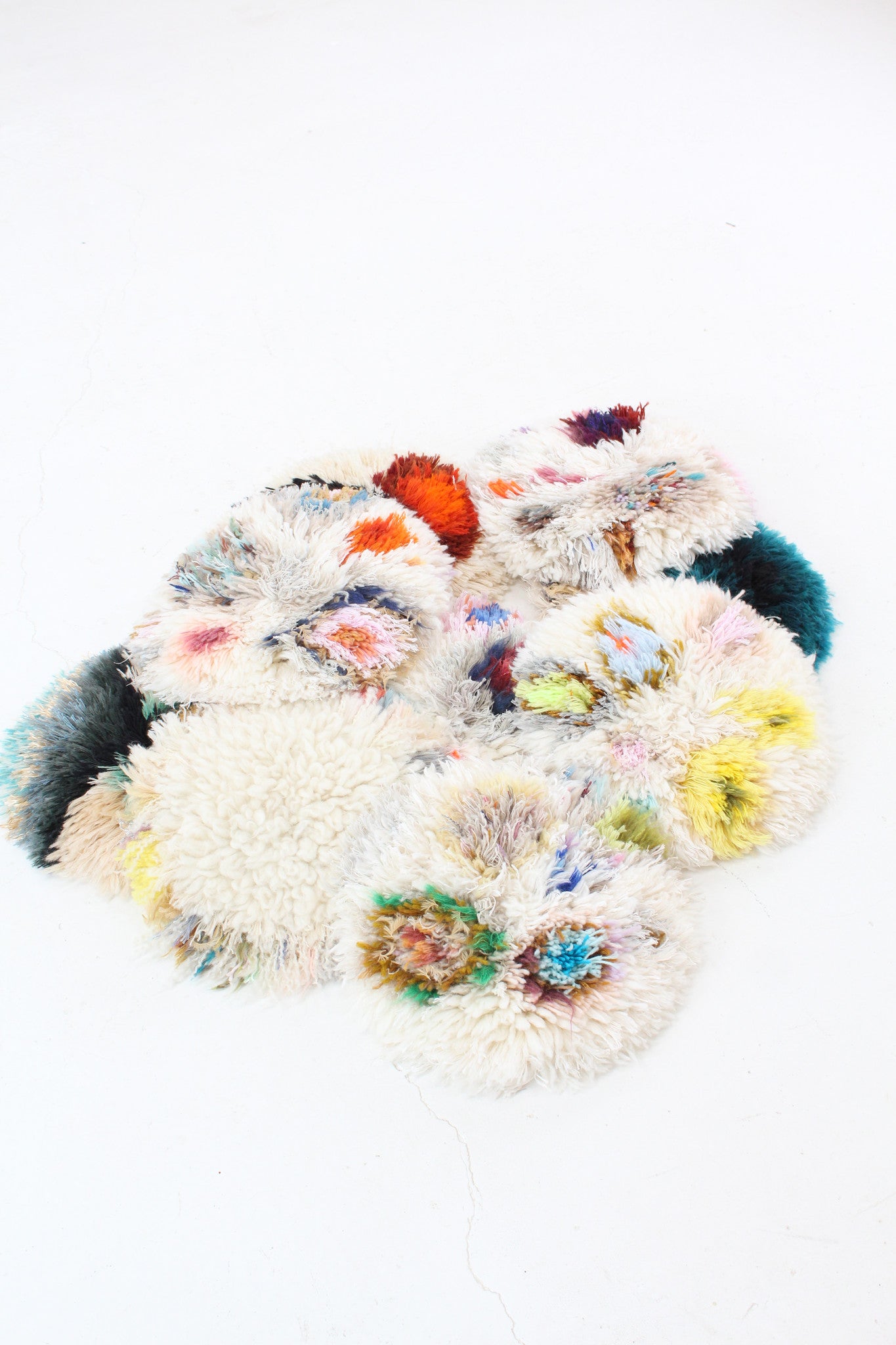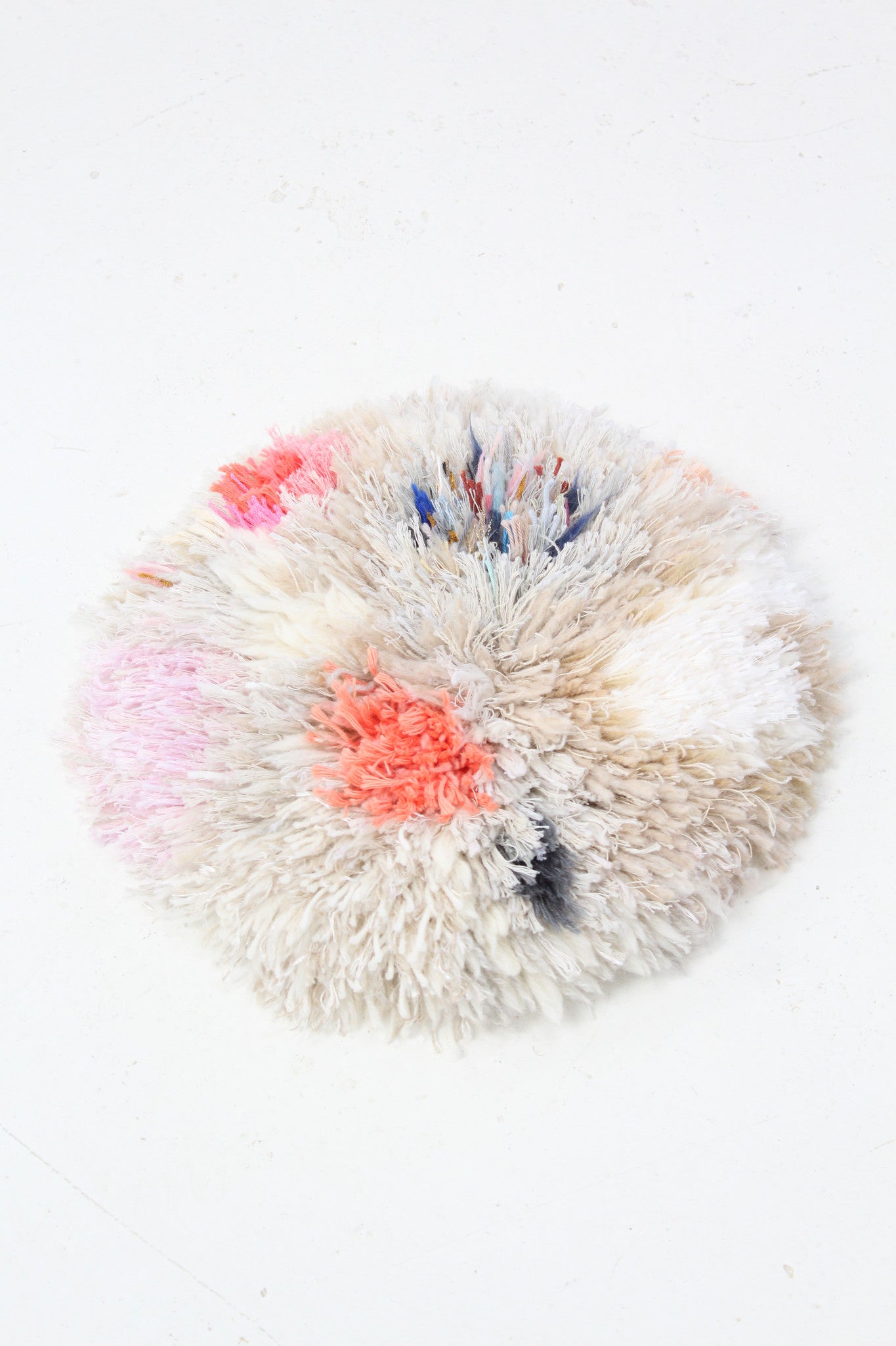 Made in France by hand. Each one is unique. Made from a mix of cotton, wool and synthetic yarns. Aprox 14" across