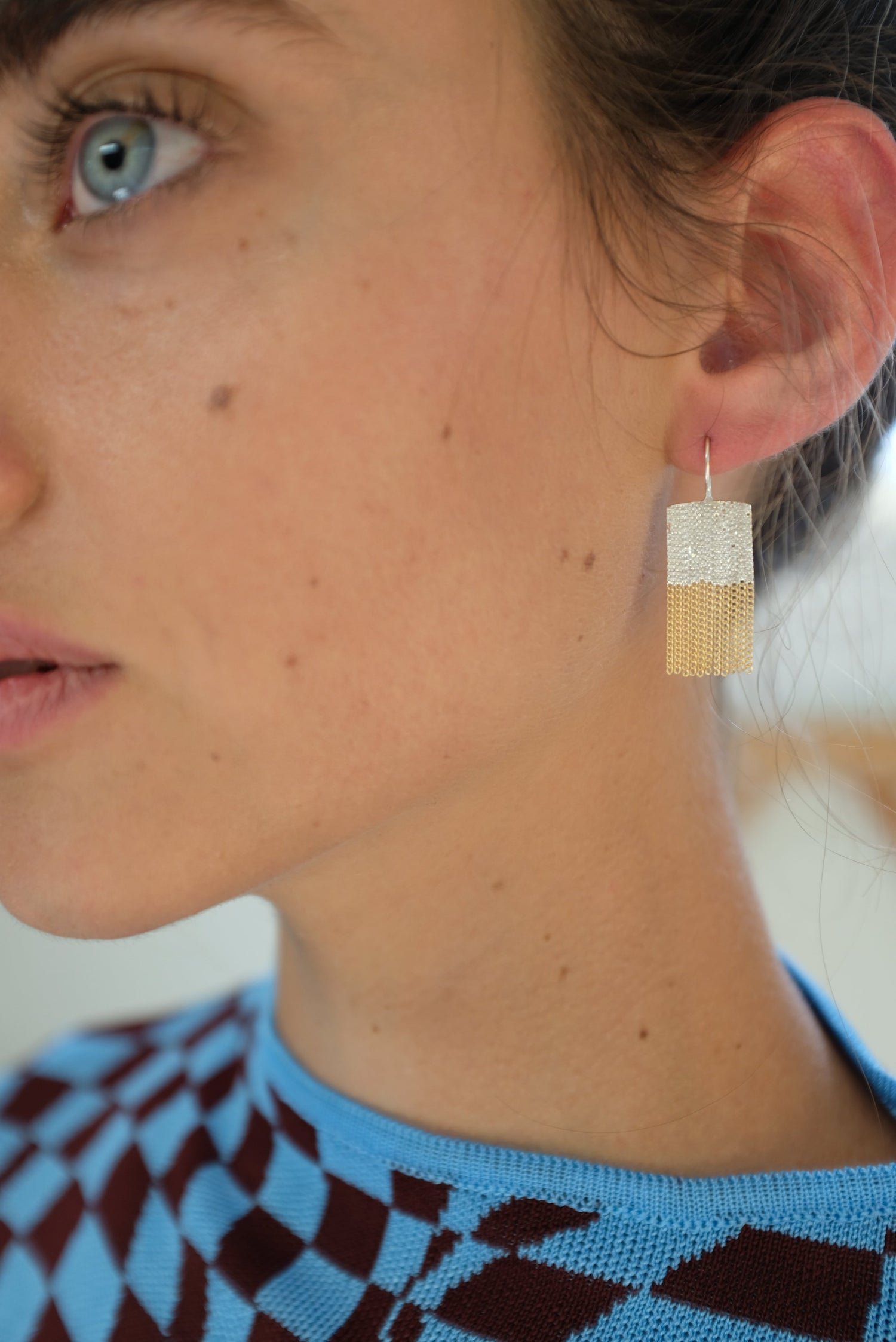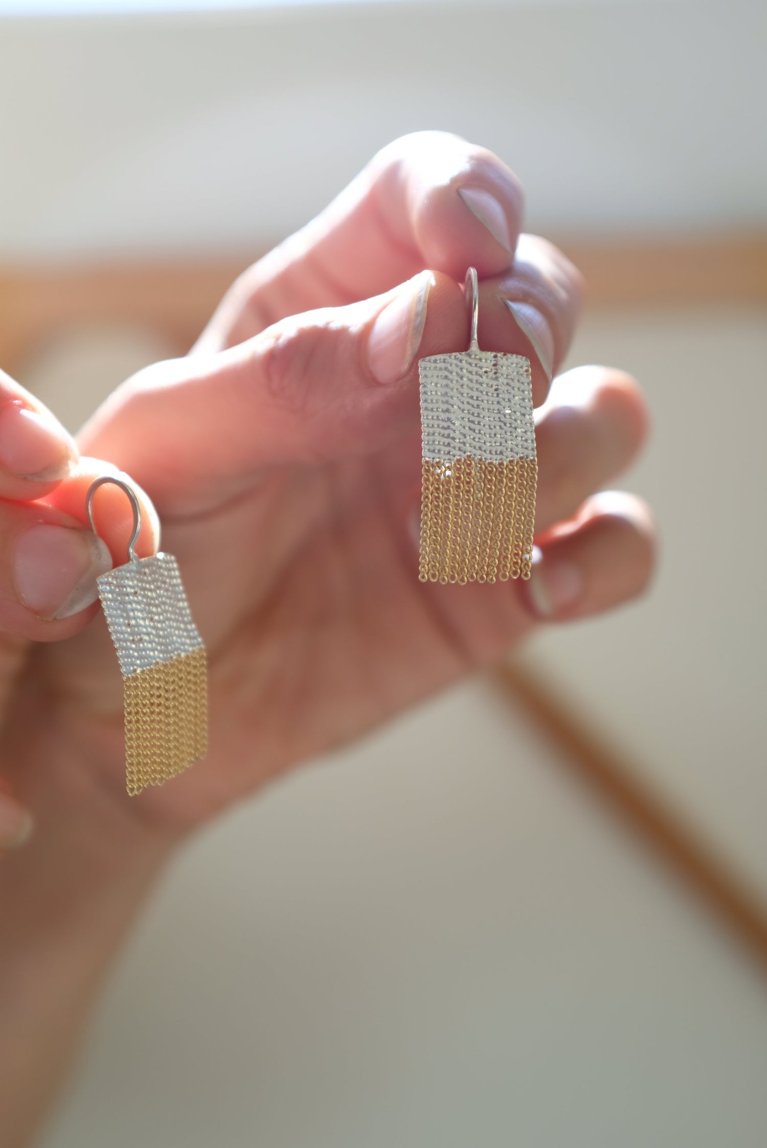 Sterling silver earrings, square soldered upper with delicate brass chains that hang down to create a rectangular silhouette. Measures approximately 1.5" long.