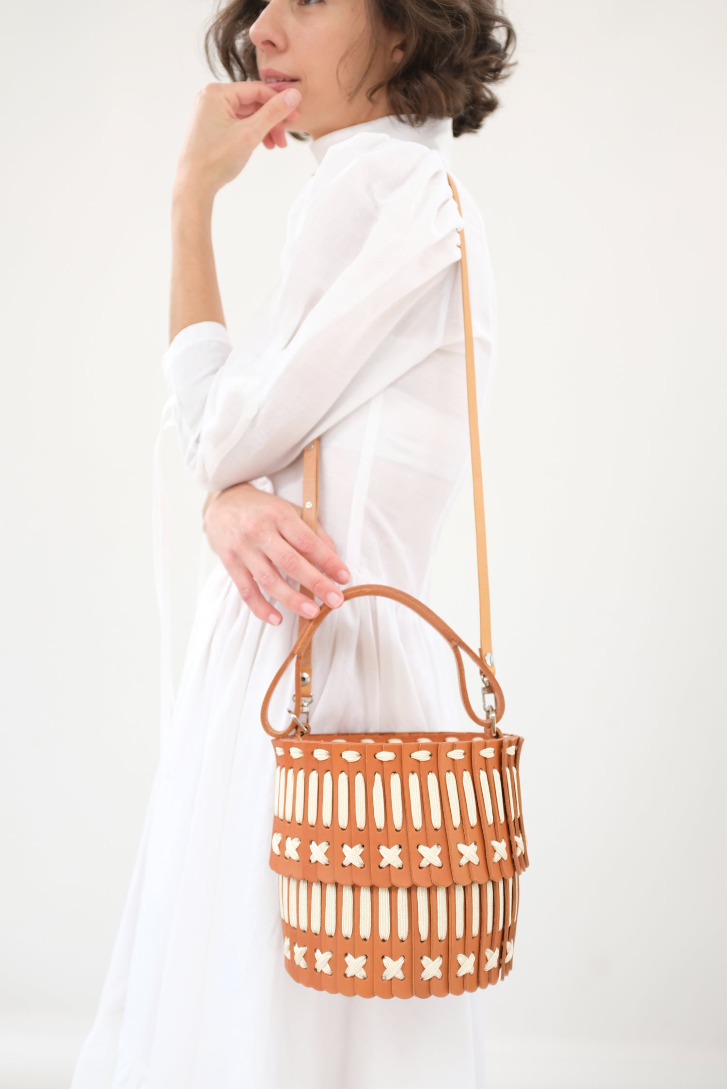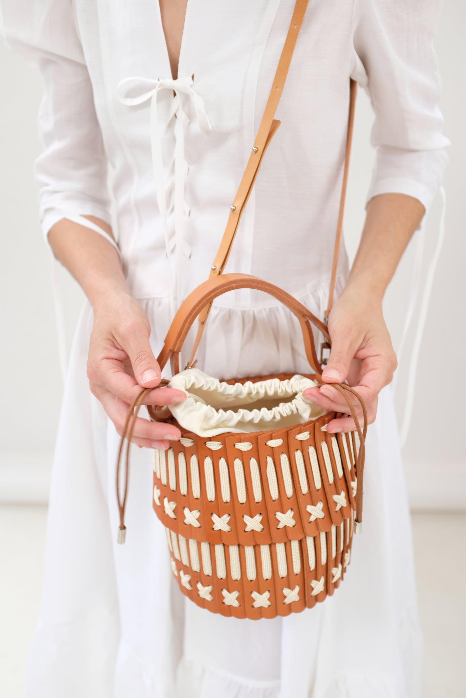 Stunning construction and detailing. Made to perfection! Vegetable tanned leather from Italy. Rayon lacing from Japanese artisans and vintage lacing from the US. Bucket bag, flat top handle with 4.25" drop, linen lining, and leather slip pocket. Adjustable 20” shoulder strap drop.