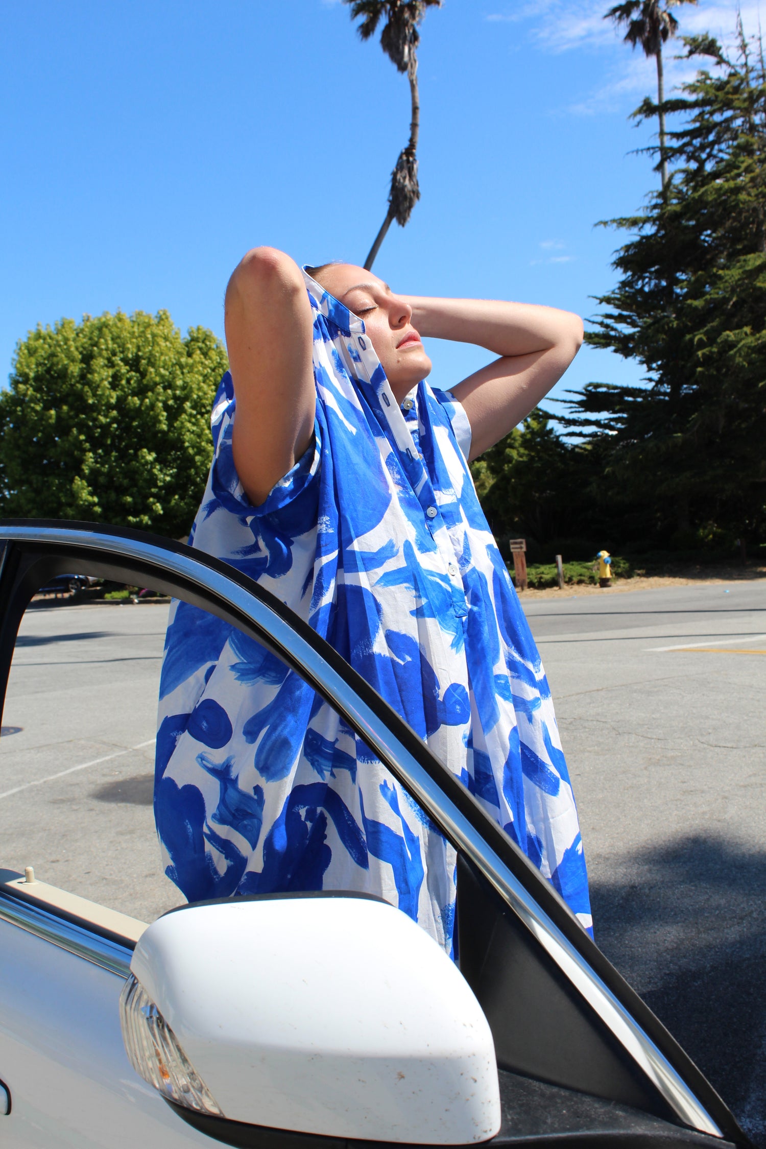 Billowy painter blouse dress, 100% cotton, custom exclusive print, rushing at collar, shoulders and back yoke, stand collar. Mother-of-pearl button fastenings, hidden side pockets and rounded hem on sides. Machine washable.
