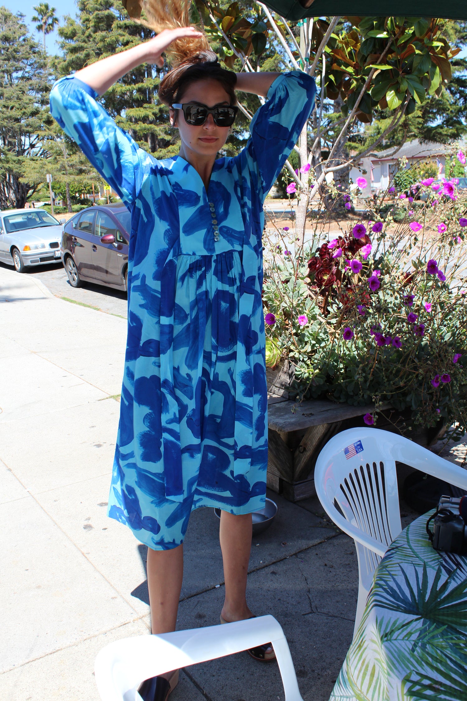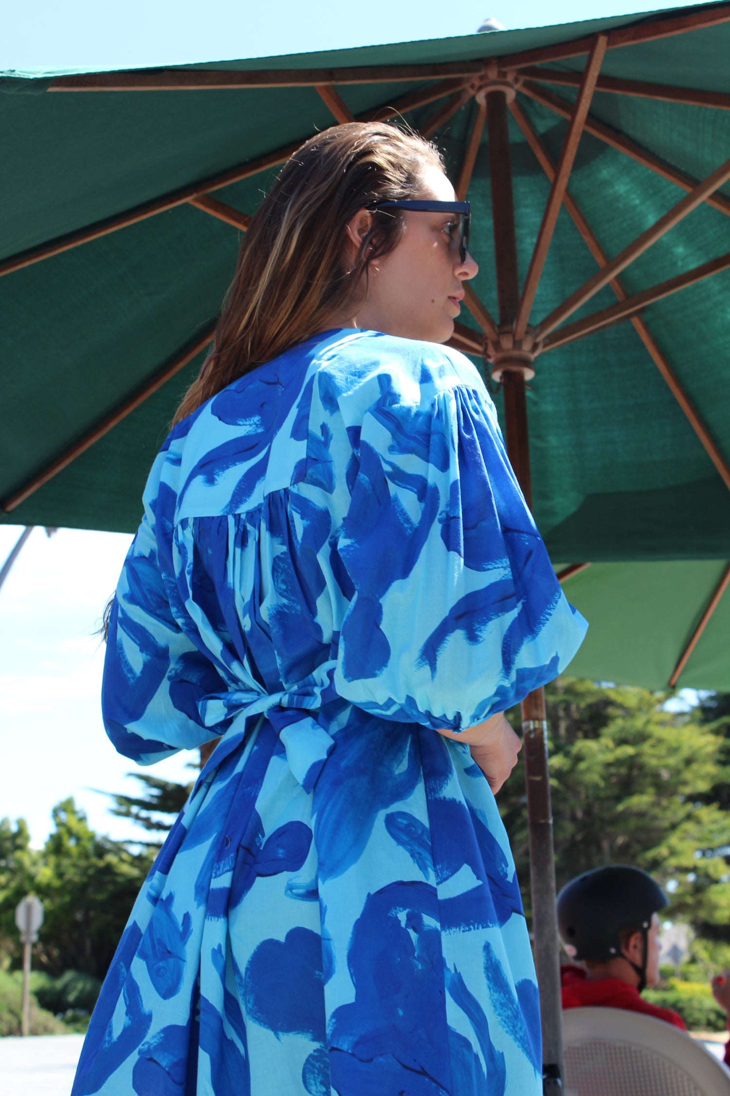 Folk-inspired dress with button-and-loop fastenings, ties in back, v-neck, medium rushed bishop sleeves, skirt is gathered at the front & back yokes, hidden side pockets. 100% cotton, custom exclusive print. Machine washable.