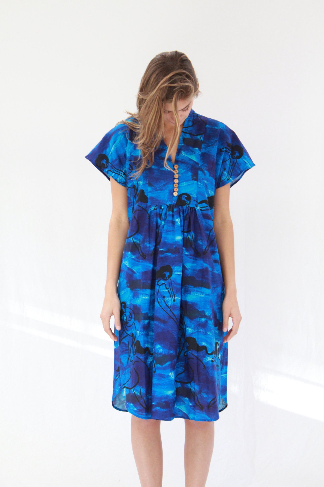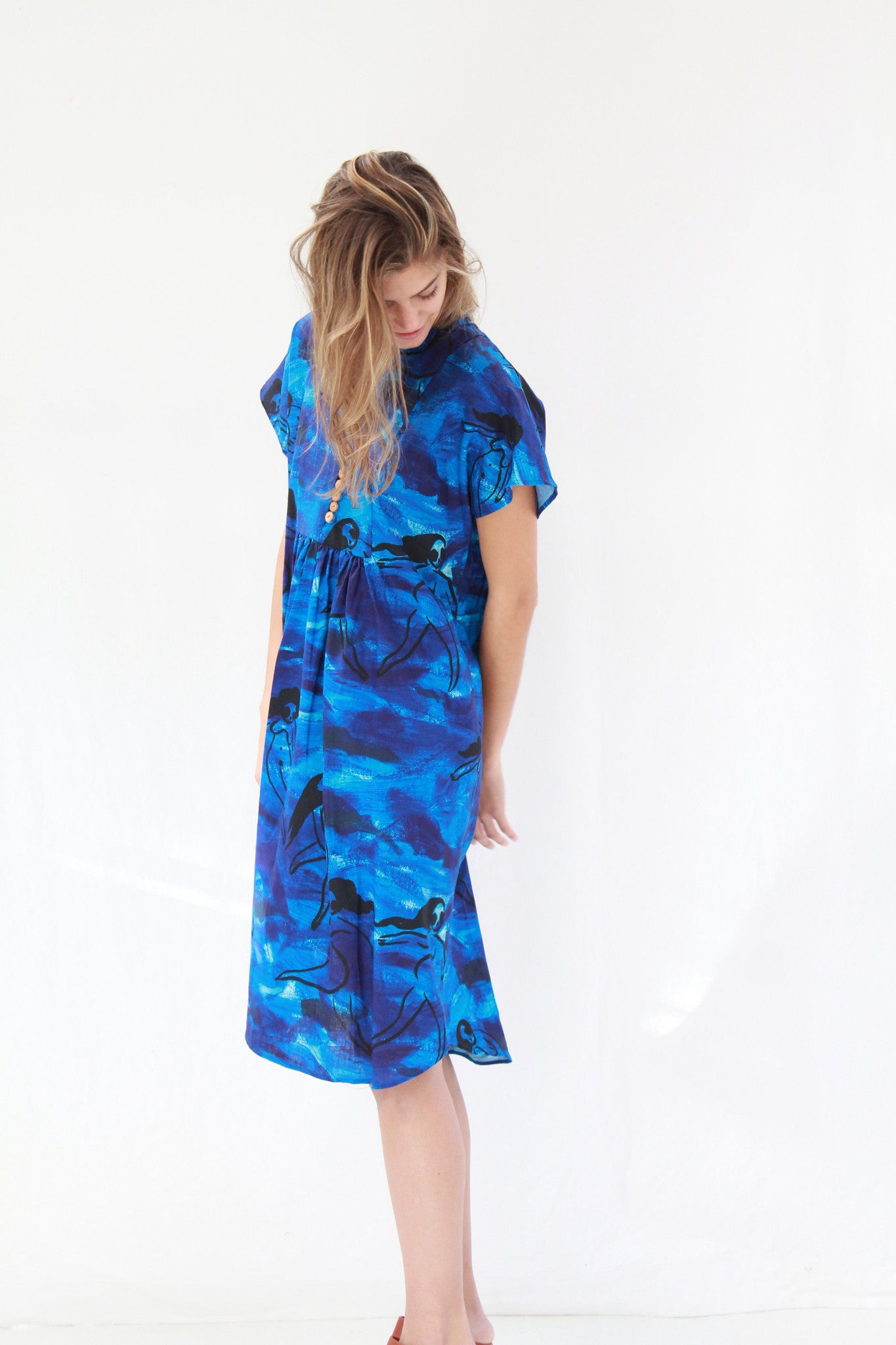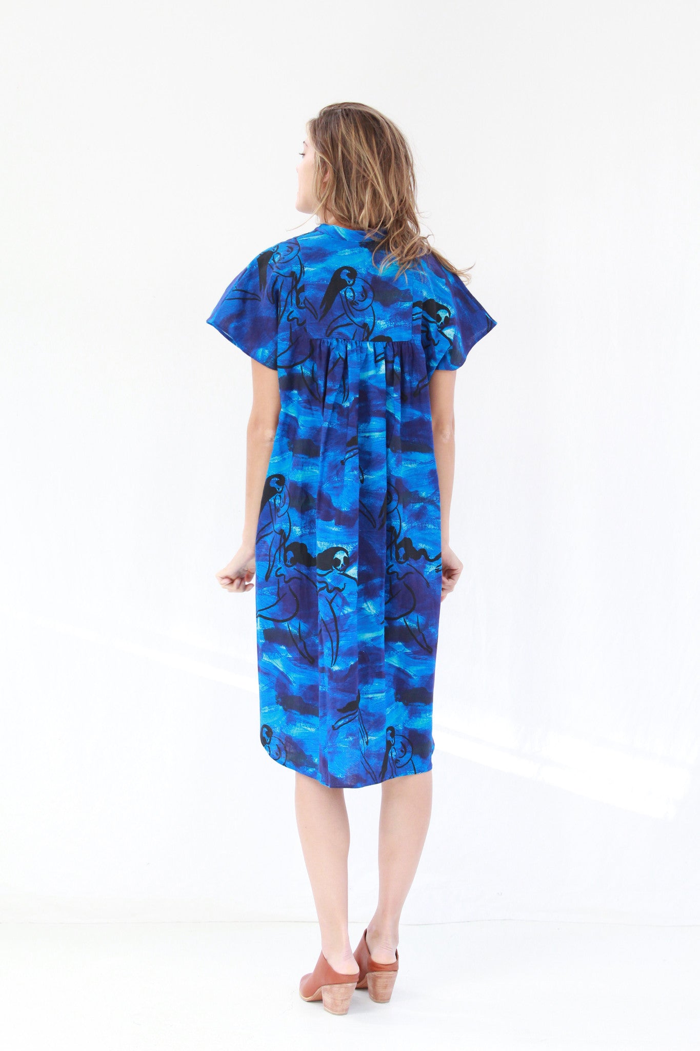 55% Linen 45% cotton, odou pattern that was co-designed with Barcelona-based illustrator Nuria R. Artuñedo. Midi kaftan dress with wooden button fastenings through front, opened stand collar, gathered front and back, hidden side pockets.