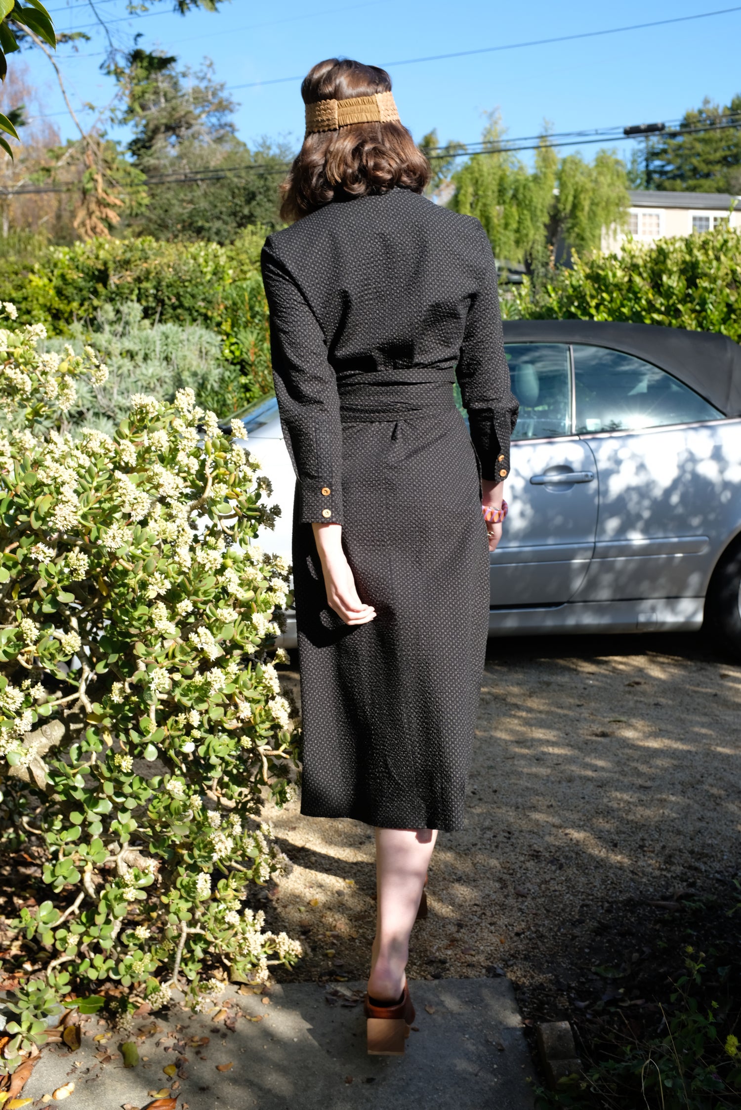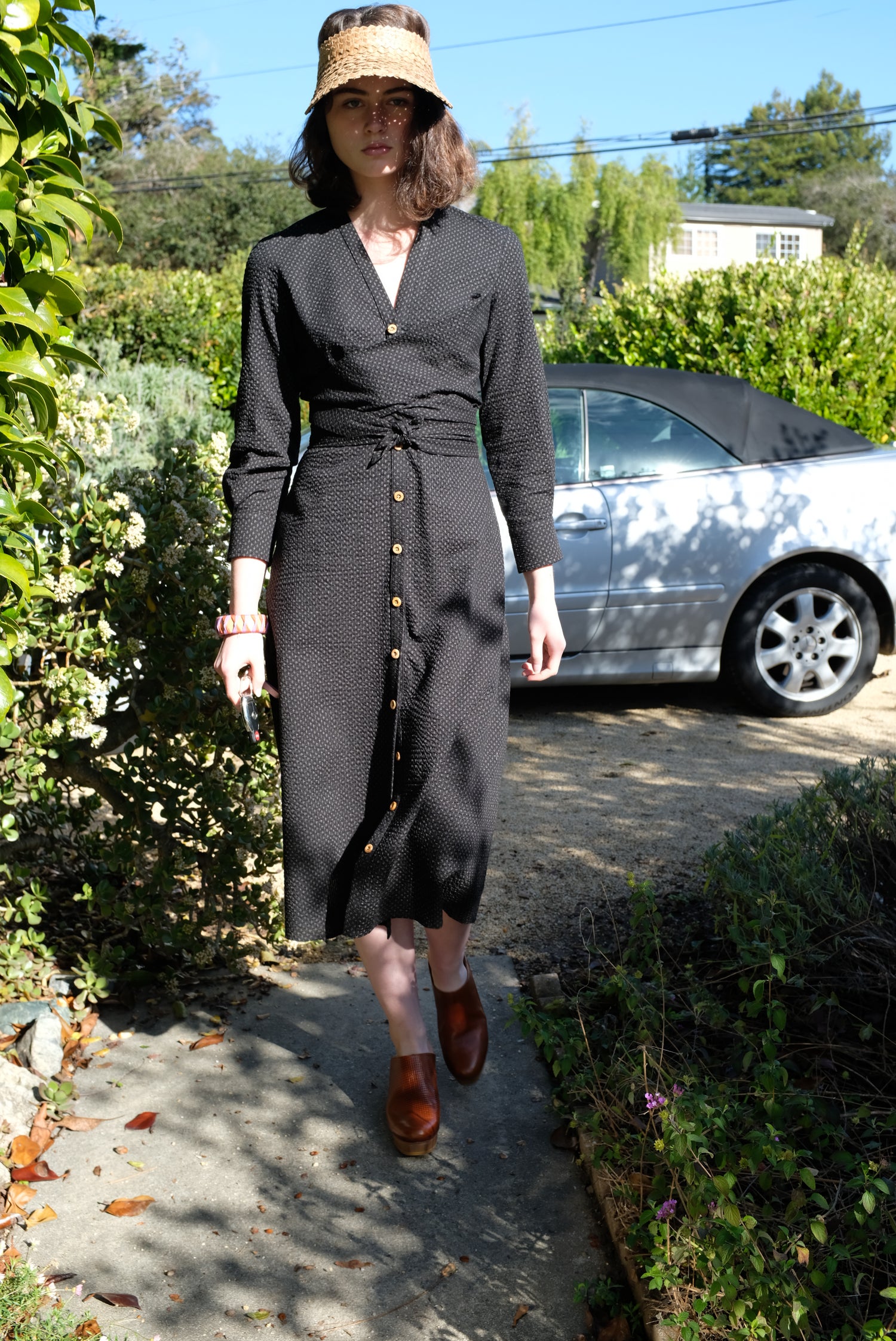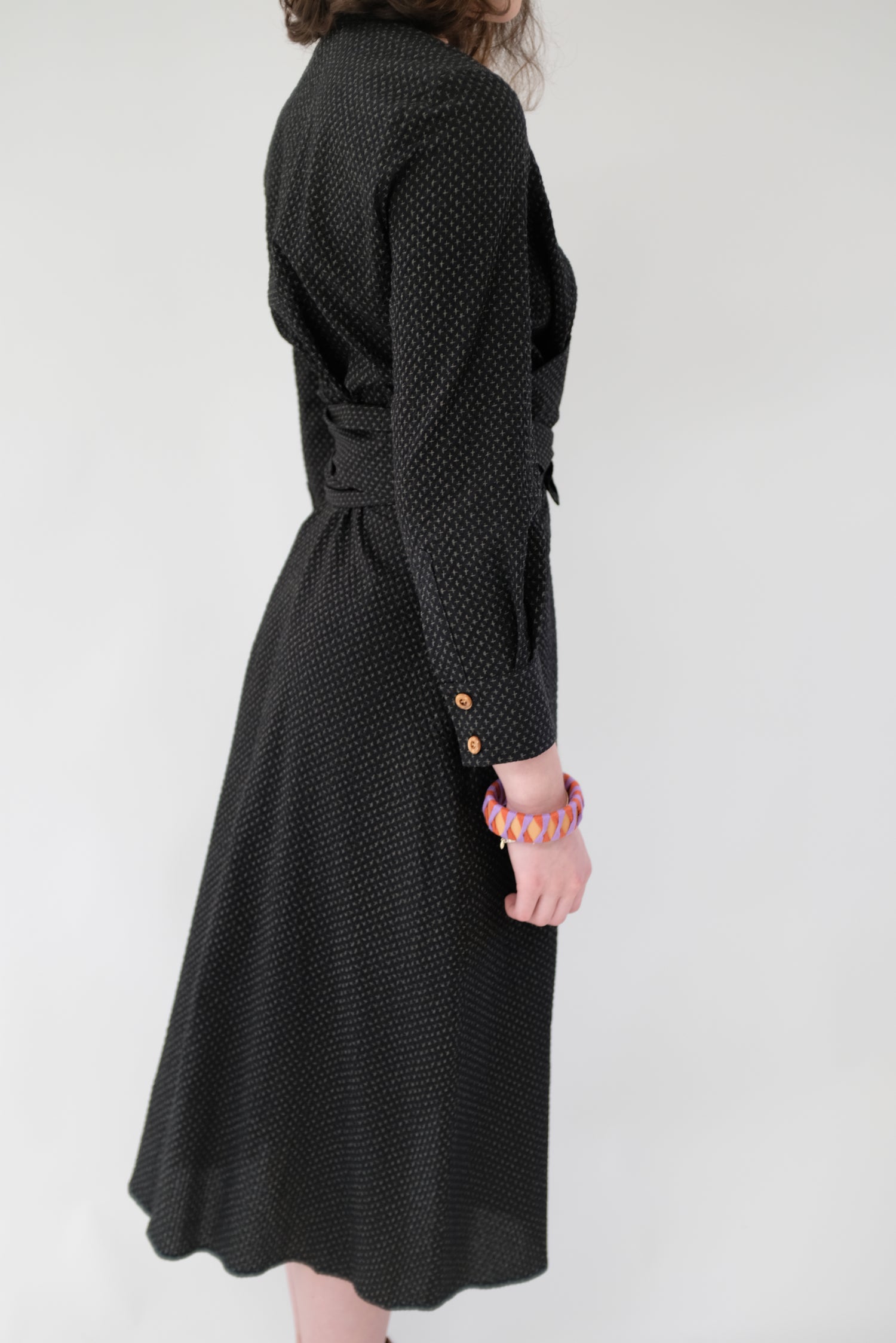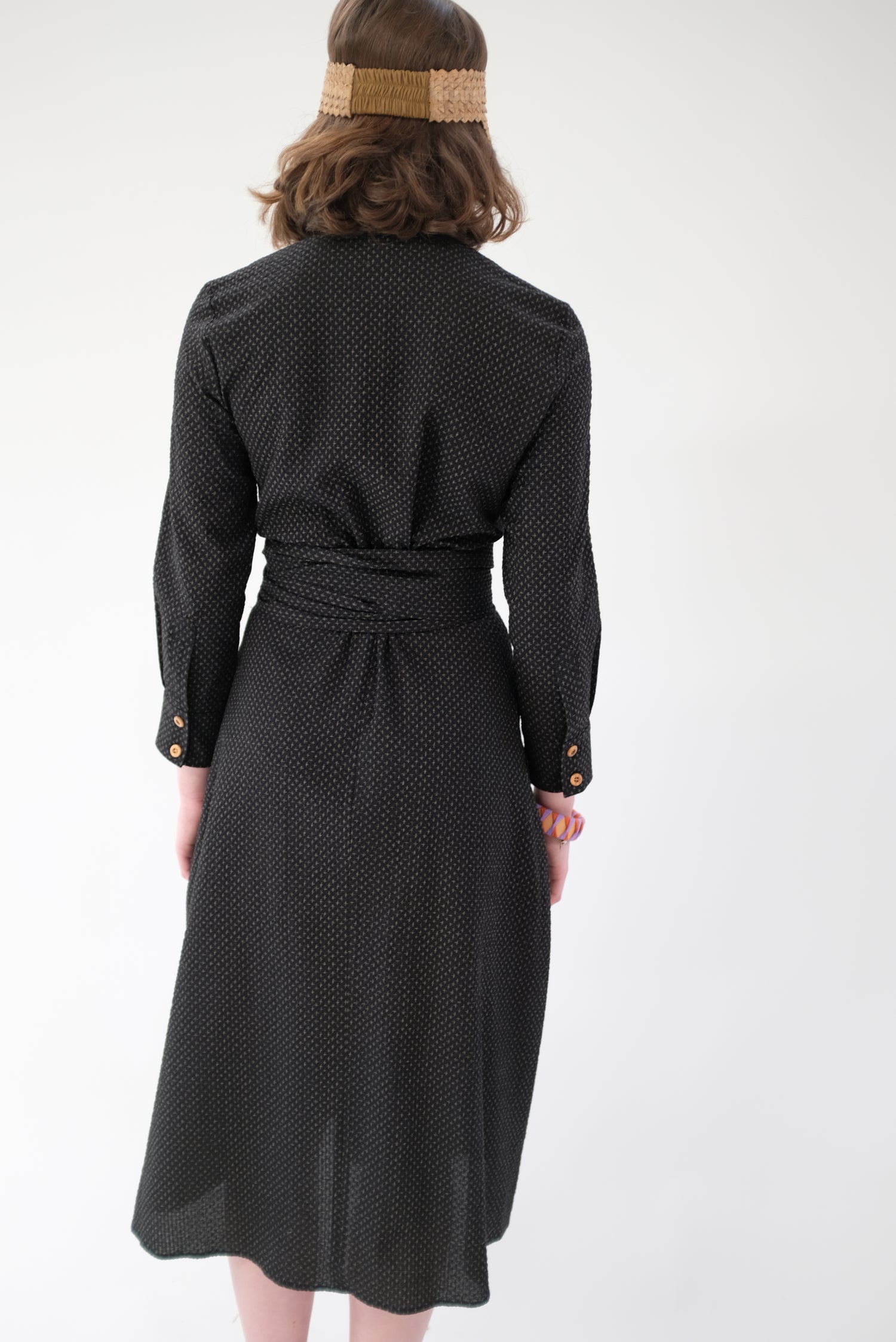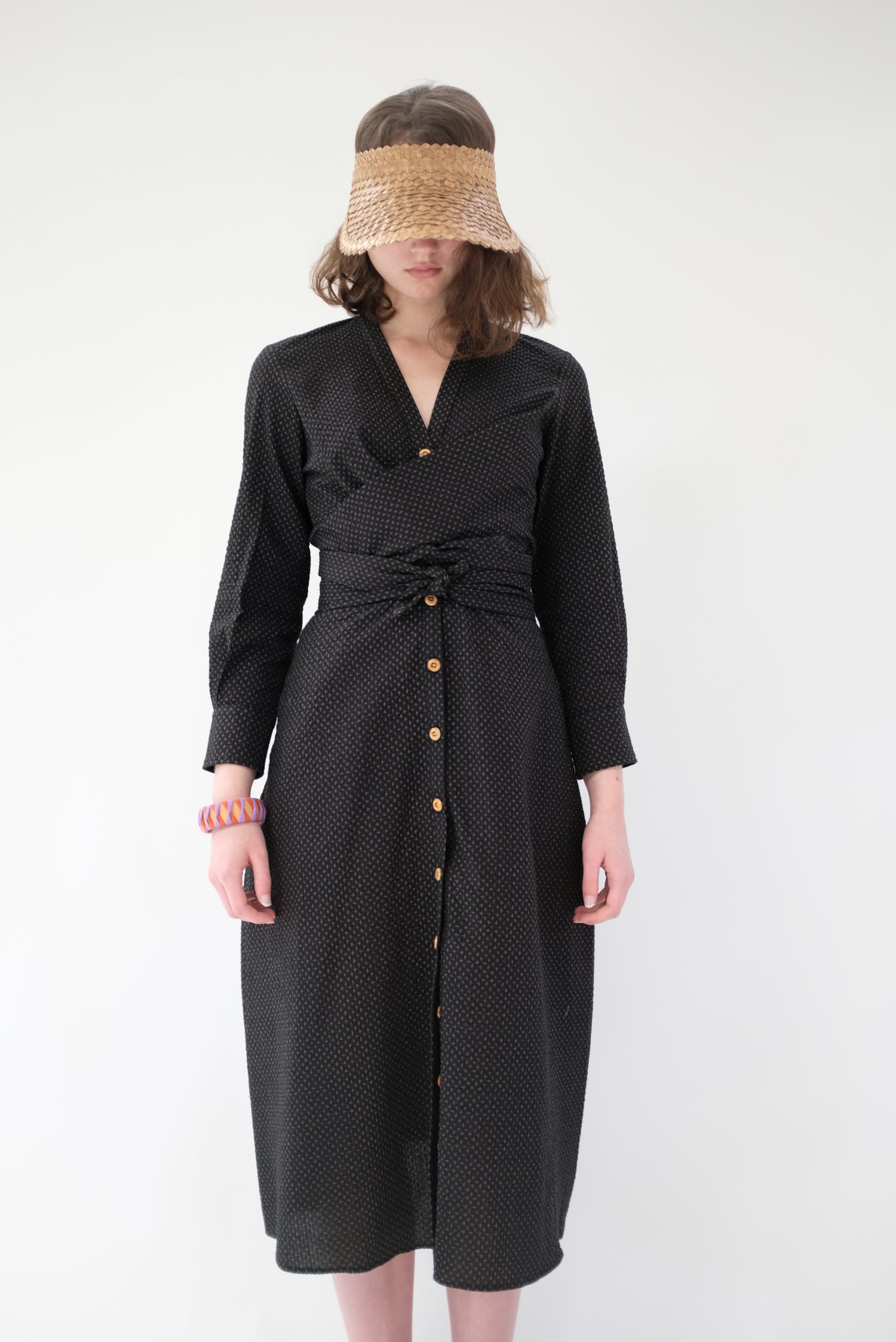 Midi dress with wooden button fastenings down front, v-neck, long sleeves with buttoned cuffs, fitted waistband. Front is designed to be crossed/tied up in the back or front, flowy midi skirt, hidden side pockets. 100% cotton.