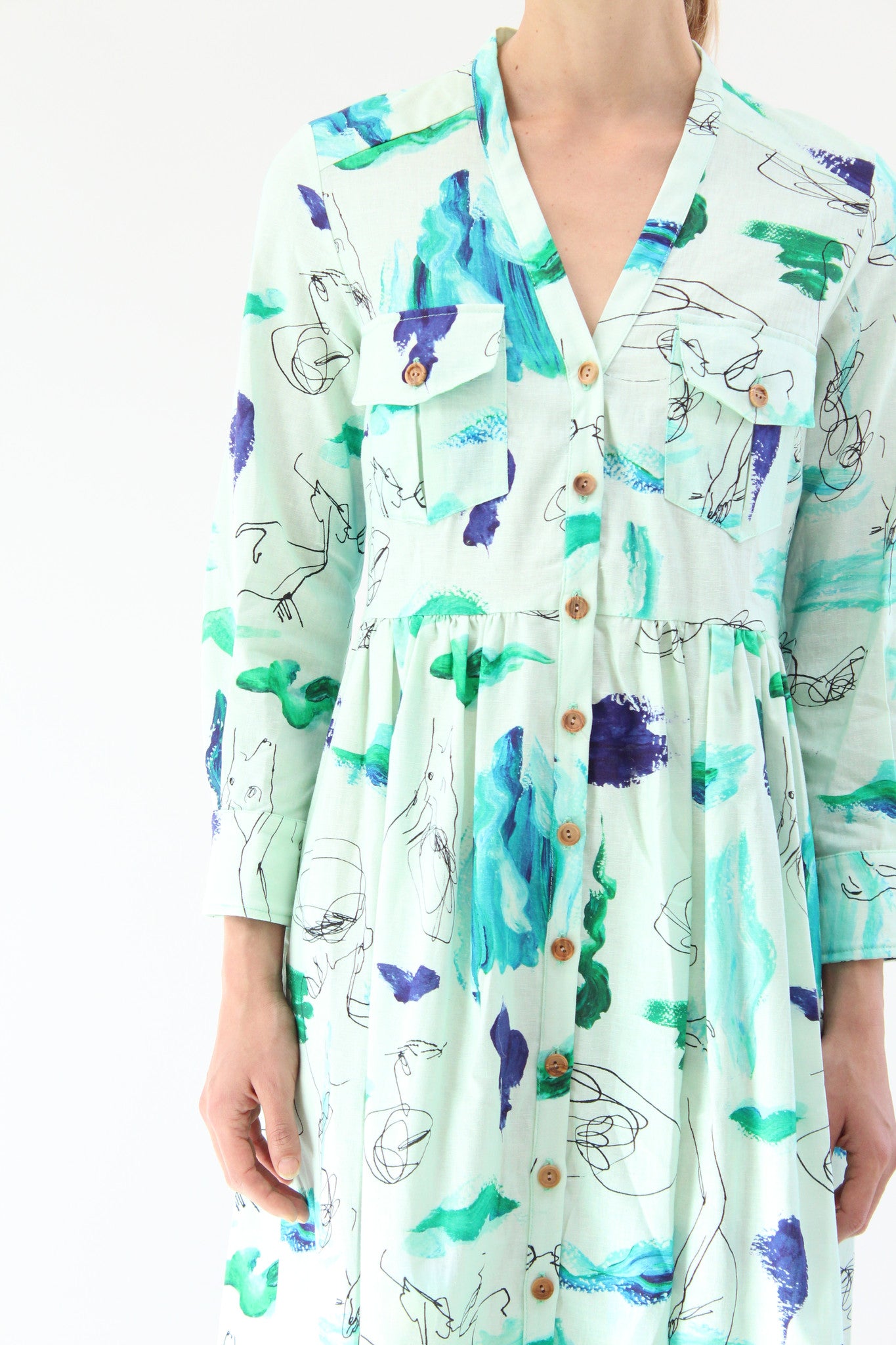 • Heinui Nico Dress Mint Strokes Scribbles Print At Beklina