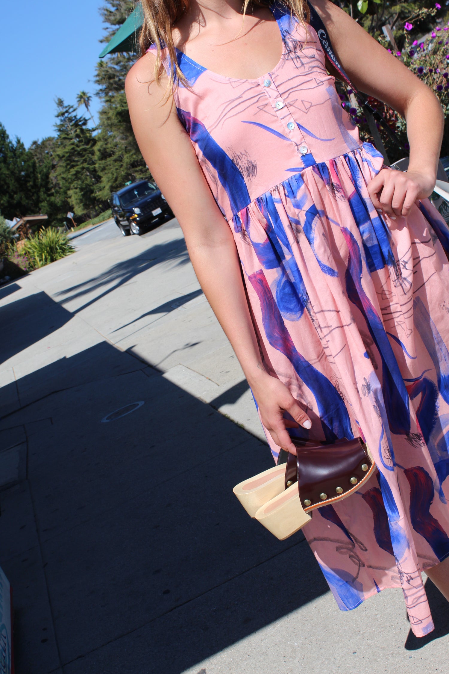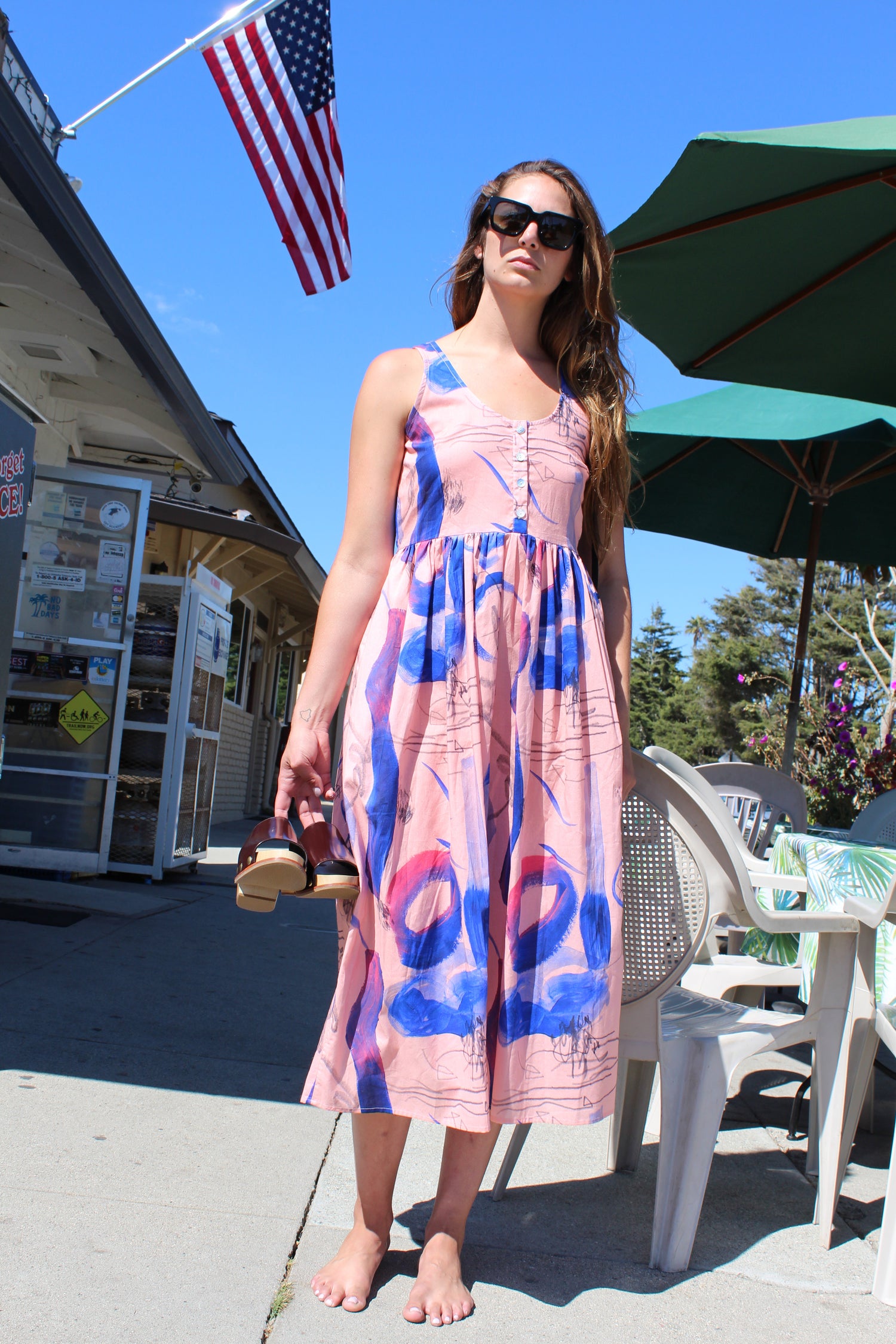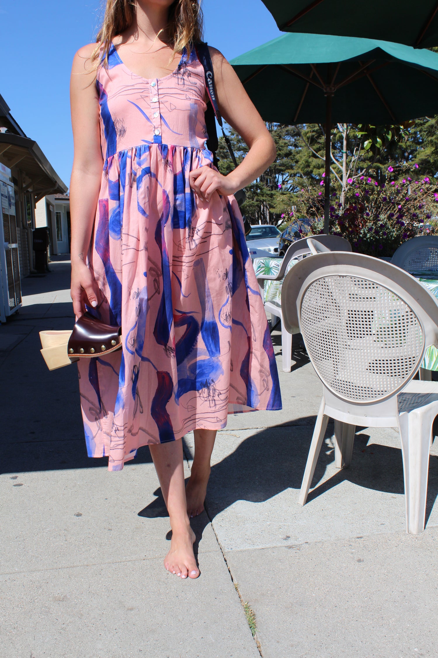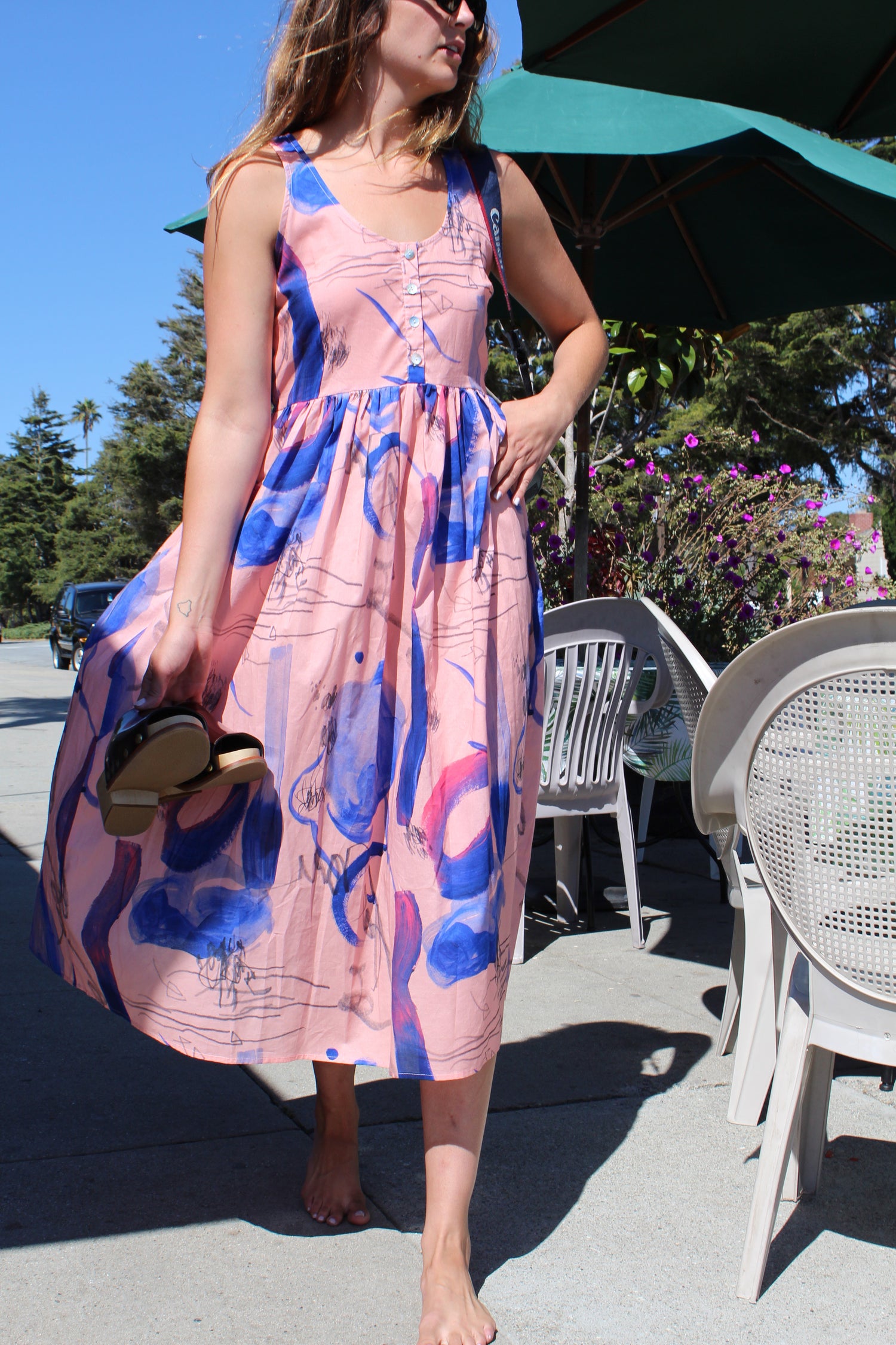 Maxi dress with mother-of-pearl button fastenings on top, gathered skirt, and elasticated back. 100% cotton, custom exclusive print. Hidden side pockets. Machine washable.