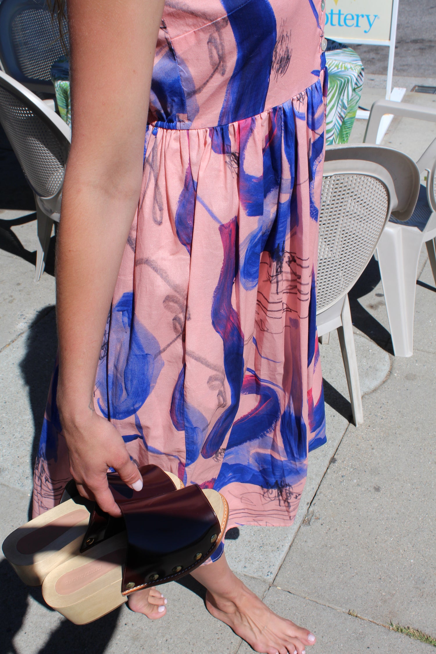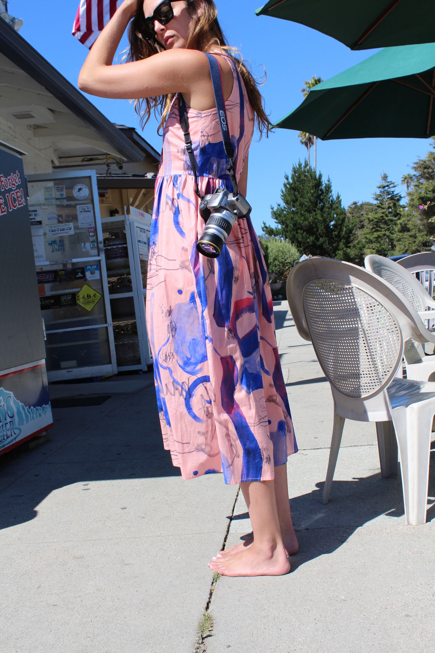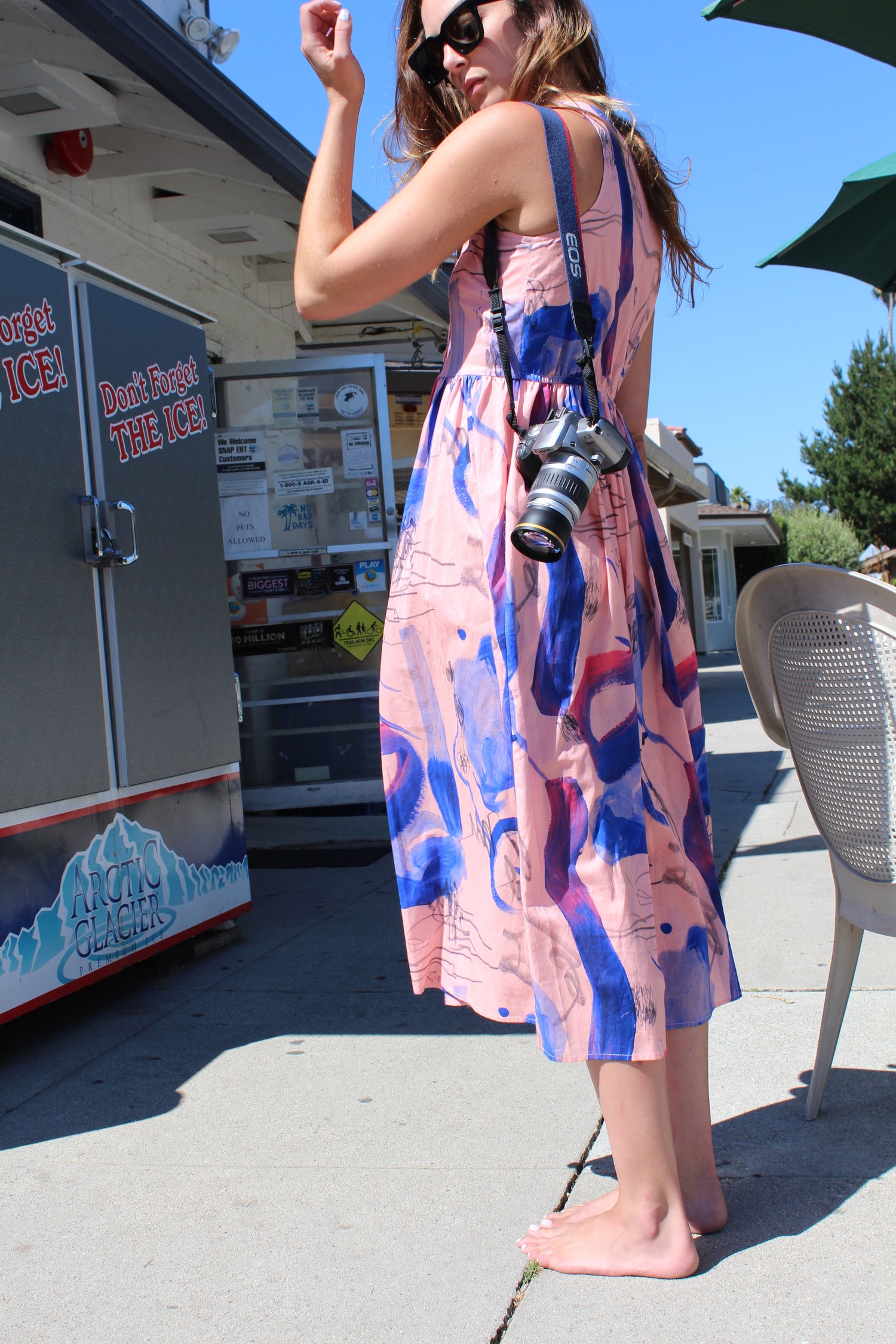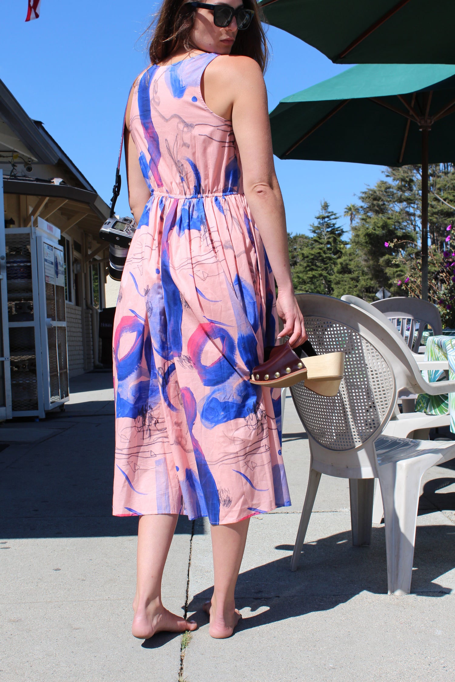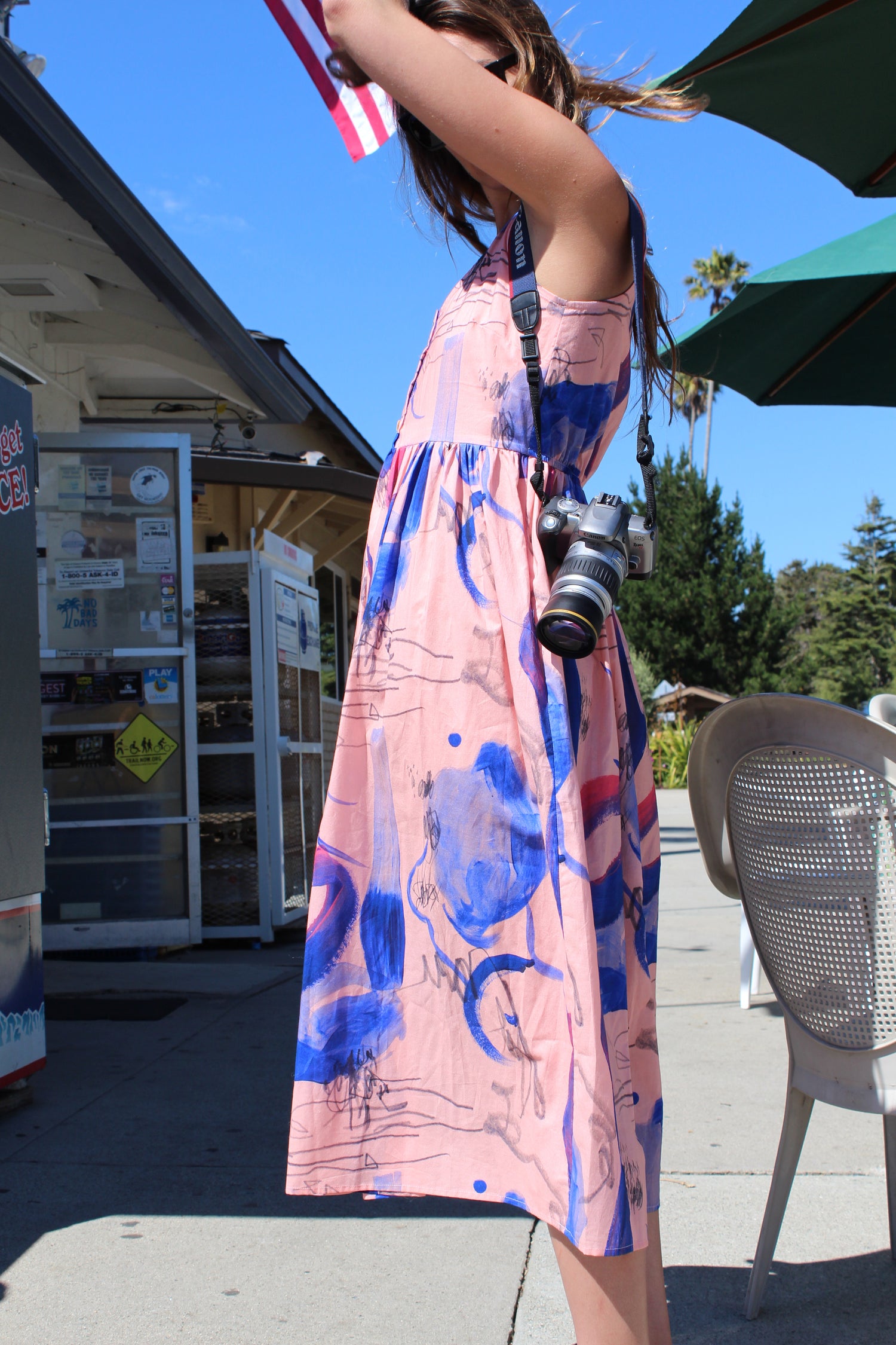 Maxi dress with mother-of-pearl button fastenings on top, gathered skirt, and elasticated back. 100% cotton, custom exclusive print. Hidden side pockets. Machine washable.