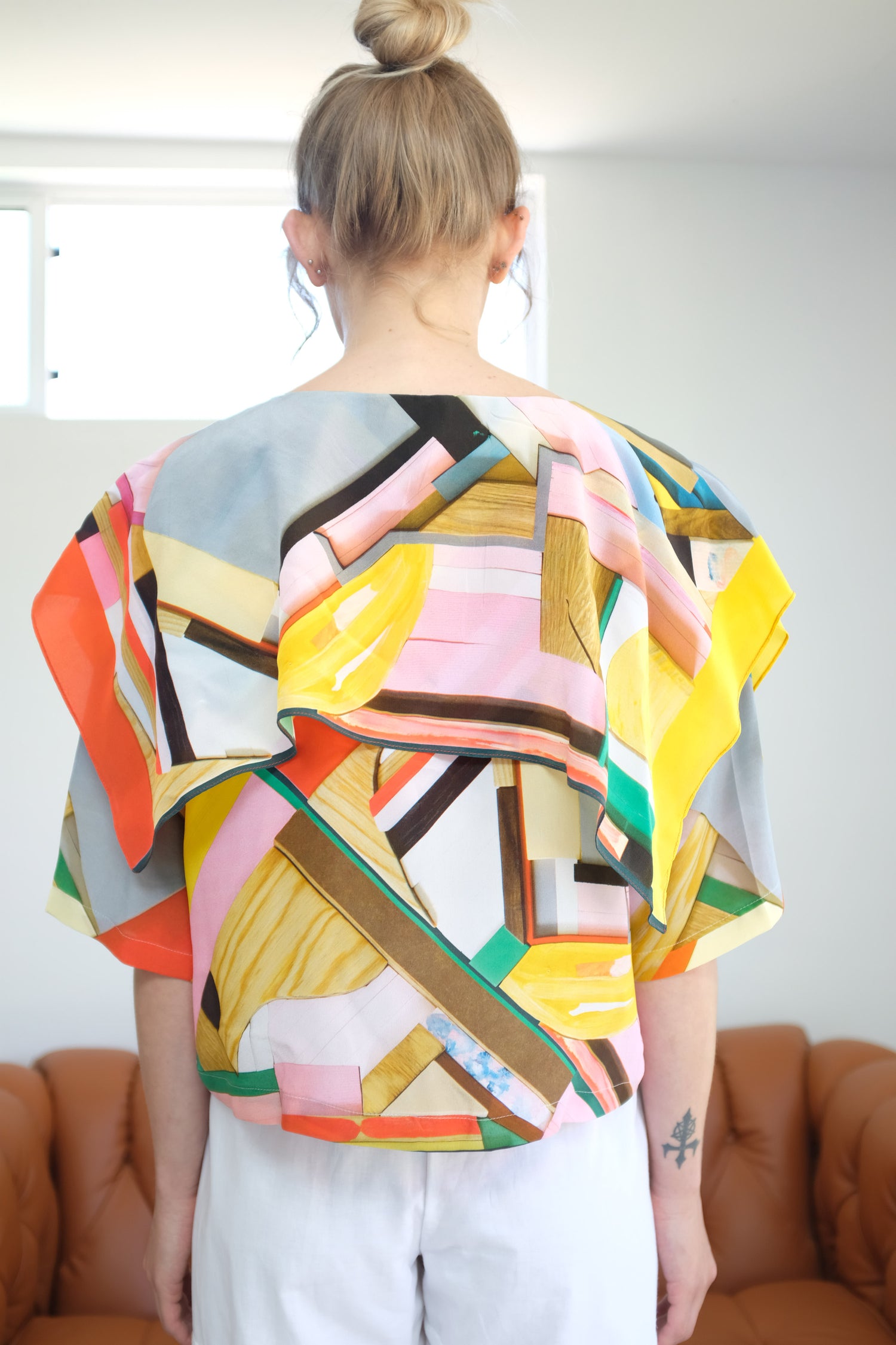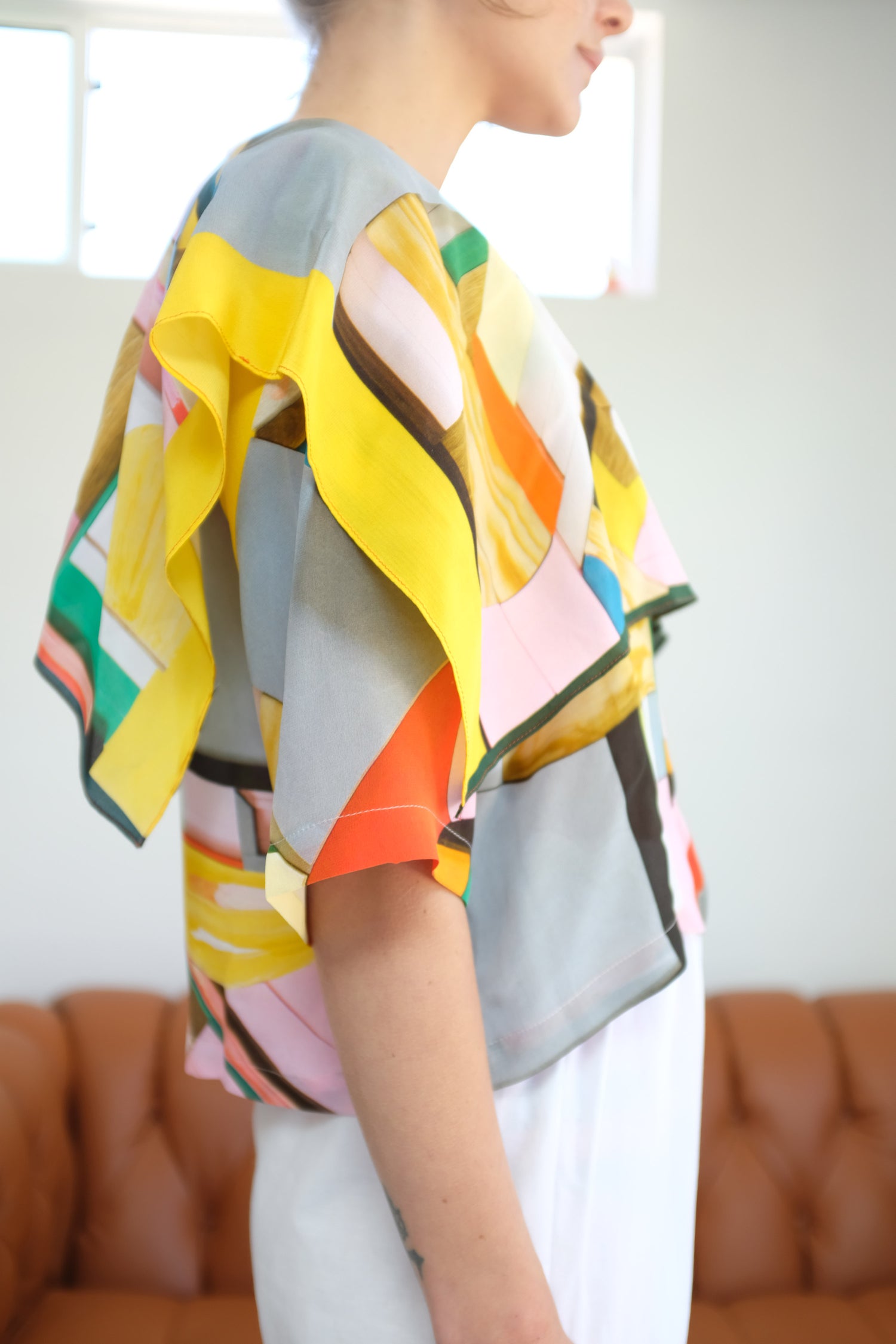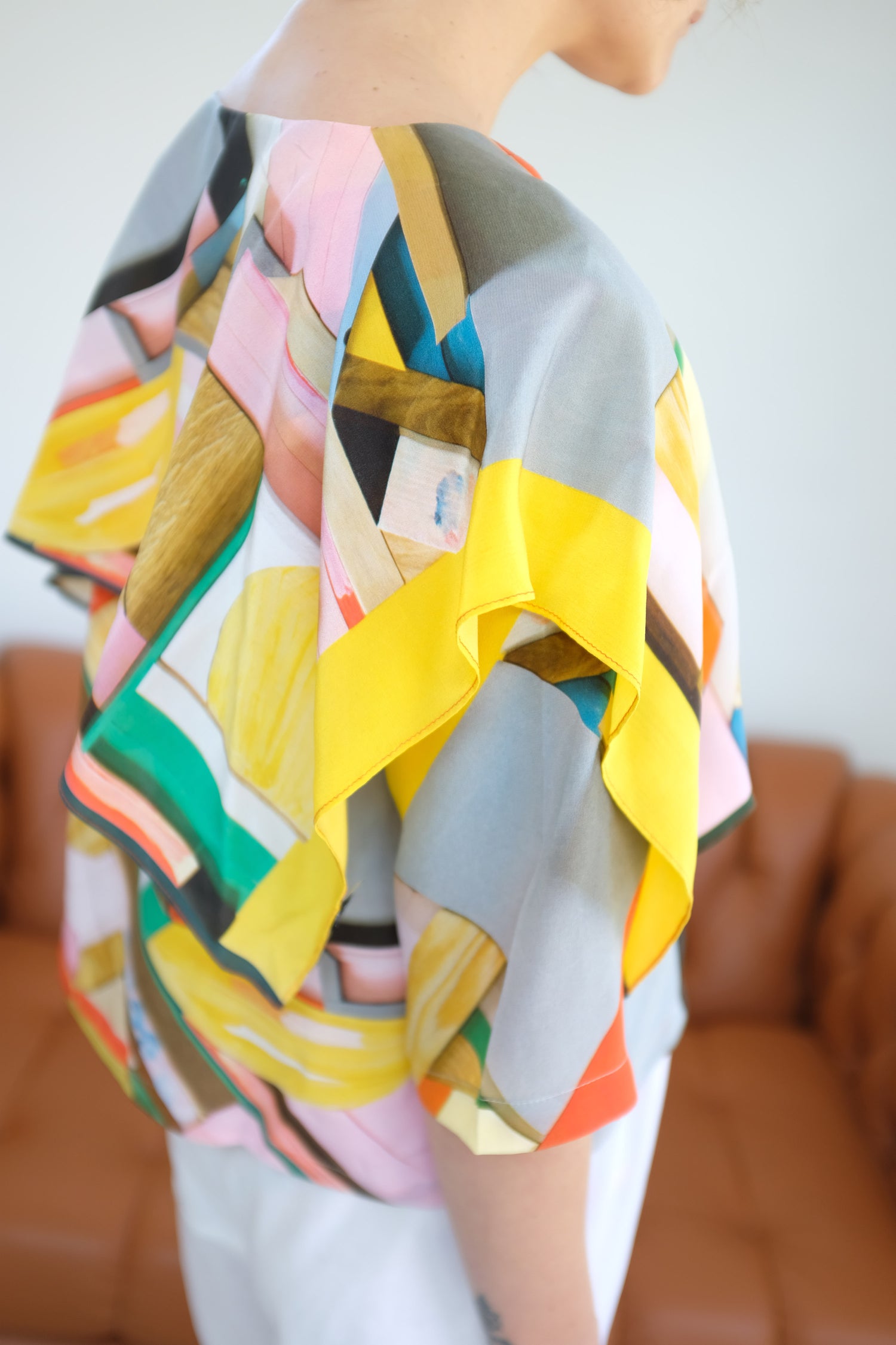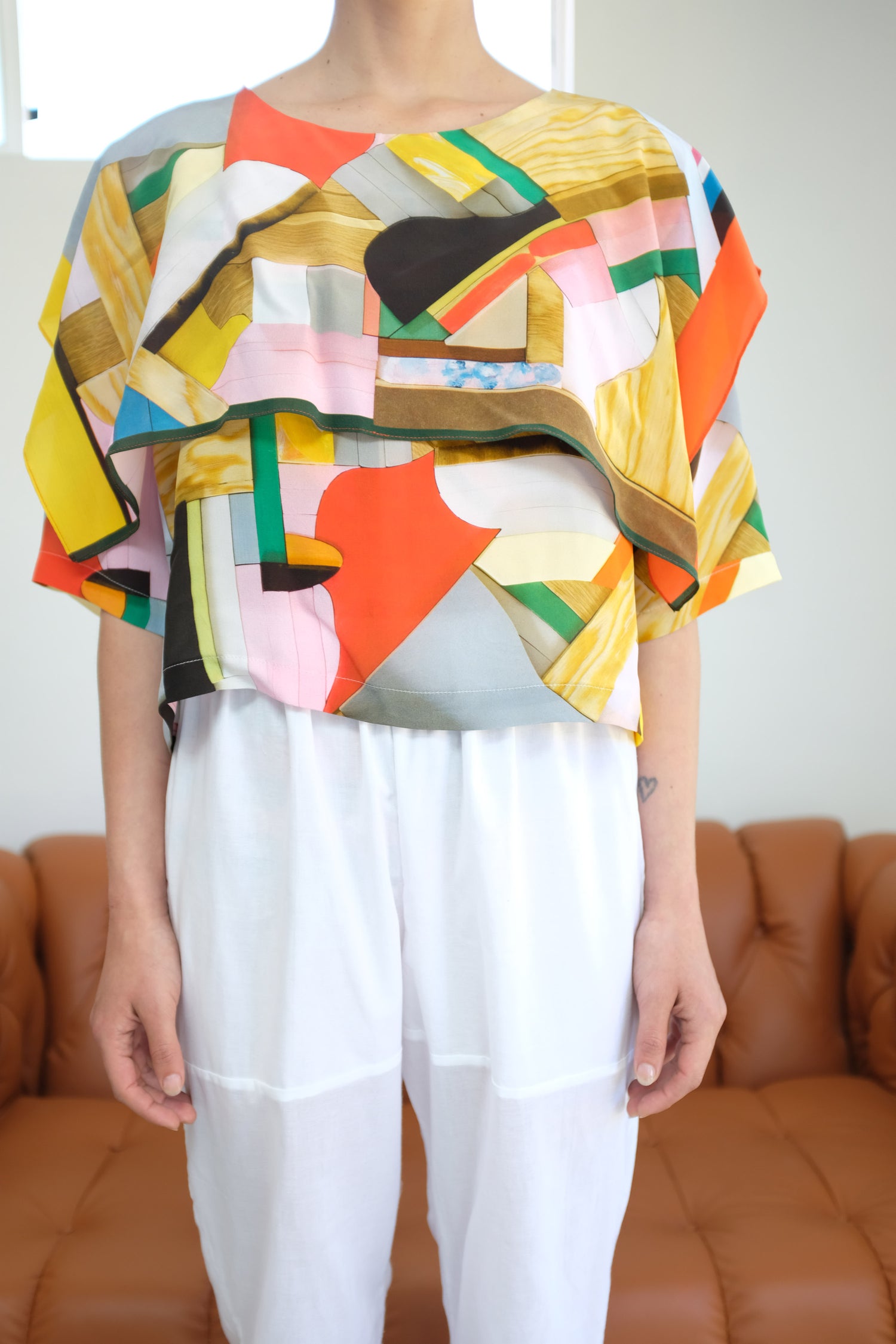 100% Silk blouse in Tonic Colorful print. Flowy scarf top. Runs true to size. Model is wearing a size small. Exclusive to Beklina.