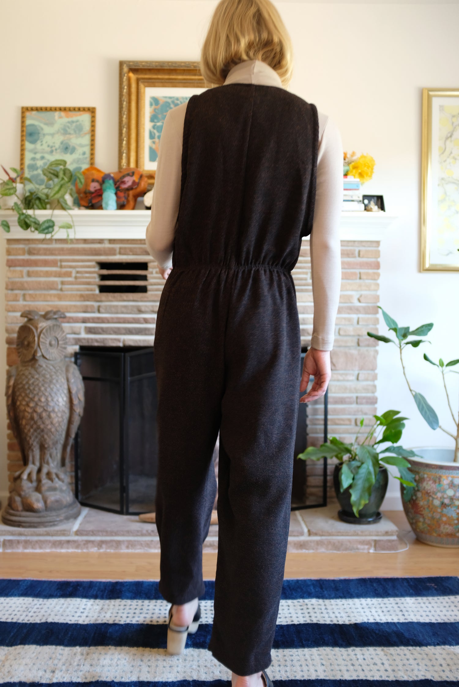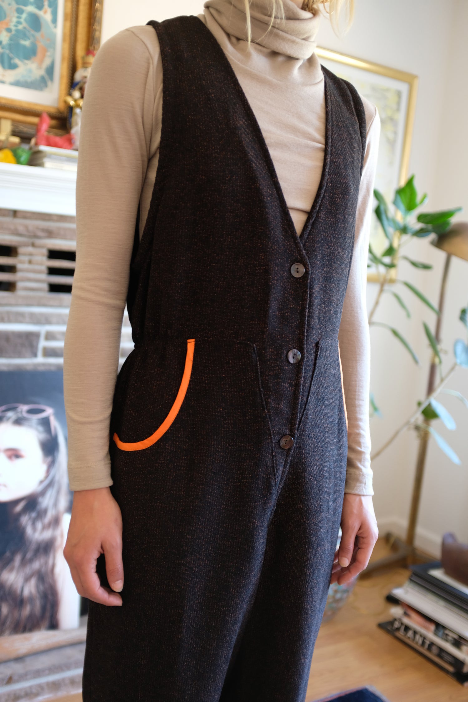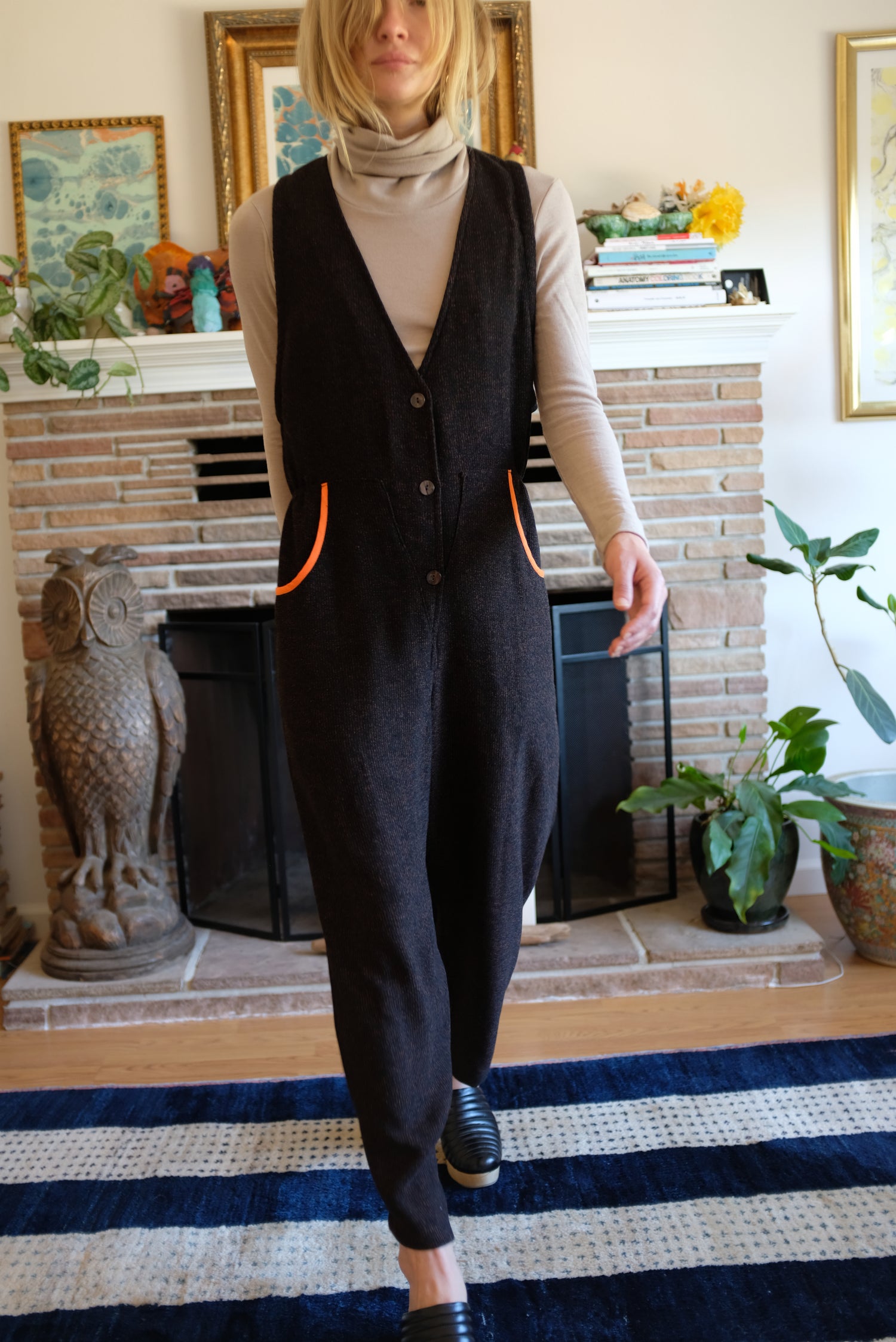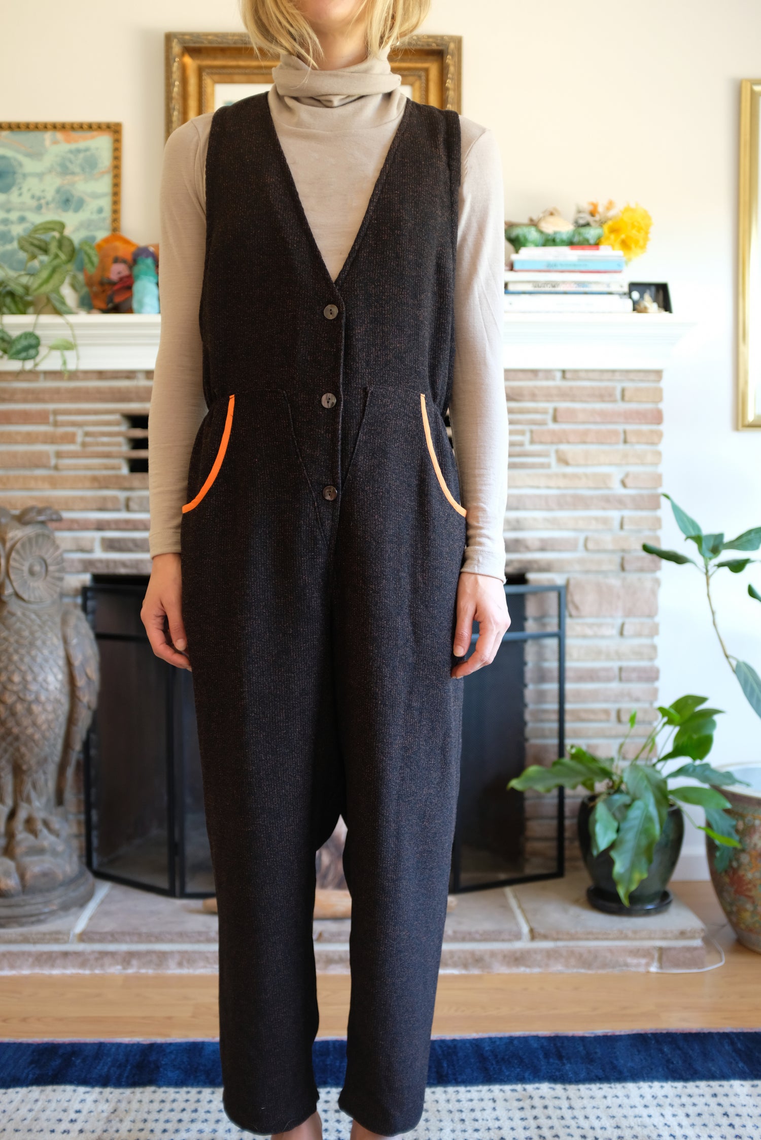 Comfy overall jumper. Deep v-neck and arm openings, button down front, two front pockets, slight elastic waist. Black and brown with orange accents and ribbing. 50% Viscose, 40% Polyester, 10% Wool.