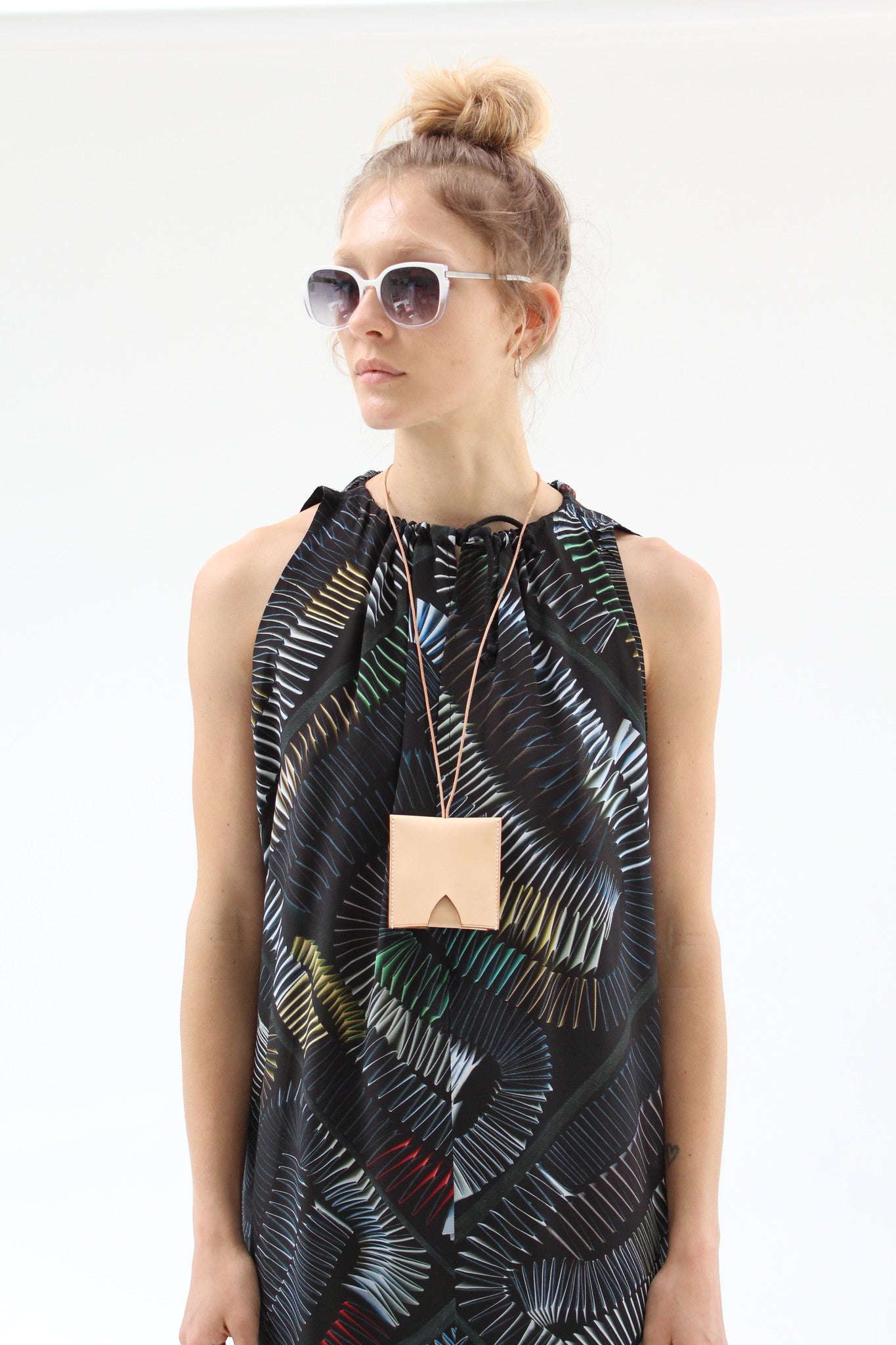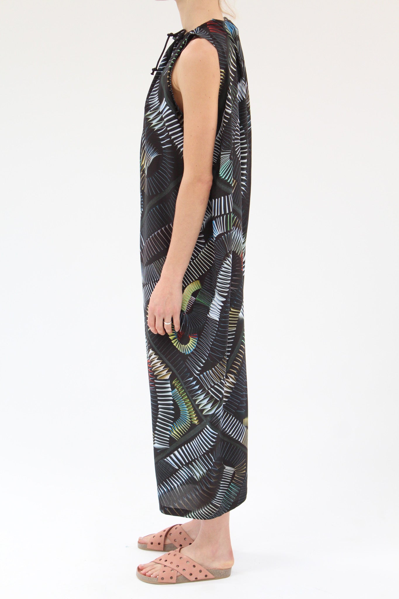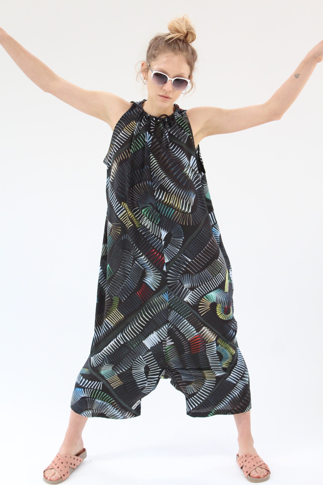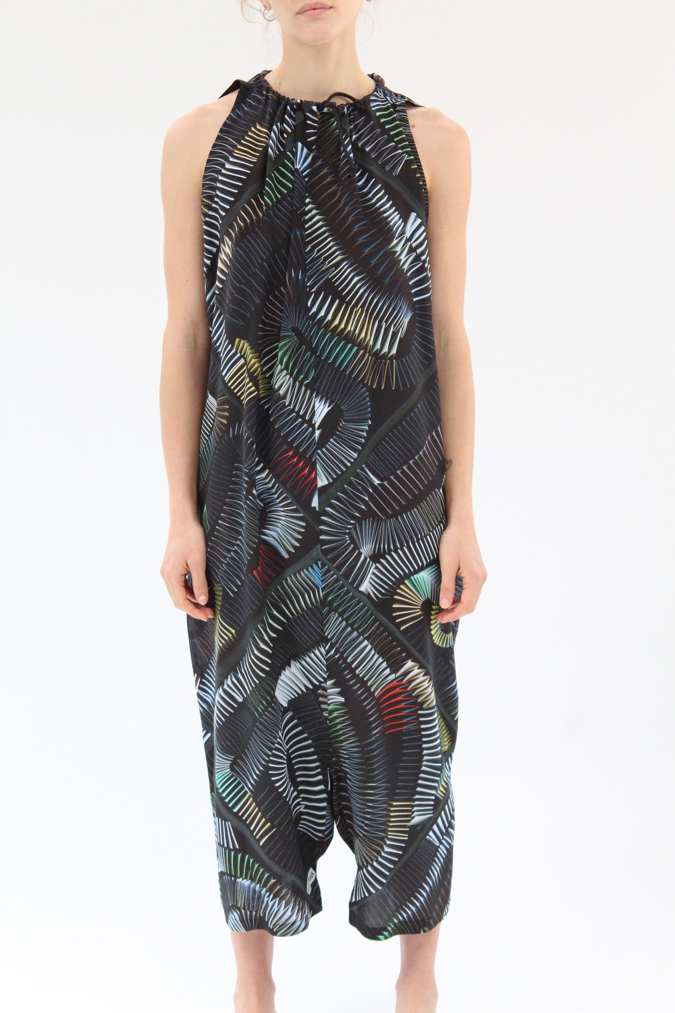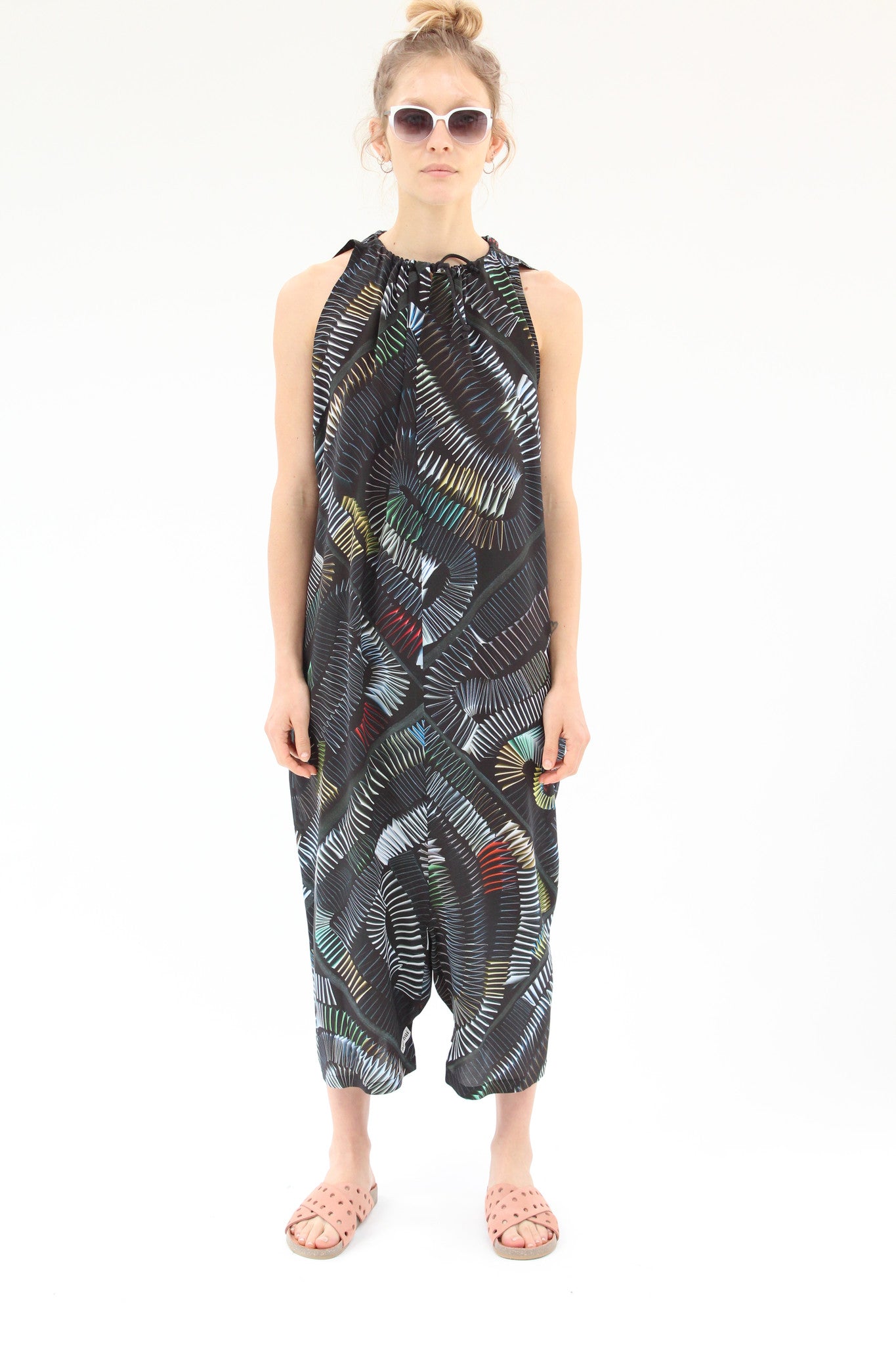 100% silk dress that has a secret; it's actually pants or rather a jumper. Adjustable neck drawstring tie front. Loose blousy fit. One size fits most. Exclusive to Beklina.
