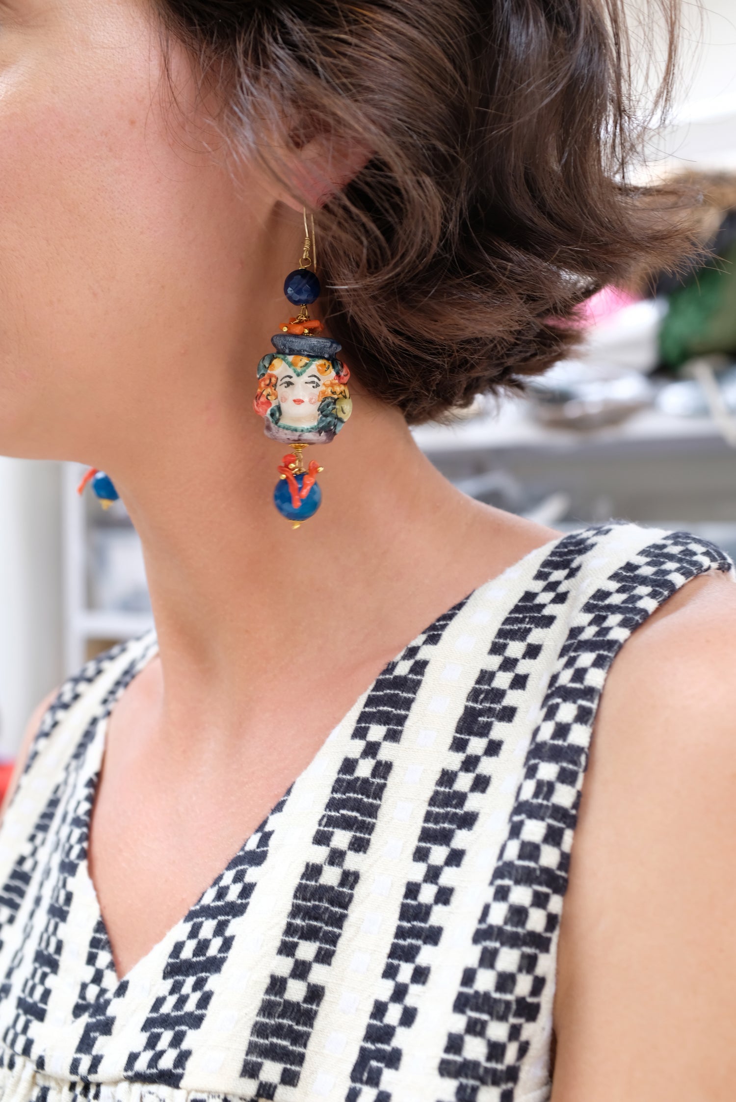 Painted by hand in Sicily, Italy. Each is one of a kind. Ceramic, 14K gold filled hooks, coral. Easy to wear, not heavy. Make's a special gift for someone who has it all.