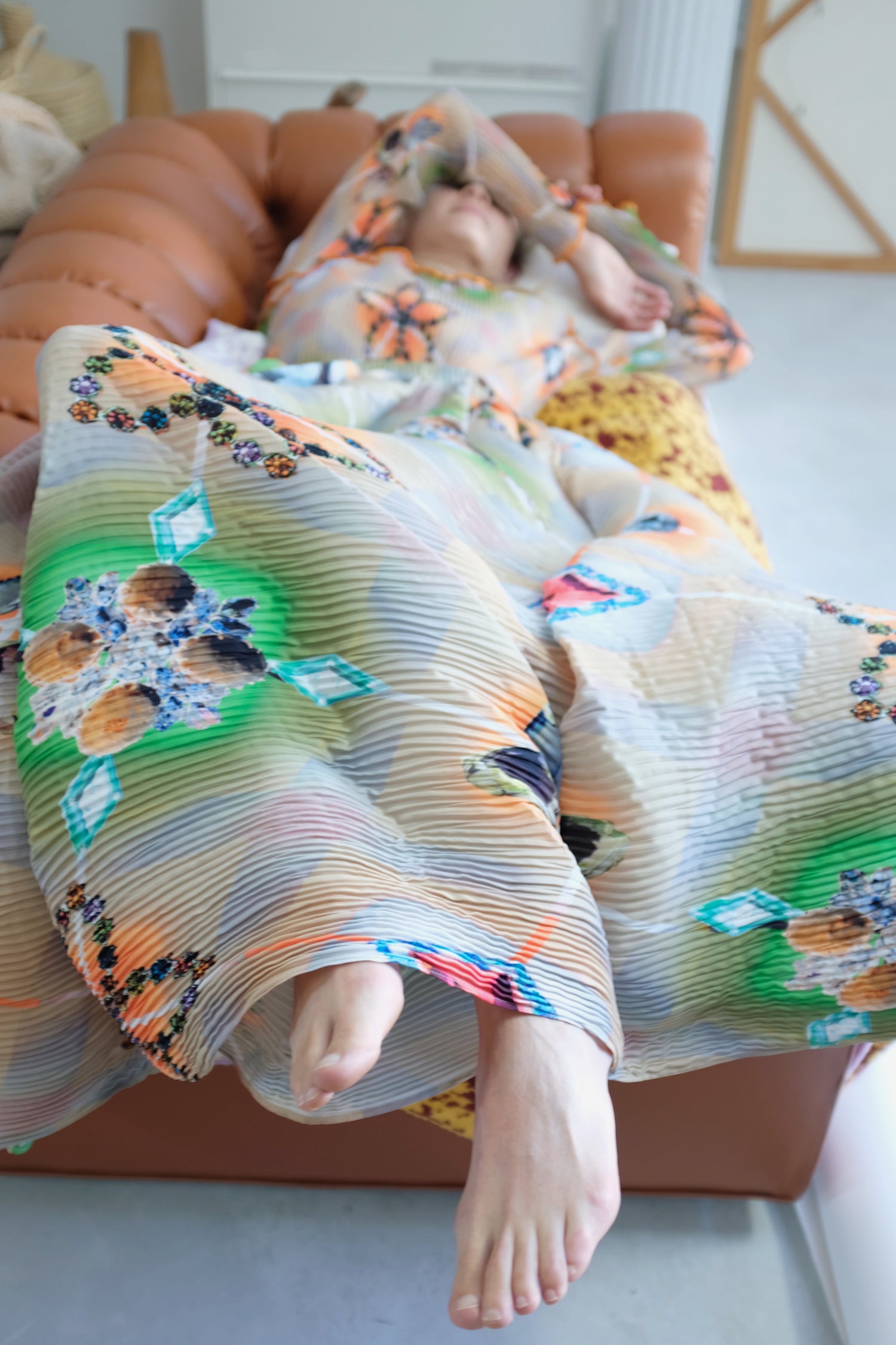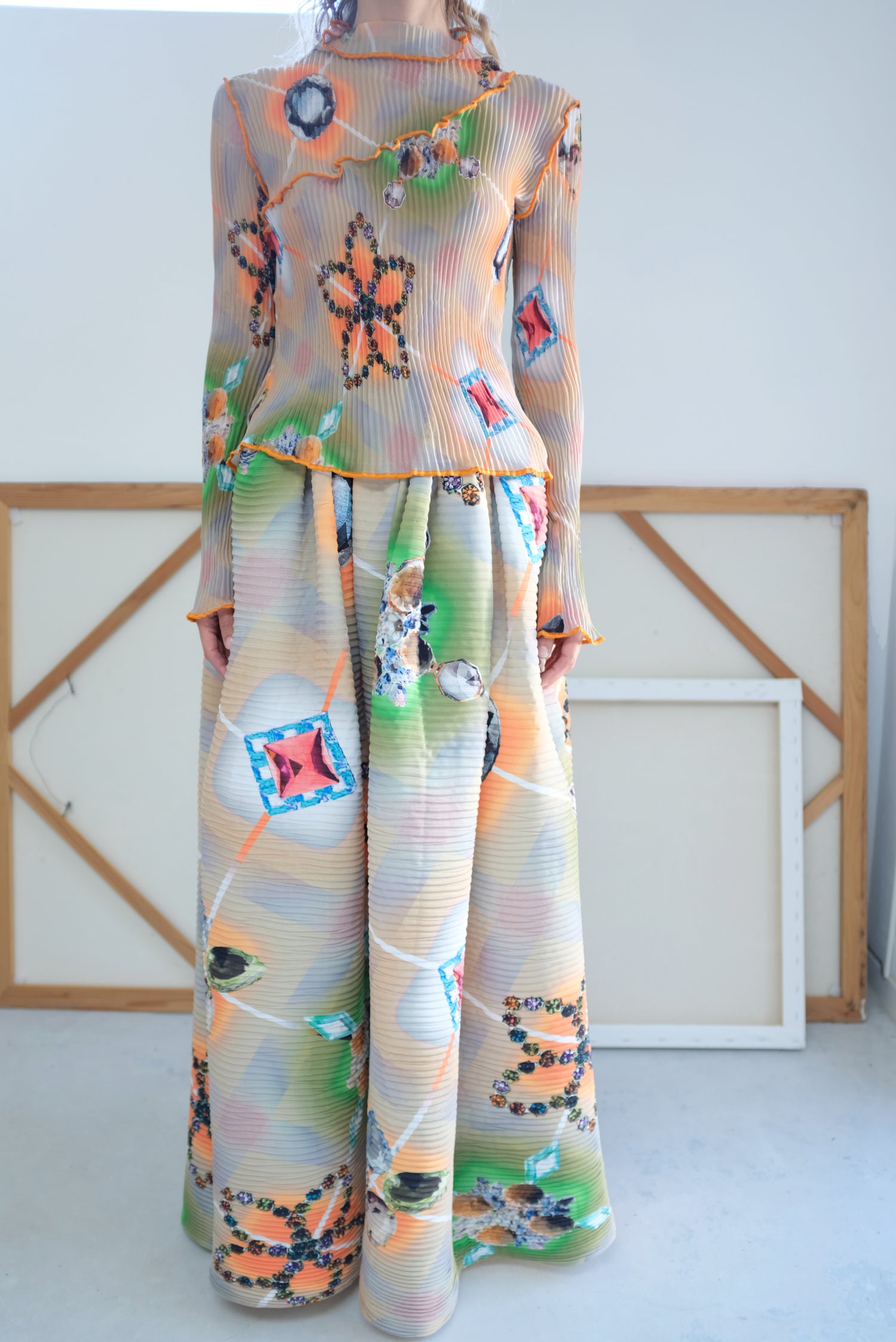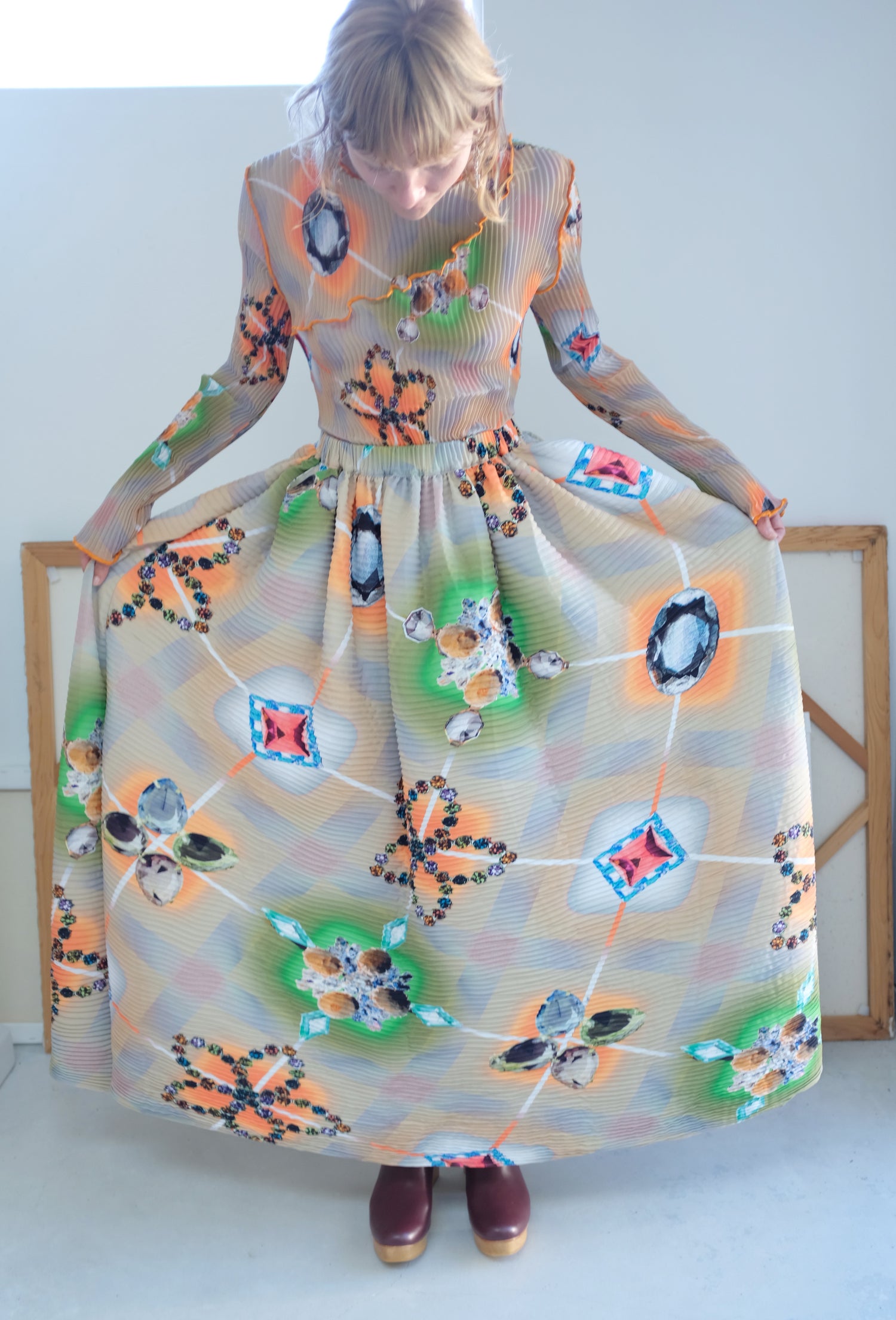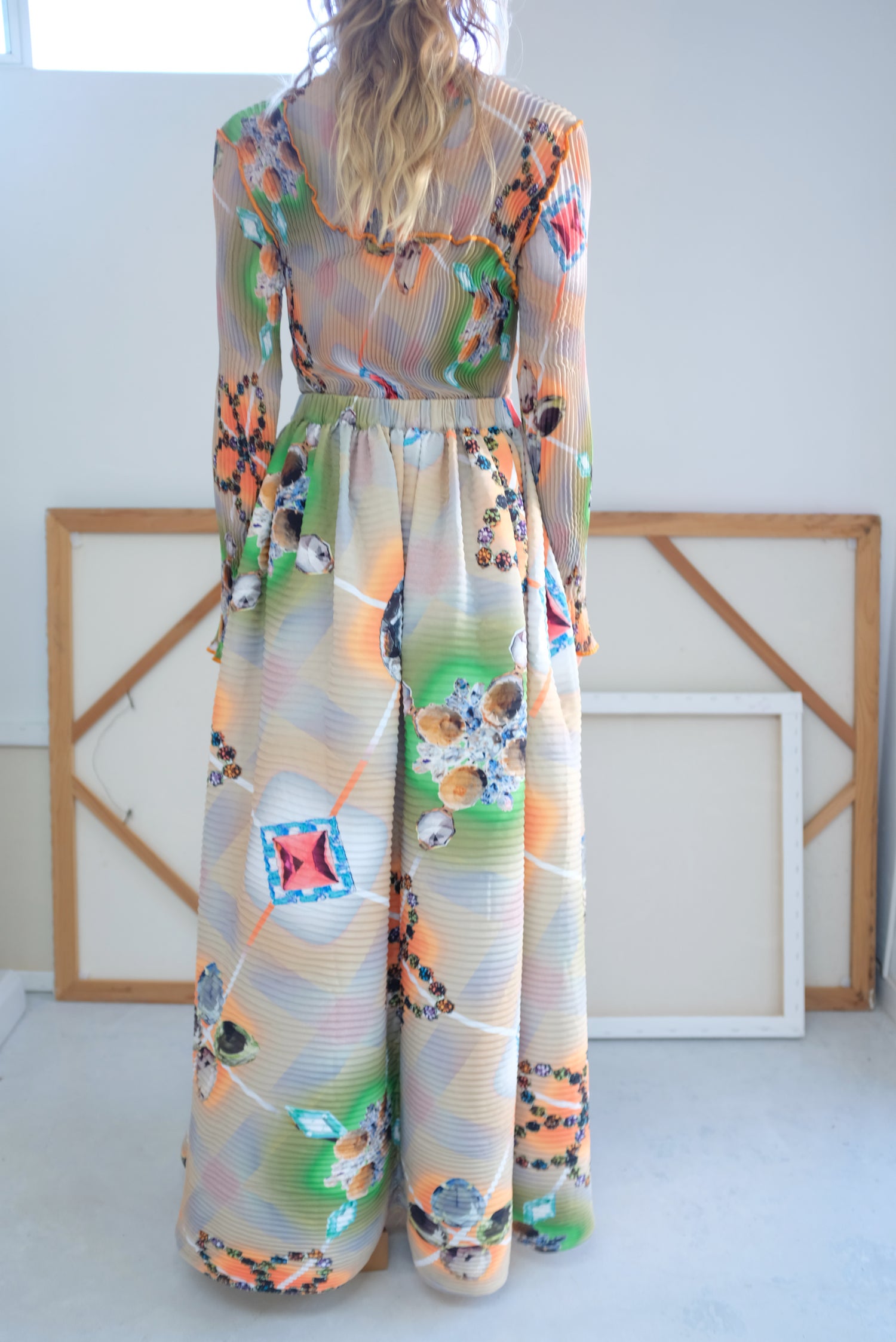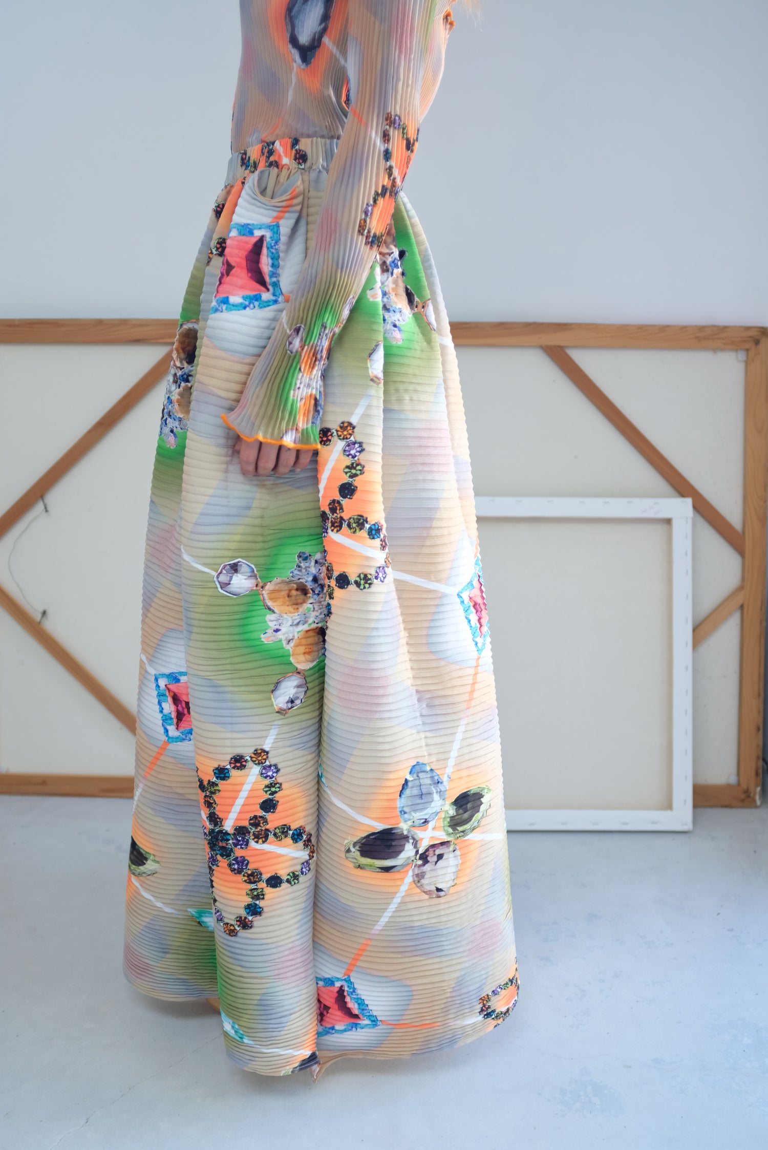 Beautiful hand made full skirt. Very limited edition. Hand pleated using arashi shibori technique. Pattern placement, pleating and measurements vary as each skirt is handmade individually. Gentle elastic waist, two front pockets. One size fits most. 100% PES Chiffon.