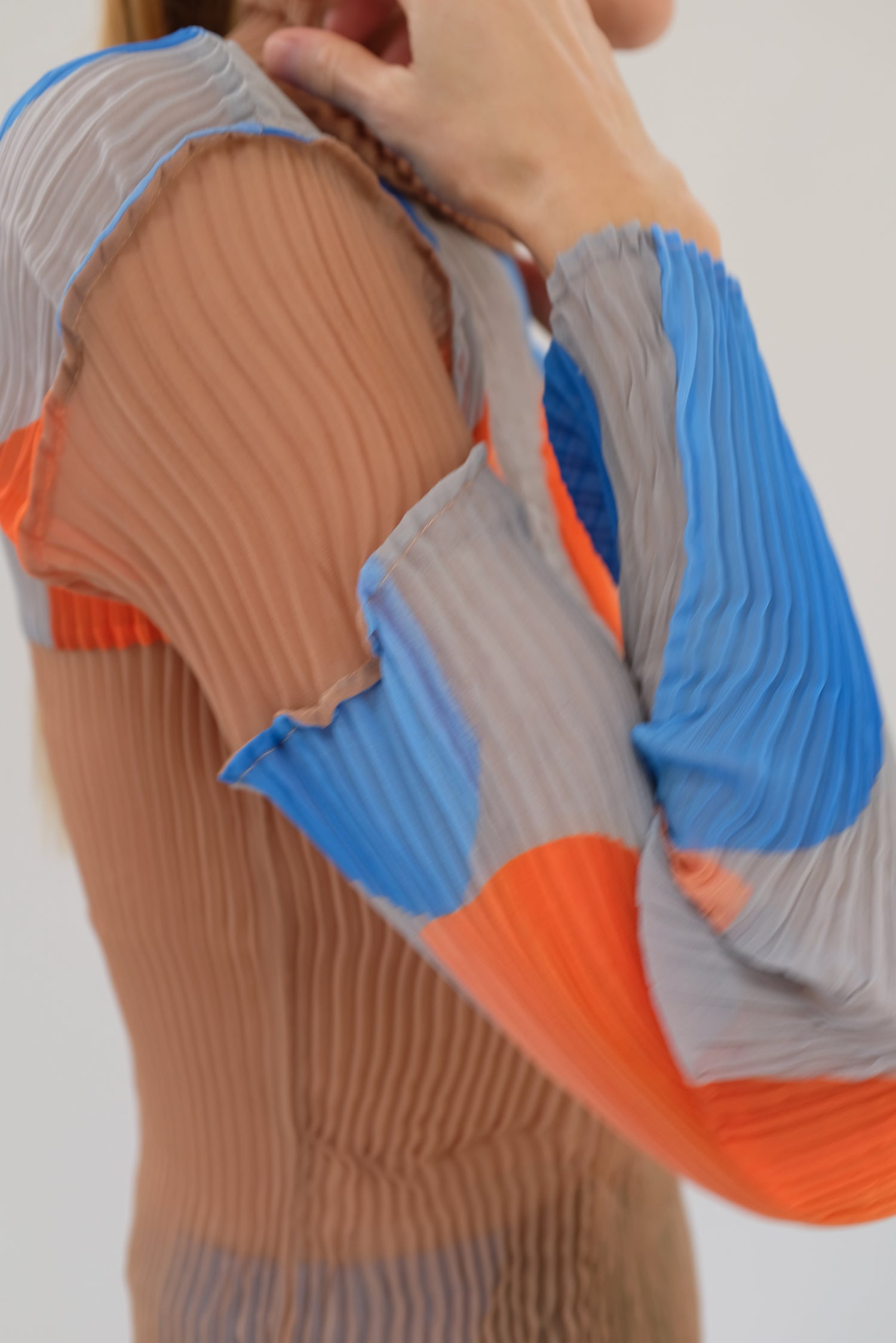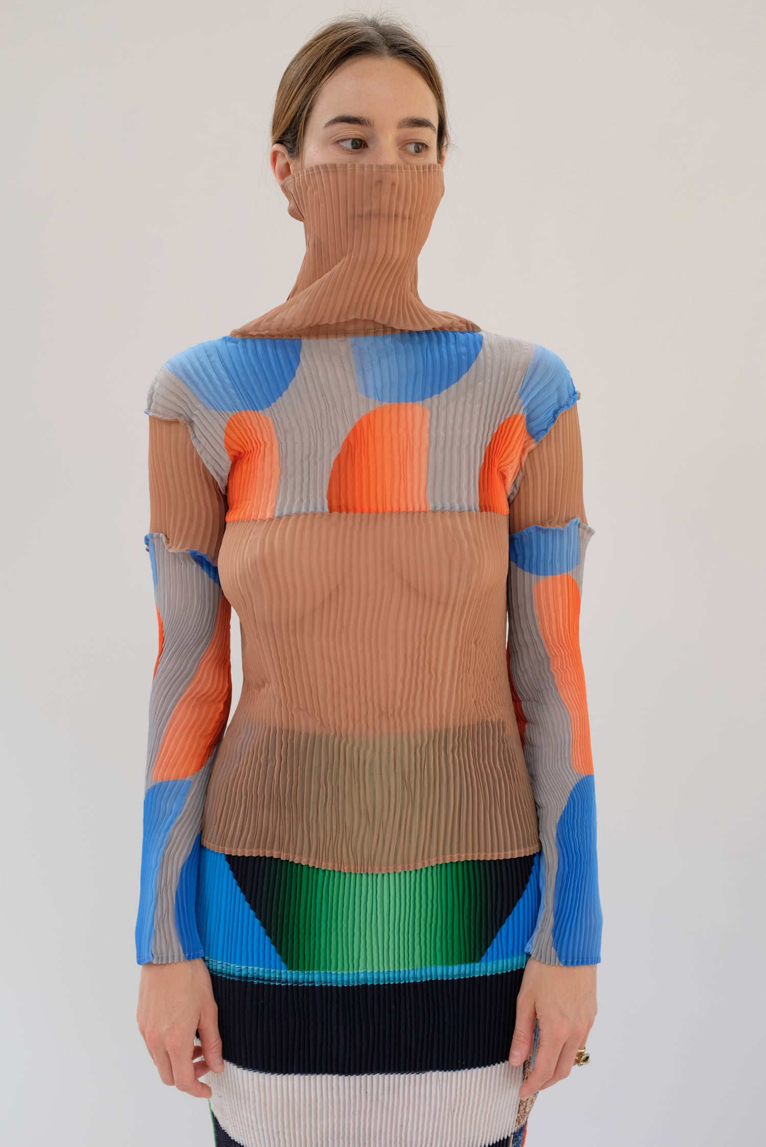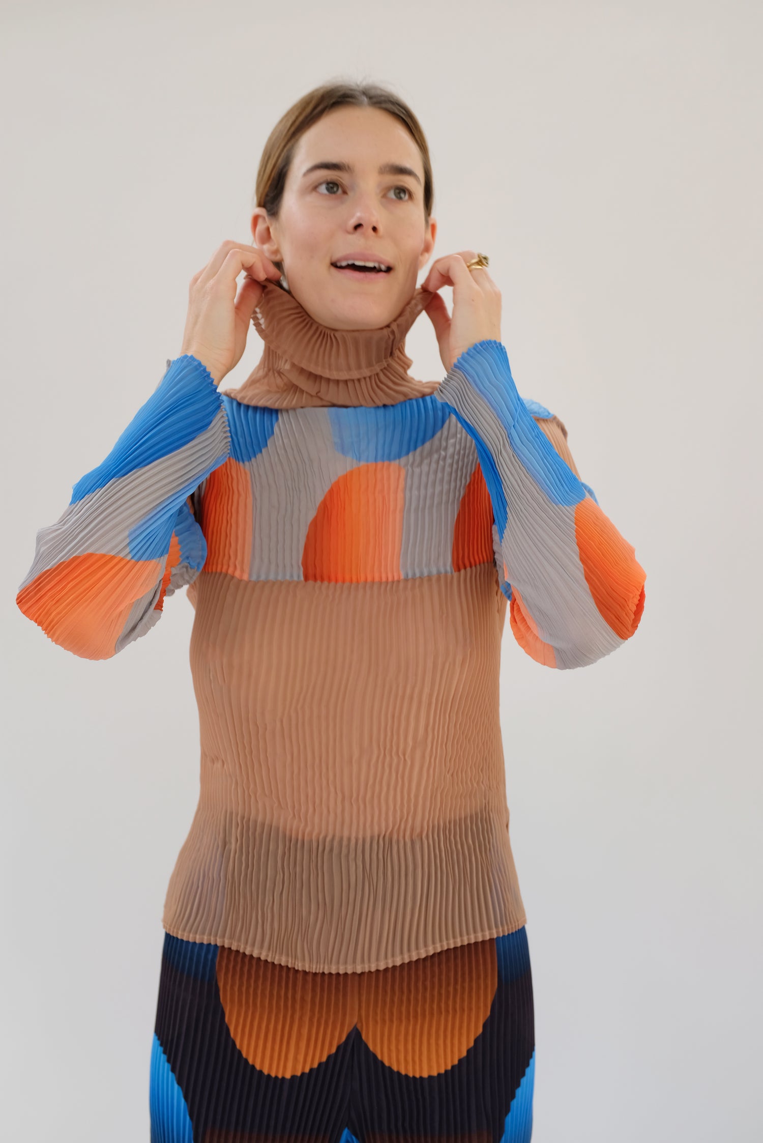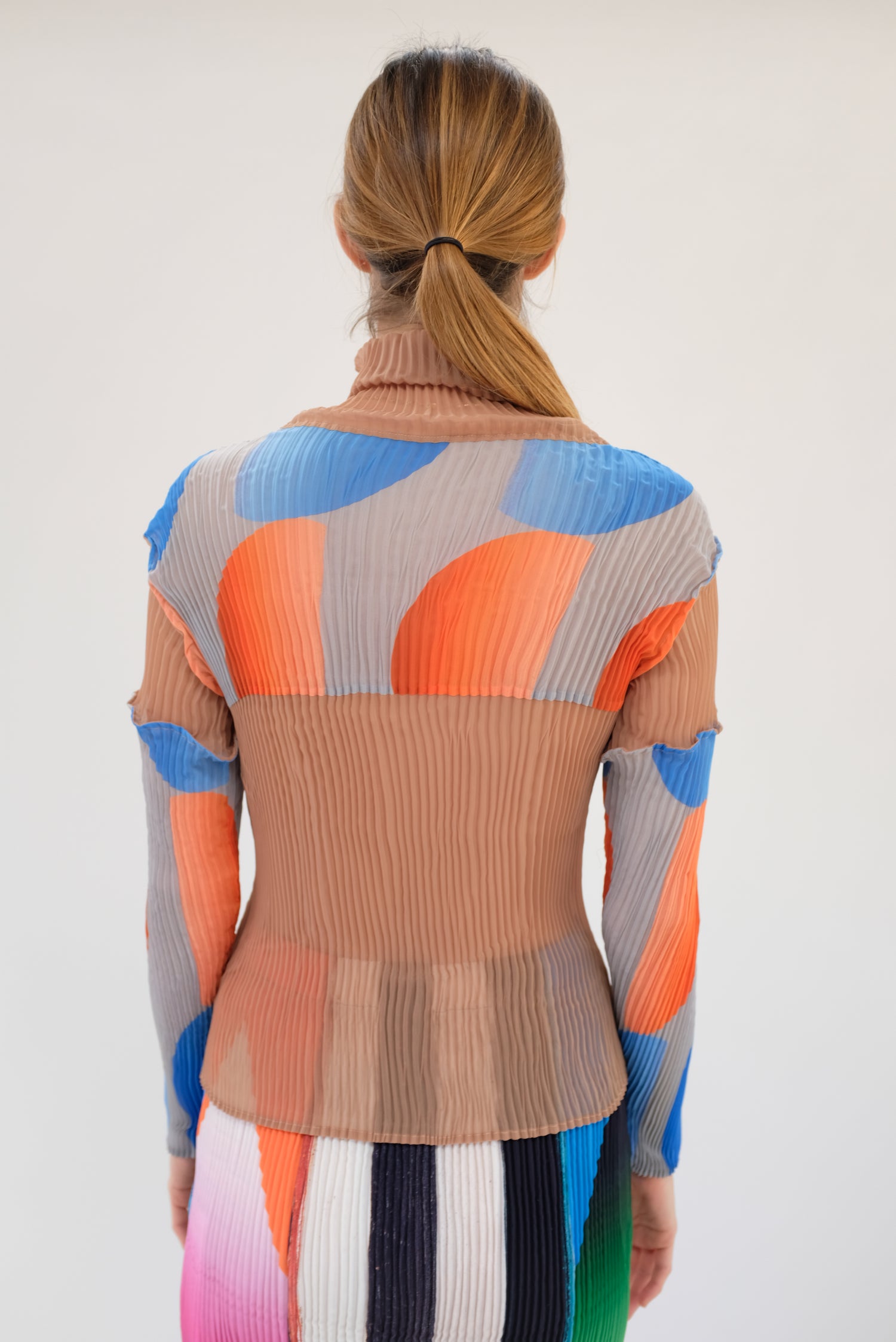 Beautiful hand dyed turtleneck. Hand pleated using arashi shibori technique. Pattern placement, pleating and measurements vary as each top is handmade individually. Slightly sheer. One size fits most. 100% PES Chiffon.
