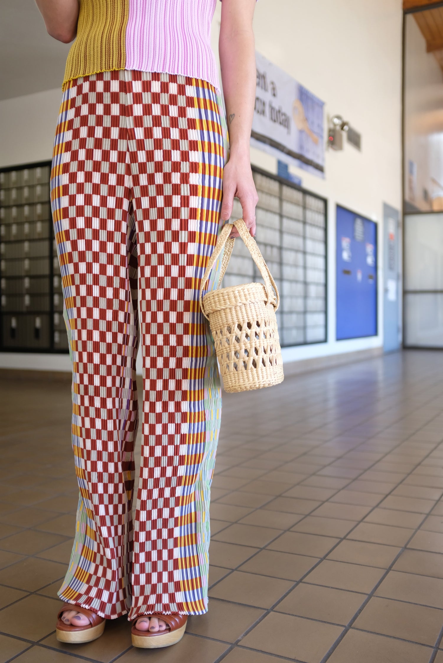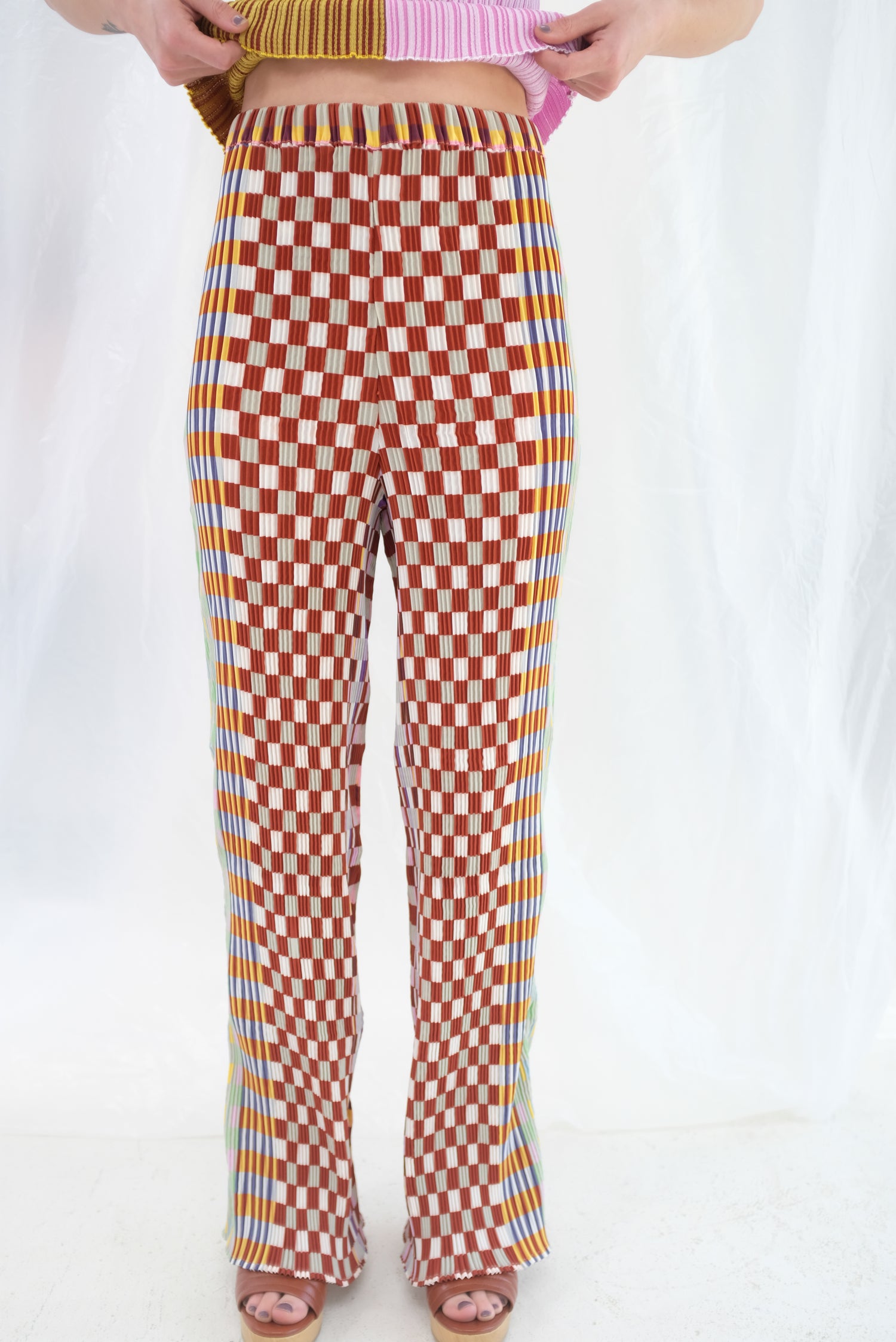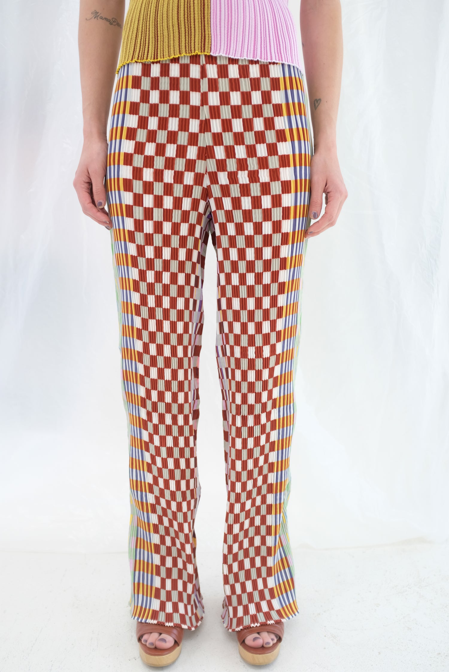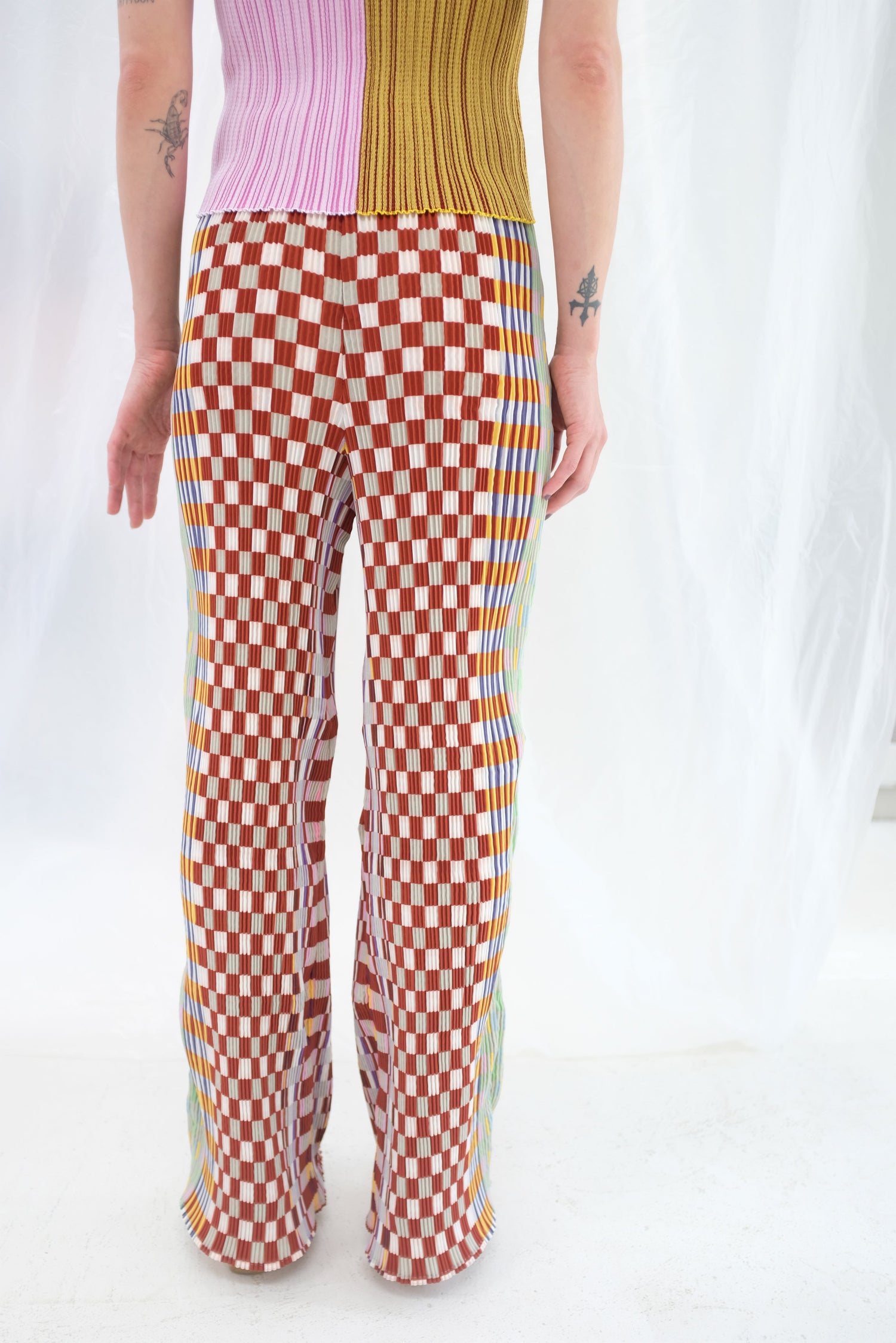 Beautiful hand made and dyed pants, limited edition. Hand pleated using arashi shibori technique. Pattern placement, pleating and measurements vary as each pant is handmade individually by designer. Slightly flared hem and elastic high-waist band. One size fits most. 100% PES Chiffon.