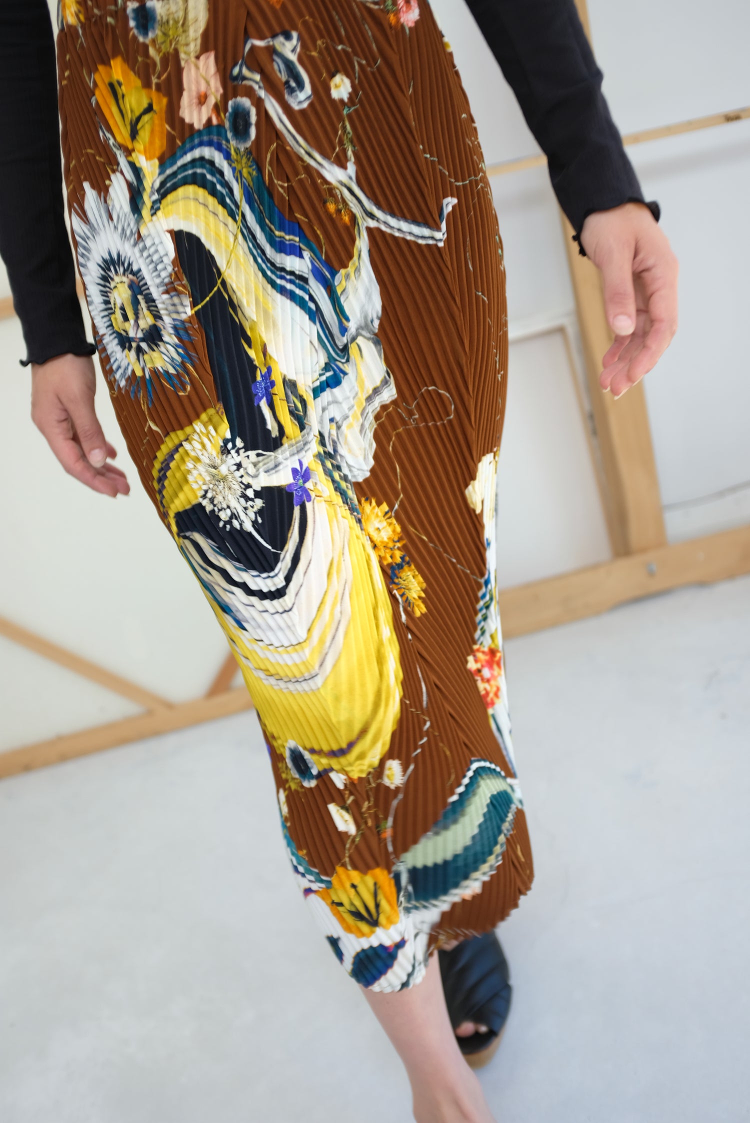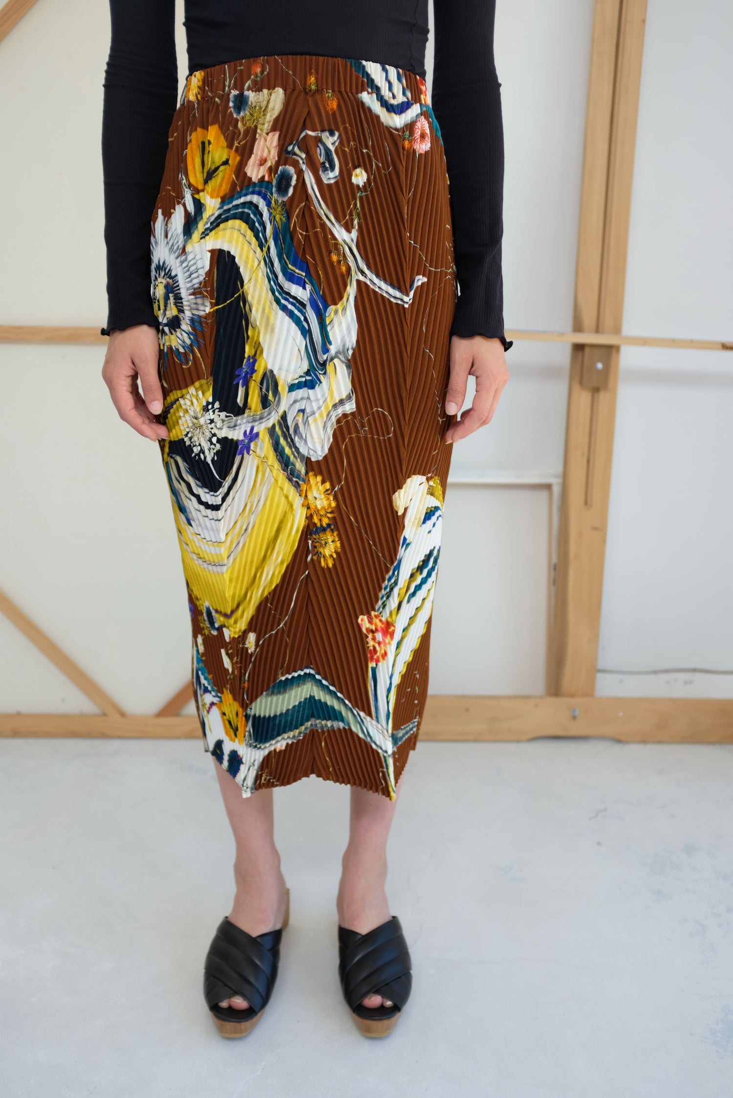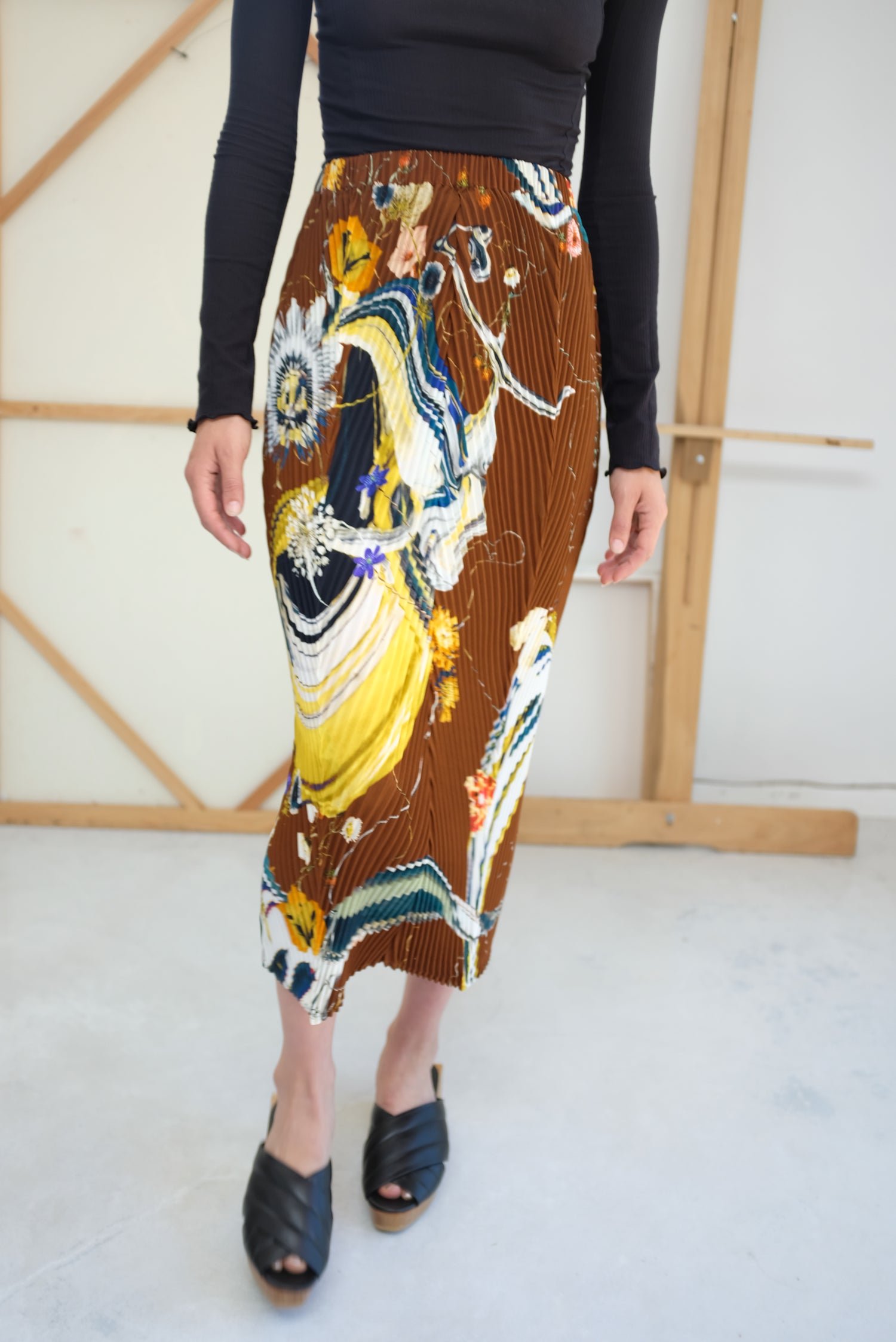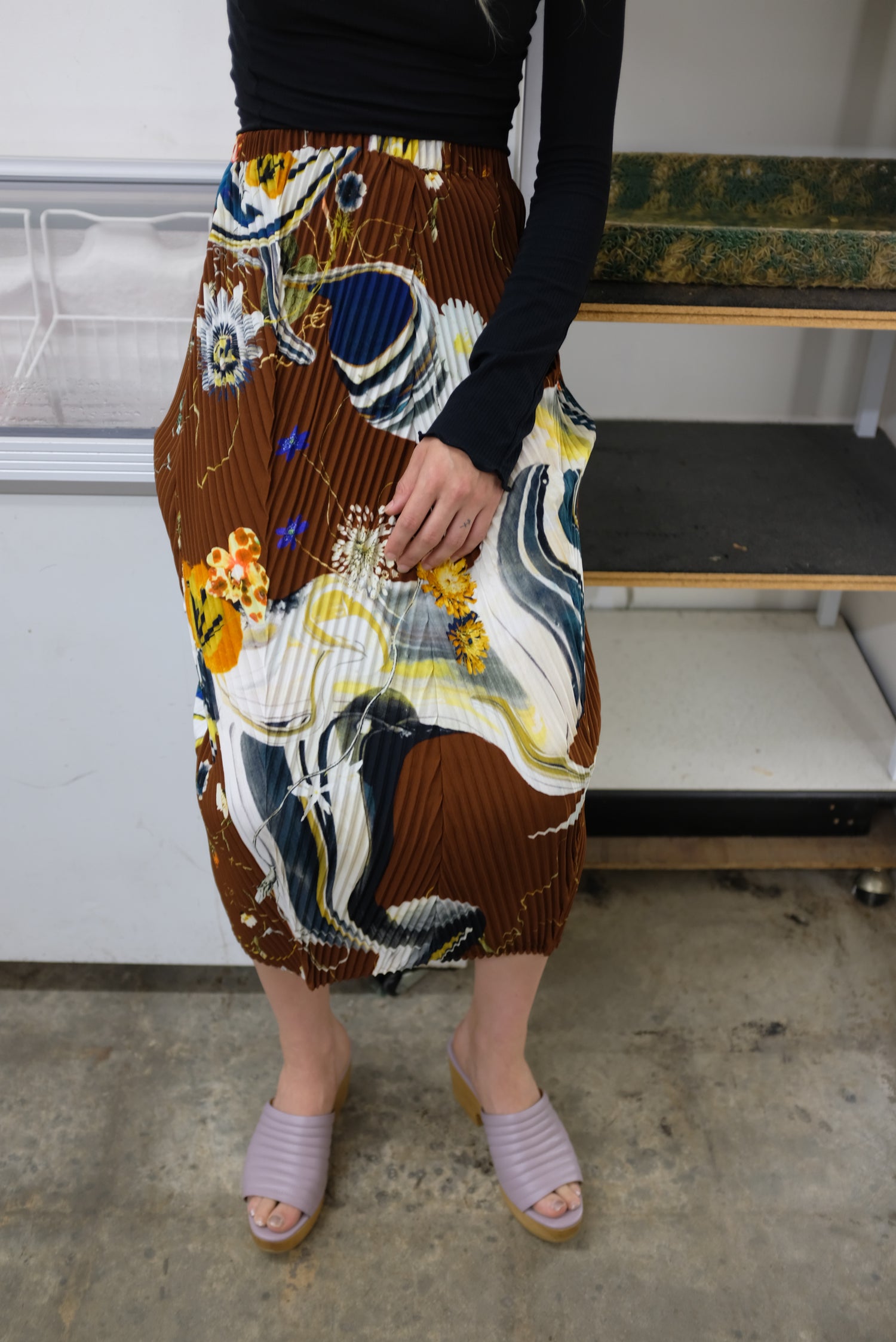 Beautiful hand dyed skirt. Hand pleated using arashi shibori technique. Pattern placement, pleating and measurements vary as each skirt is handmade individually. Zigzag hemline, elastic waist band. Slightly sheer. One size fits most. 100% PES Chiffon.
