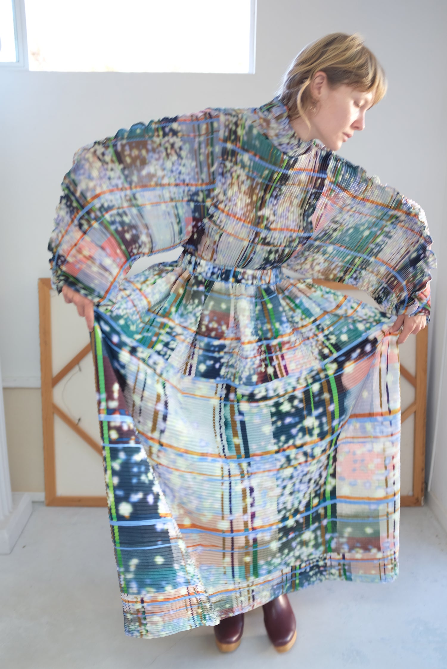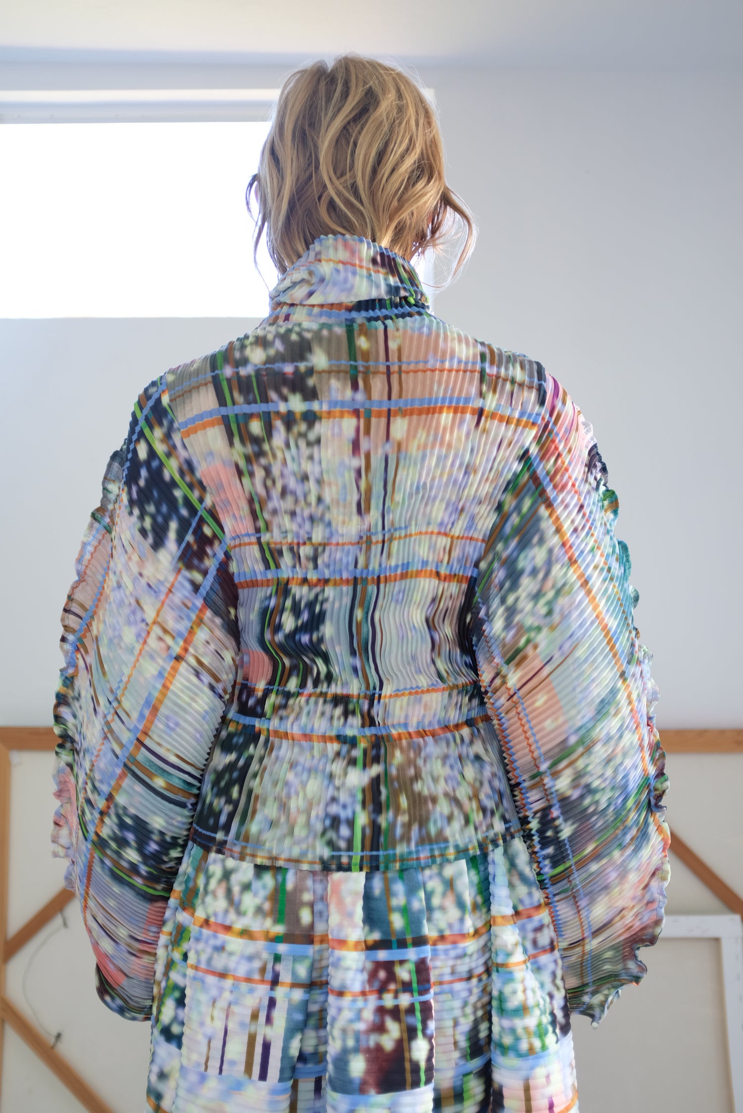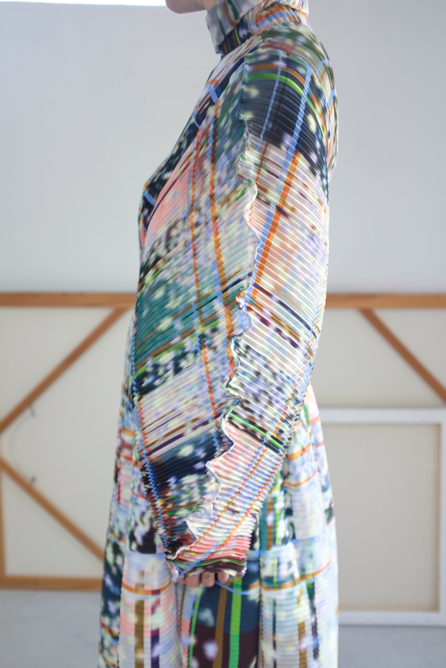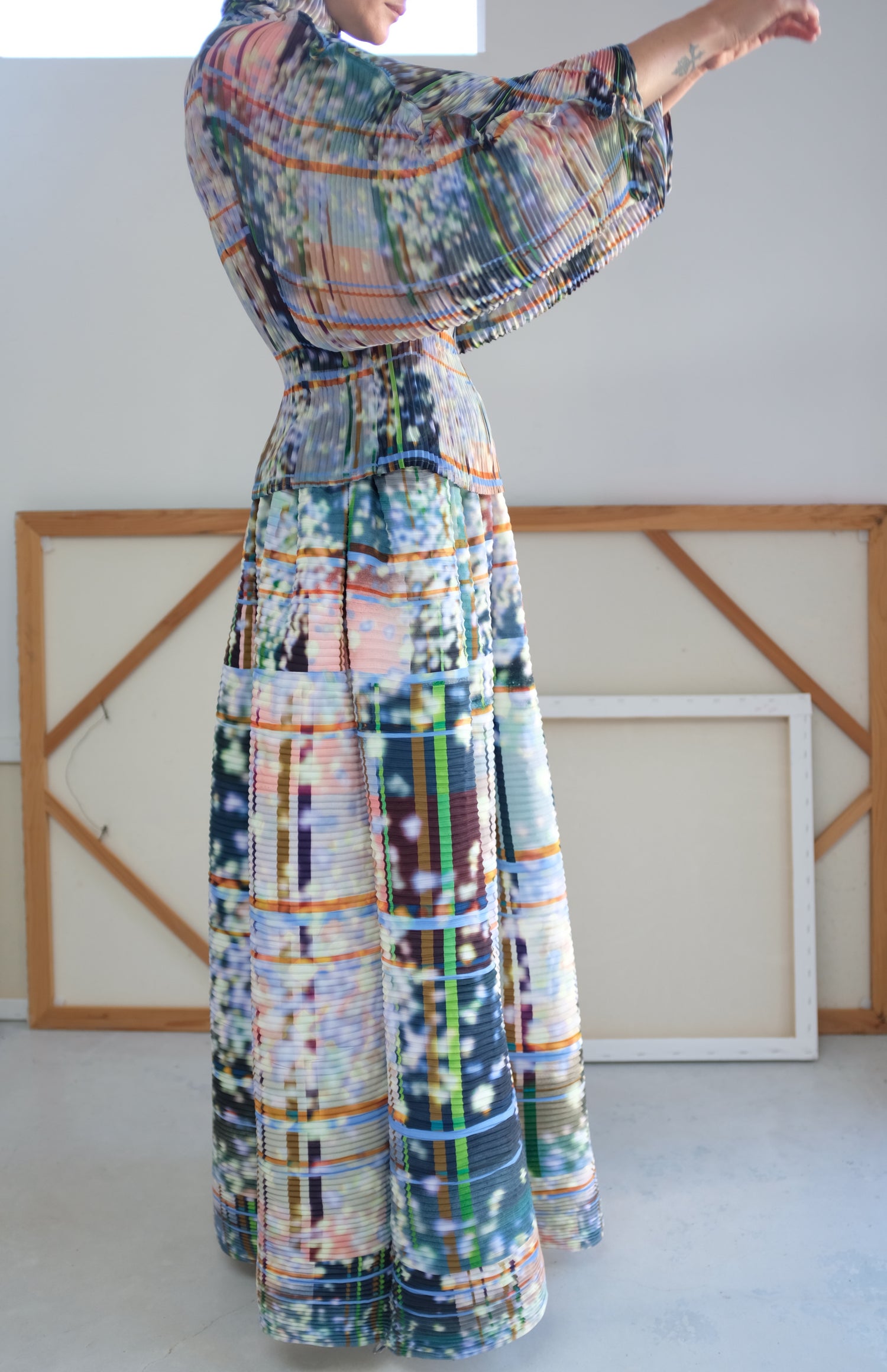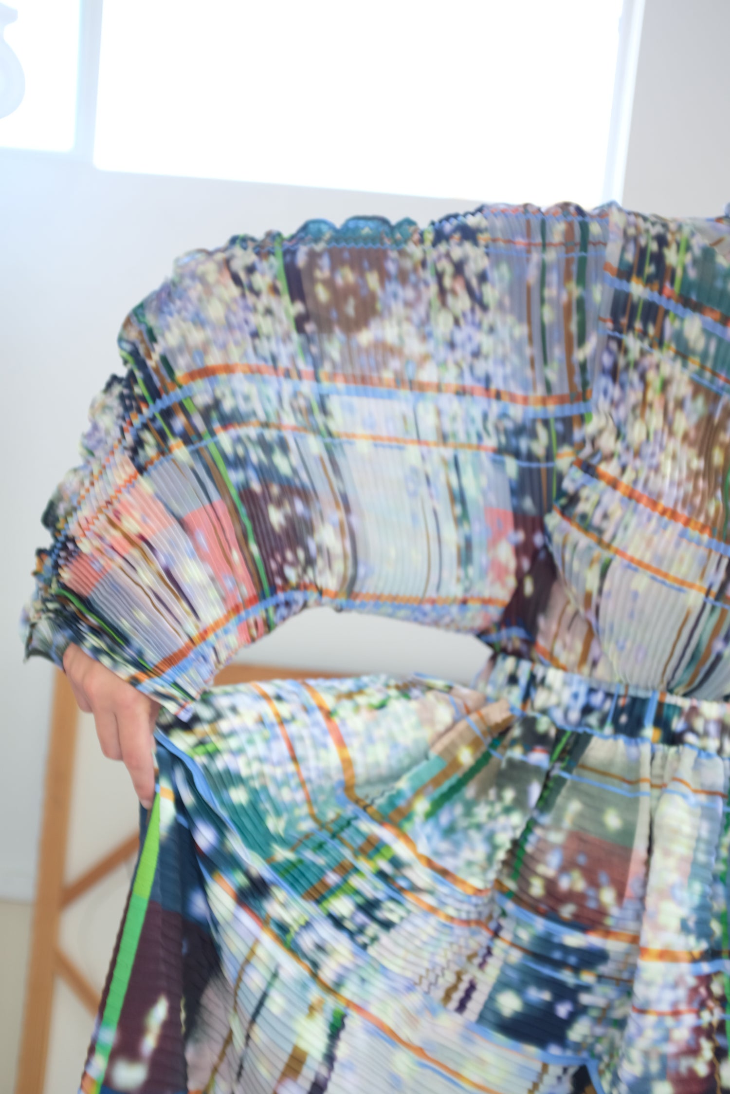 Beautiful hand dyed turtleneck top. Hand pleated using arashi shibori technique. Pattern placement, pleating and measurements vary as each top is handmade individually. Long wide sleeves, slightly sheer. One size fits most. 100% PES Chiffon.