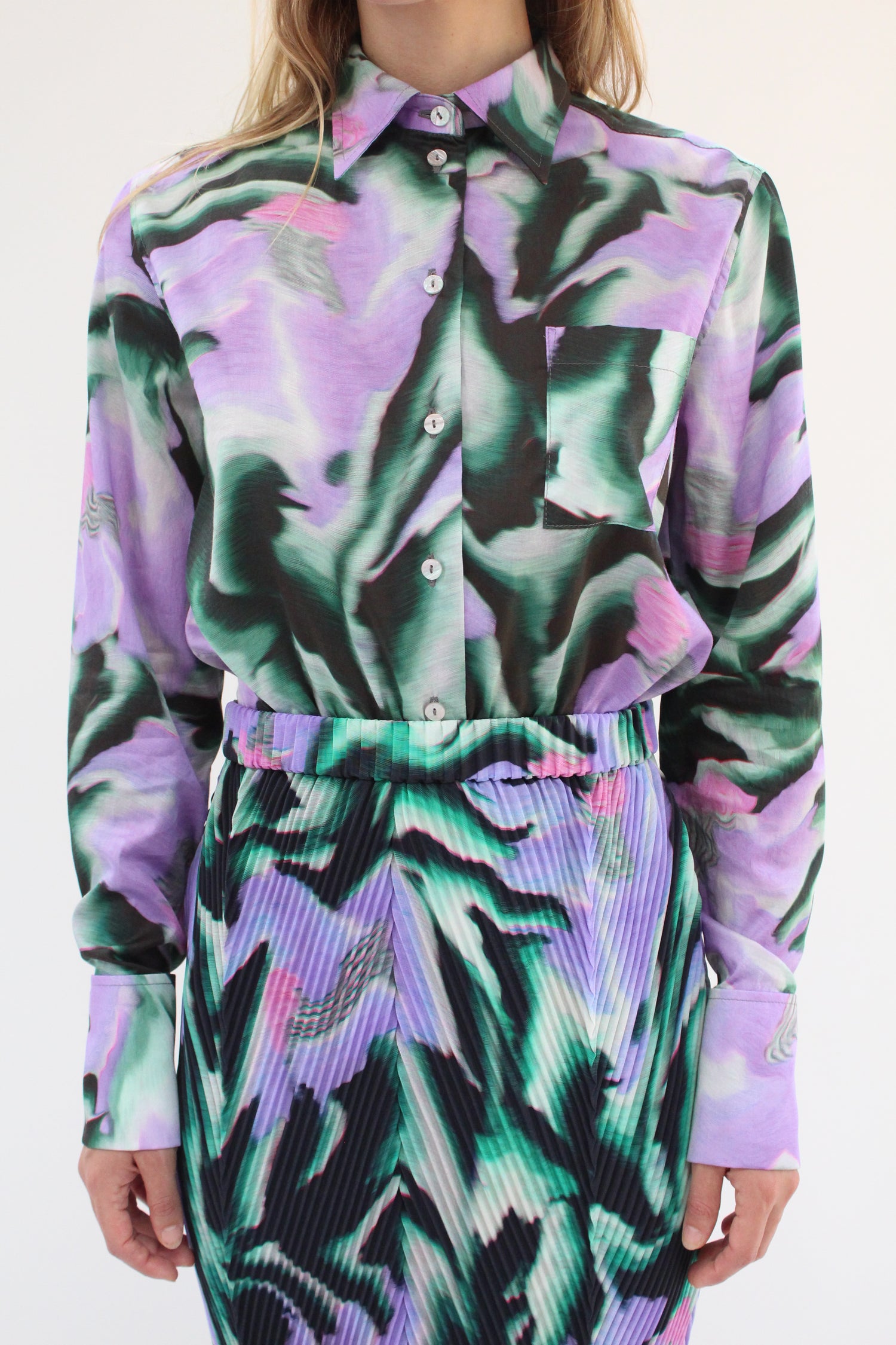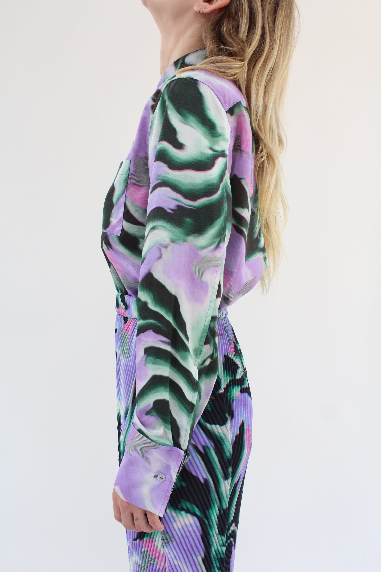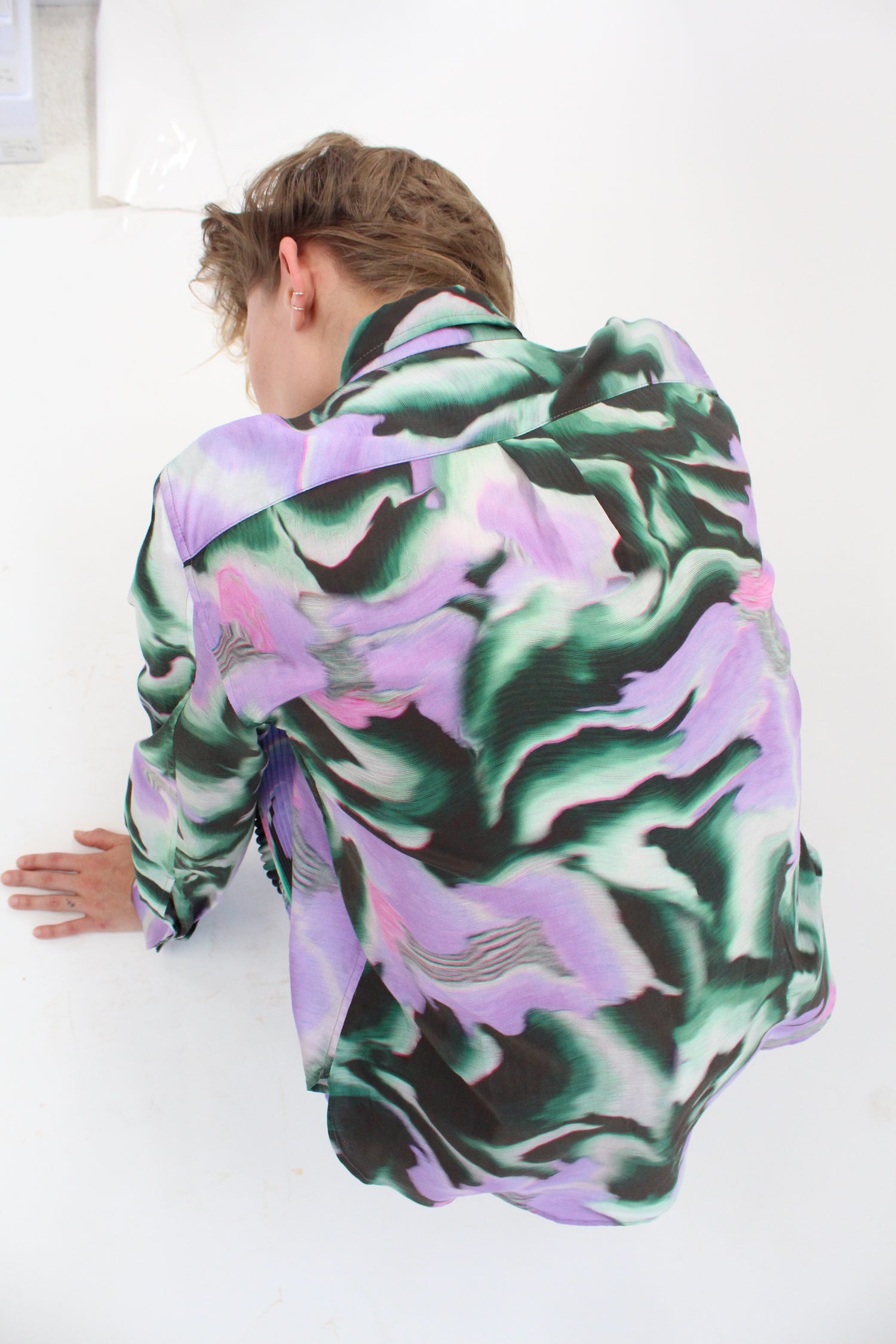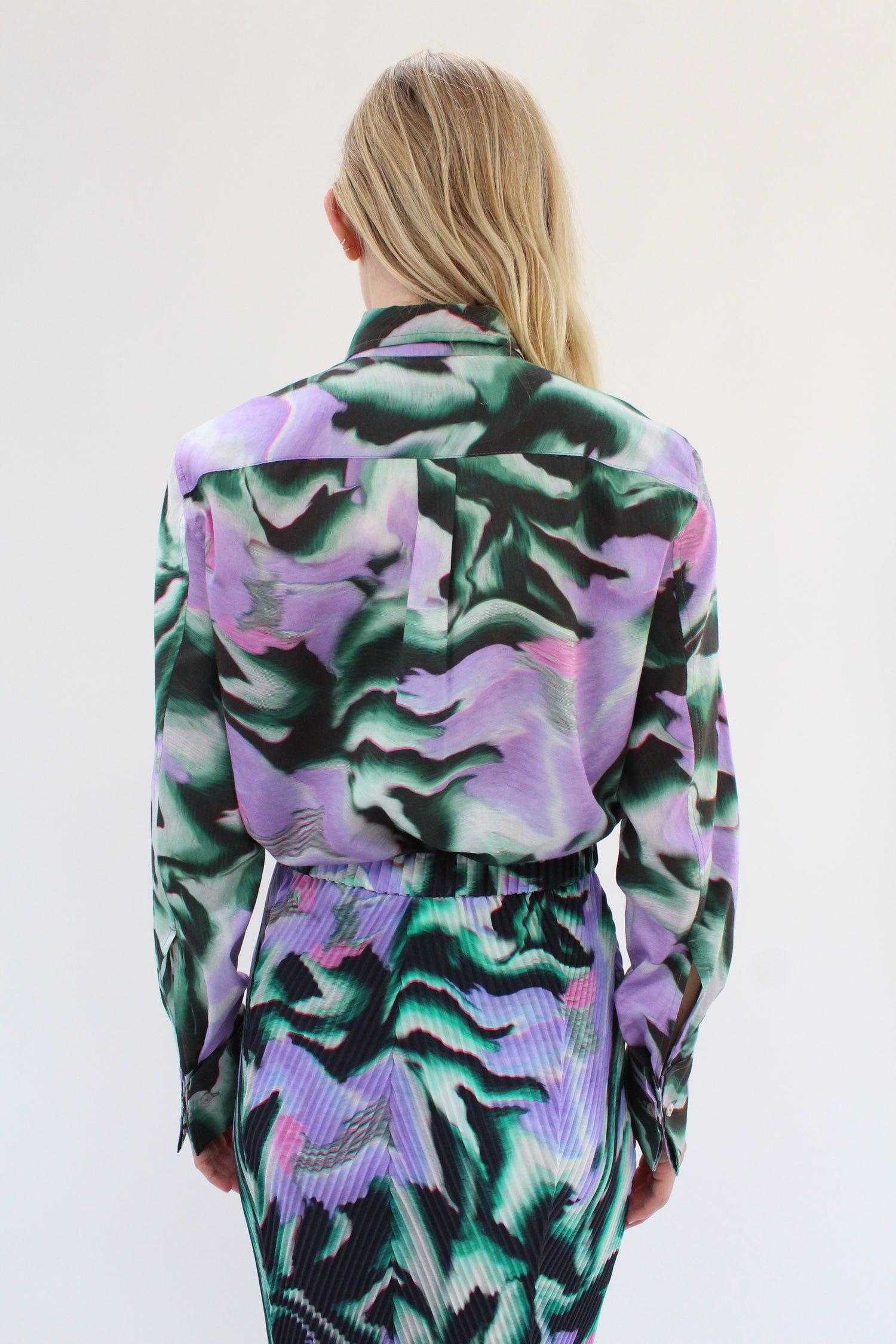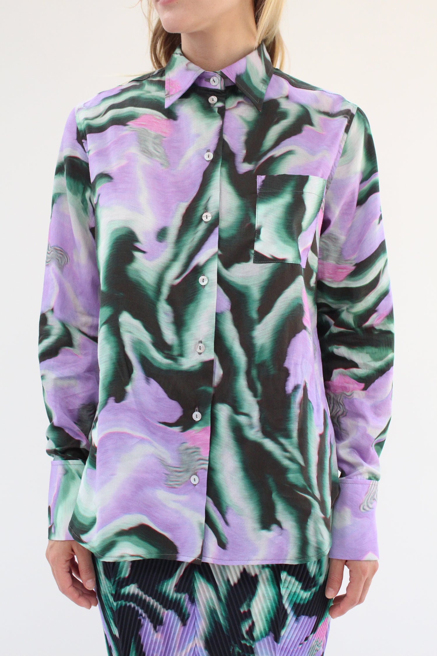 Beautiful blouse, long sleeved, mother of pearl button down shirt. Standard collar with single pocket on left side of chest. 4" French cuffs with mother of pear cuff links. Pattern placement vary as each top is handmade individually. 100% Cotton.