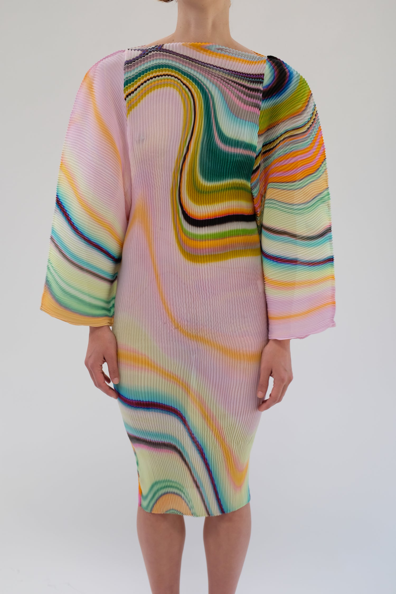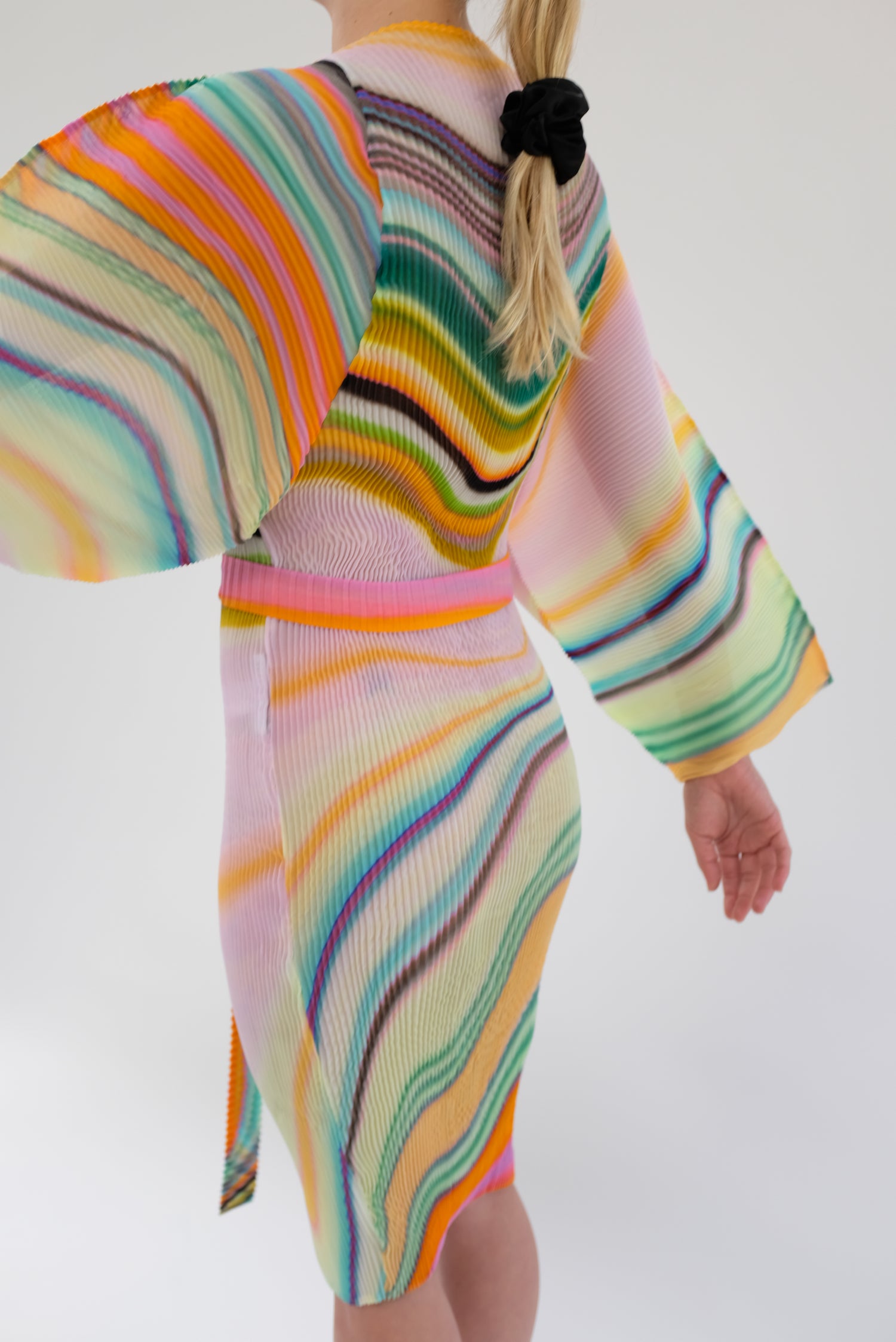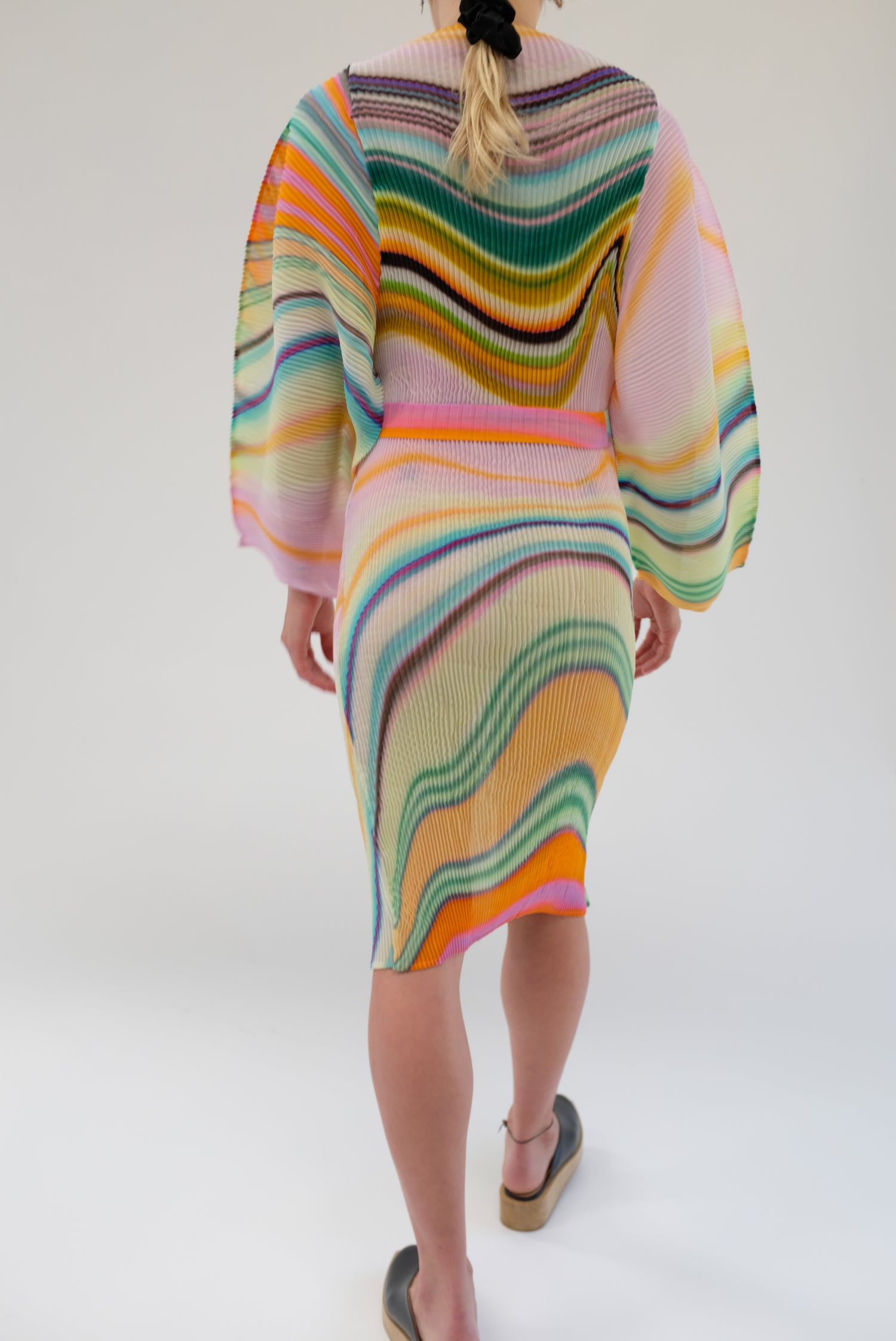Beautiful handmade dress with removable belt. Hand pleated using arashi shibori technique. Pattern placement, pleating and measurements vary as each dress is handmade individually. High neckline, long wide sleeves, slightly sheer. One size fits most. 100% PES Chiffon. Very limited edition.