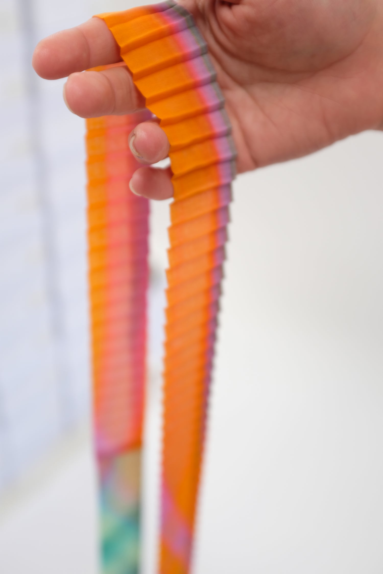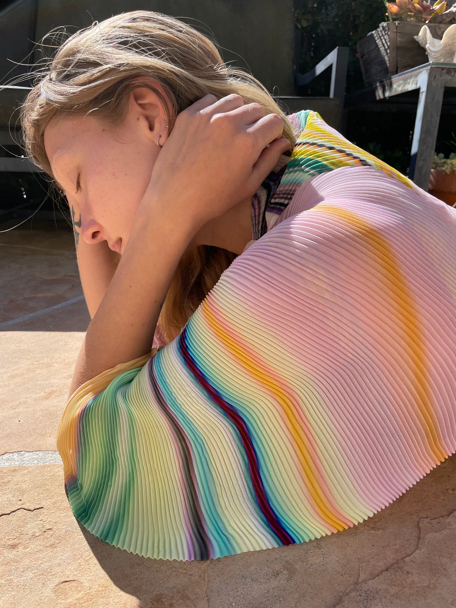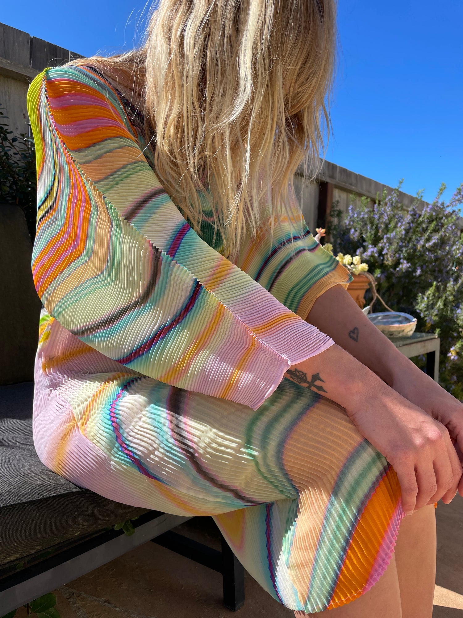 Beautiful handmade dress with removable belt. Hand pleated using arashi shibori technique. Pattern placement, pleating and measurements vary as each dress is handmade individually. High neckline, long wide sleeves, slightly sheer. One size fits most. 100% PES Chiffon. Very limited edition.