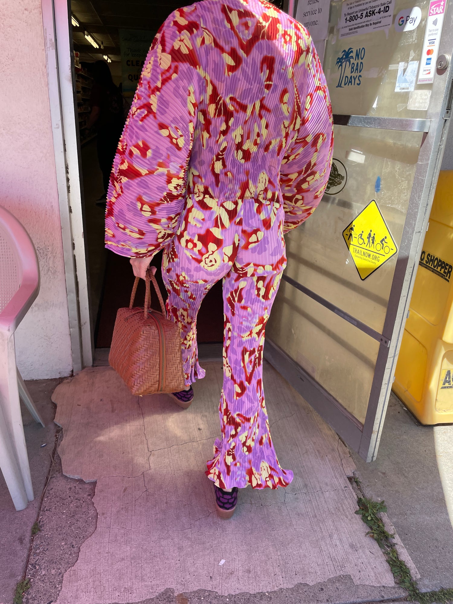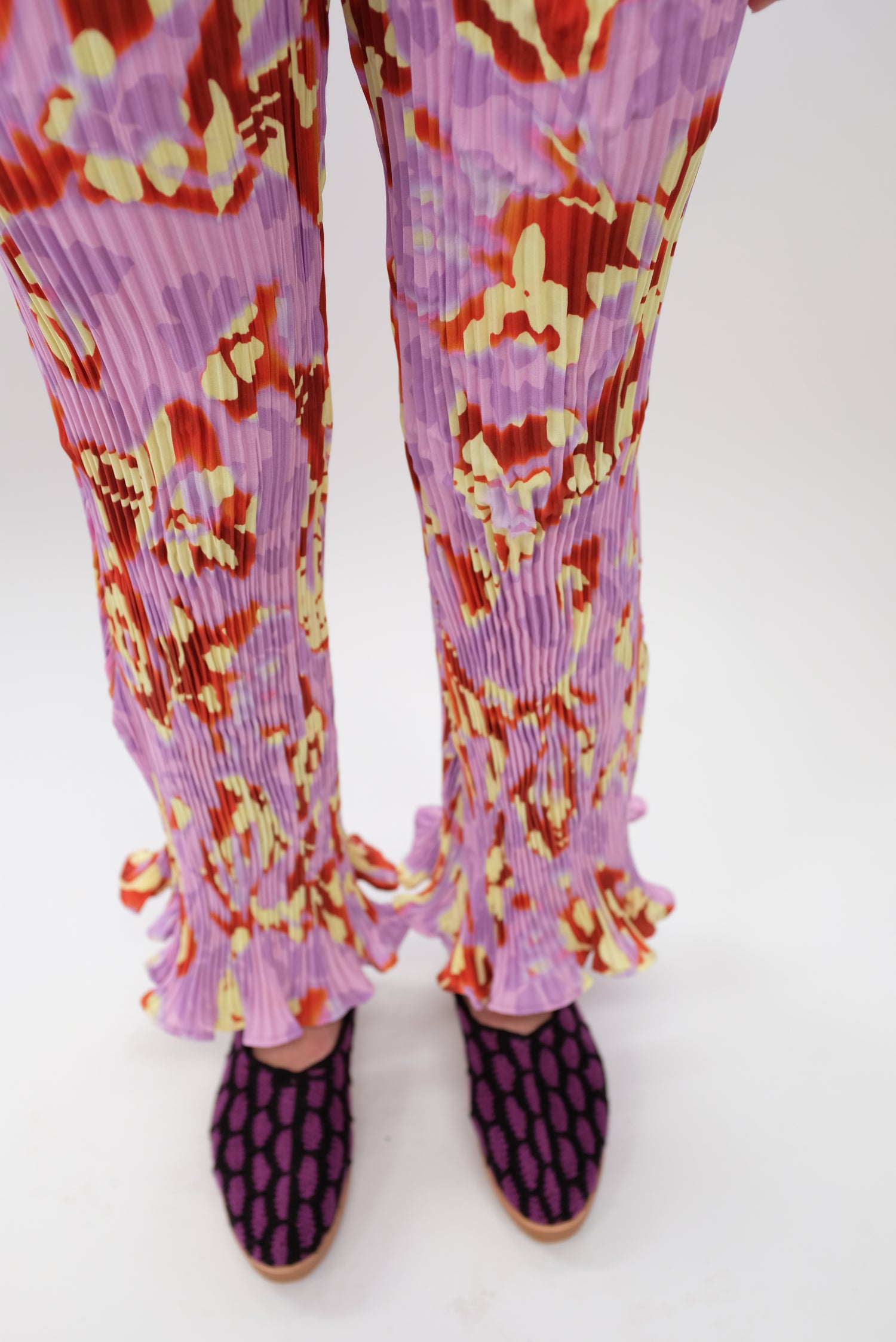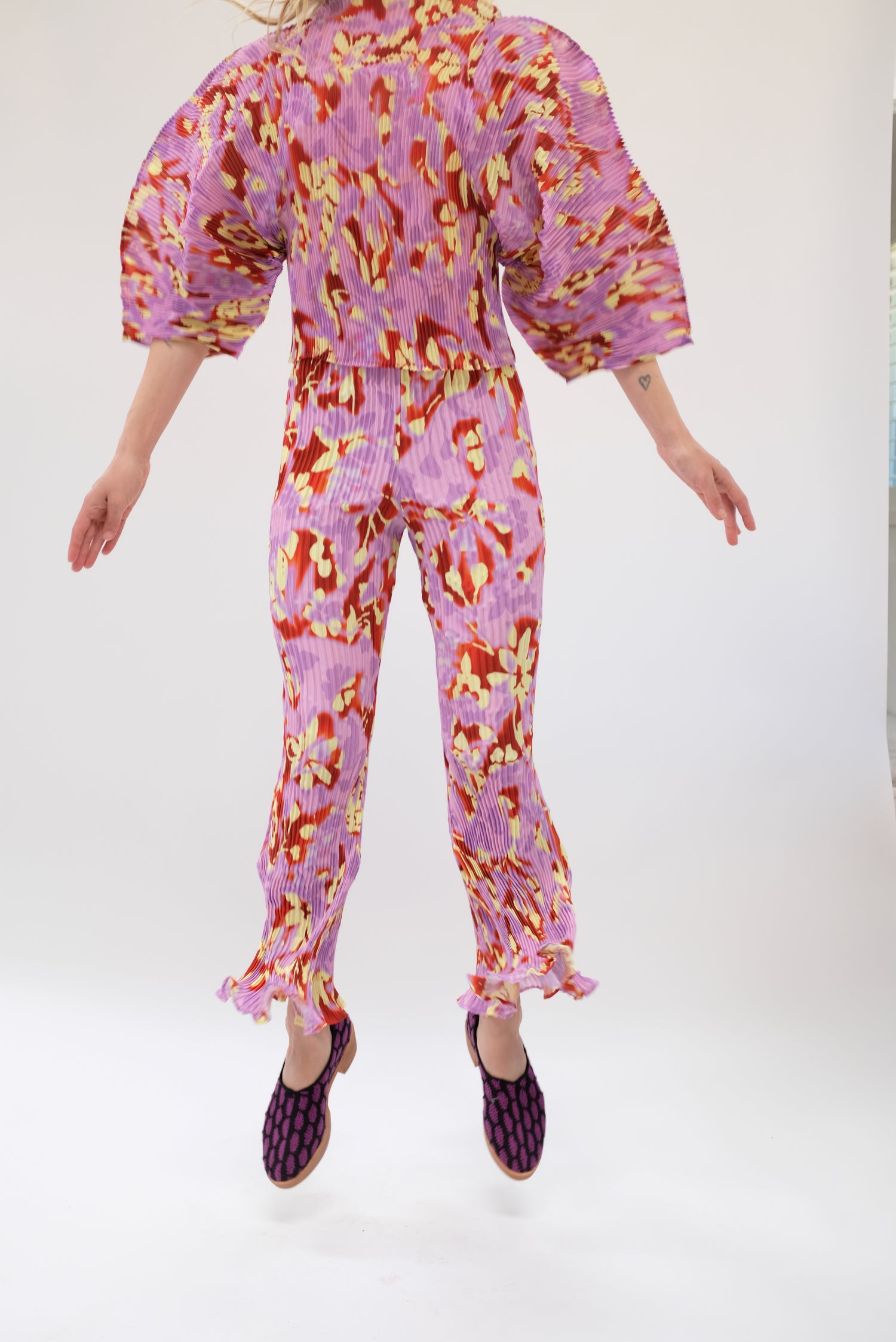 Beautiful hand dyed trouser. Hand pleated using arashi shibori technique. Pattern placement, pleating and measurements vary as each pant is handmade individually. Flared hem and elastic high-waist band. One size fits most. 100% PES Chiffon.
