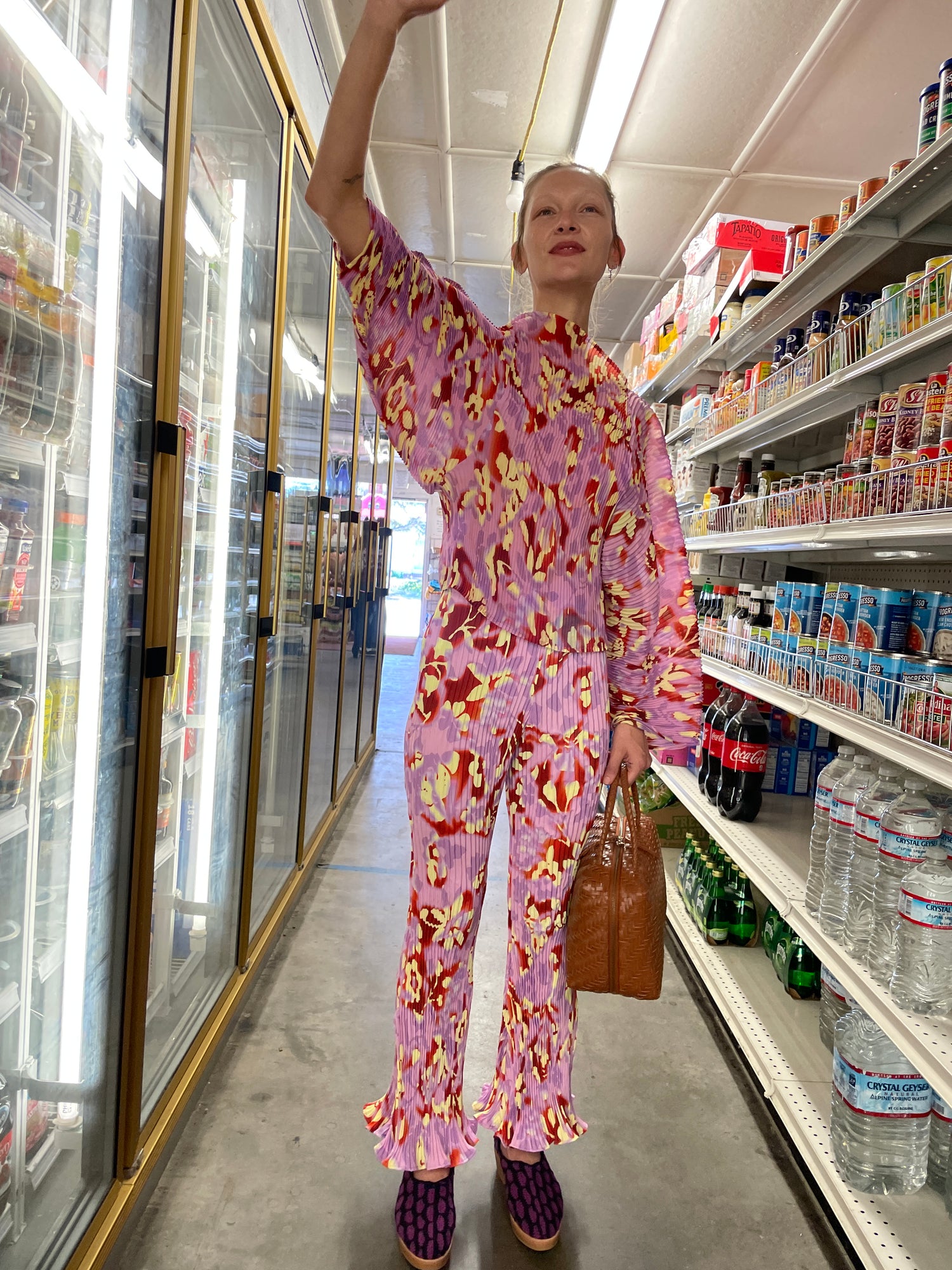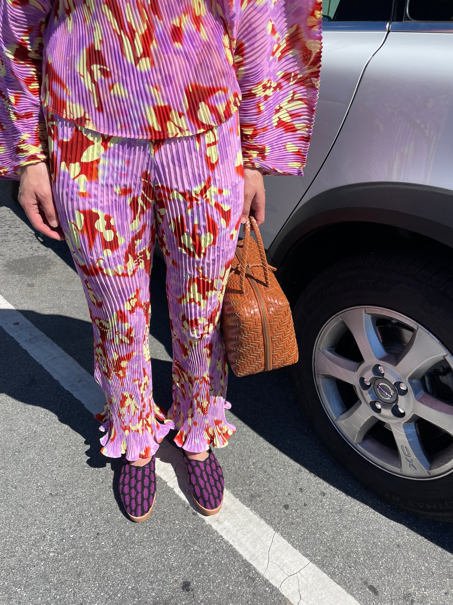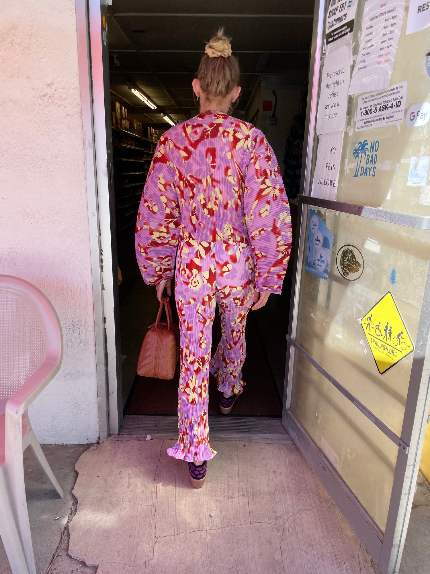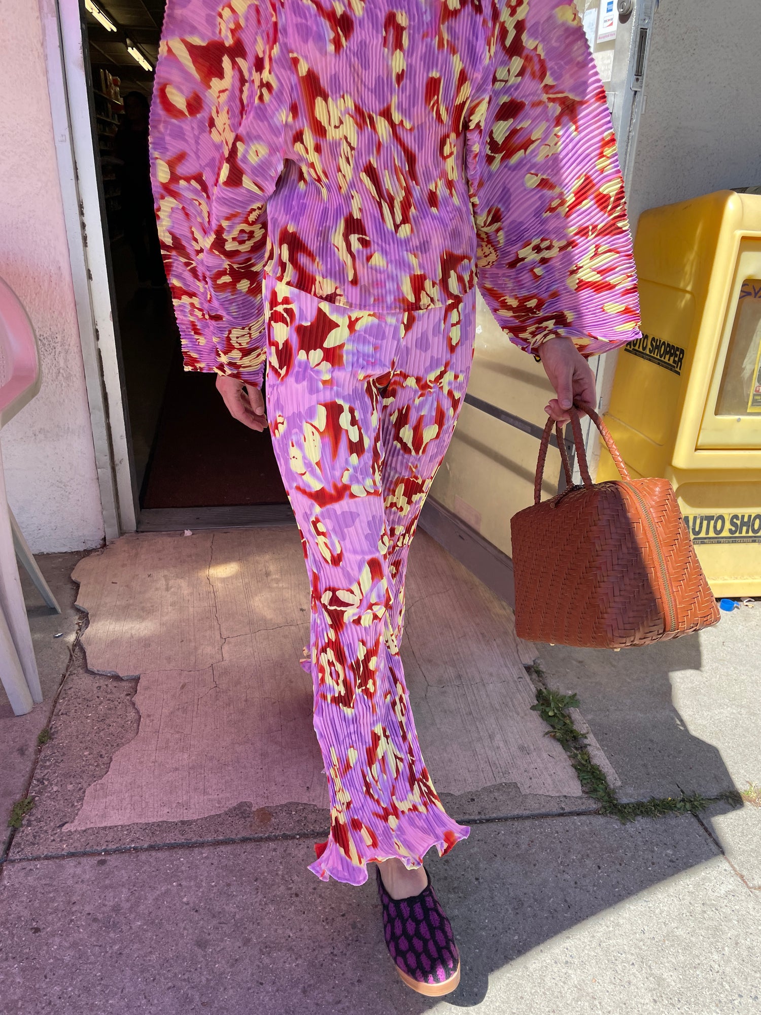 Beautiful hand dyed trouser. Hand pleated using arashi shibori technique. Pattern placement, pleating and measurements vary as each pant is handmade individually. Flared hem and elastic high-waist band. One size fits most. 100% PES Chiffon.