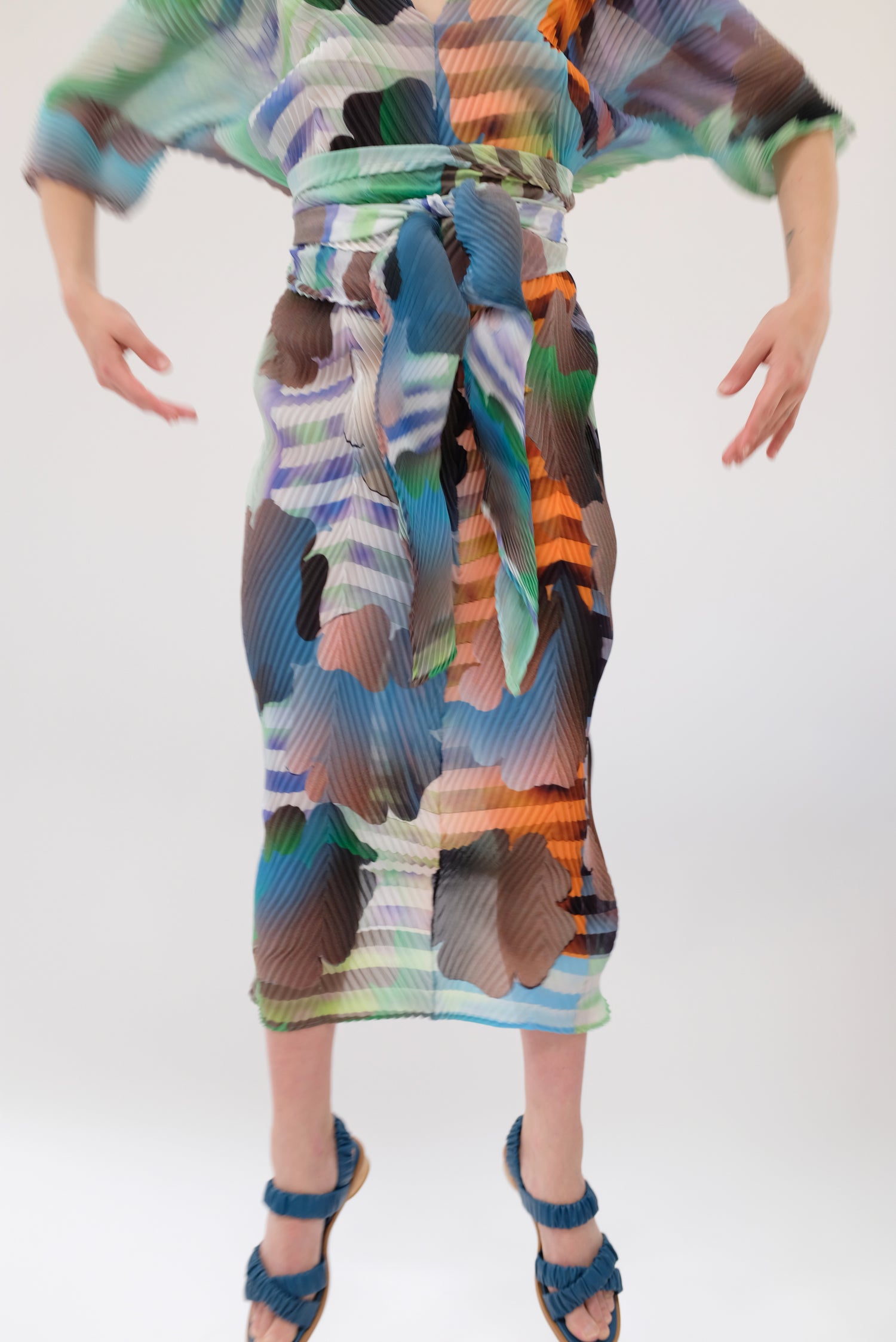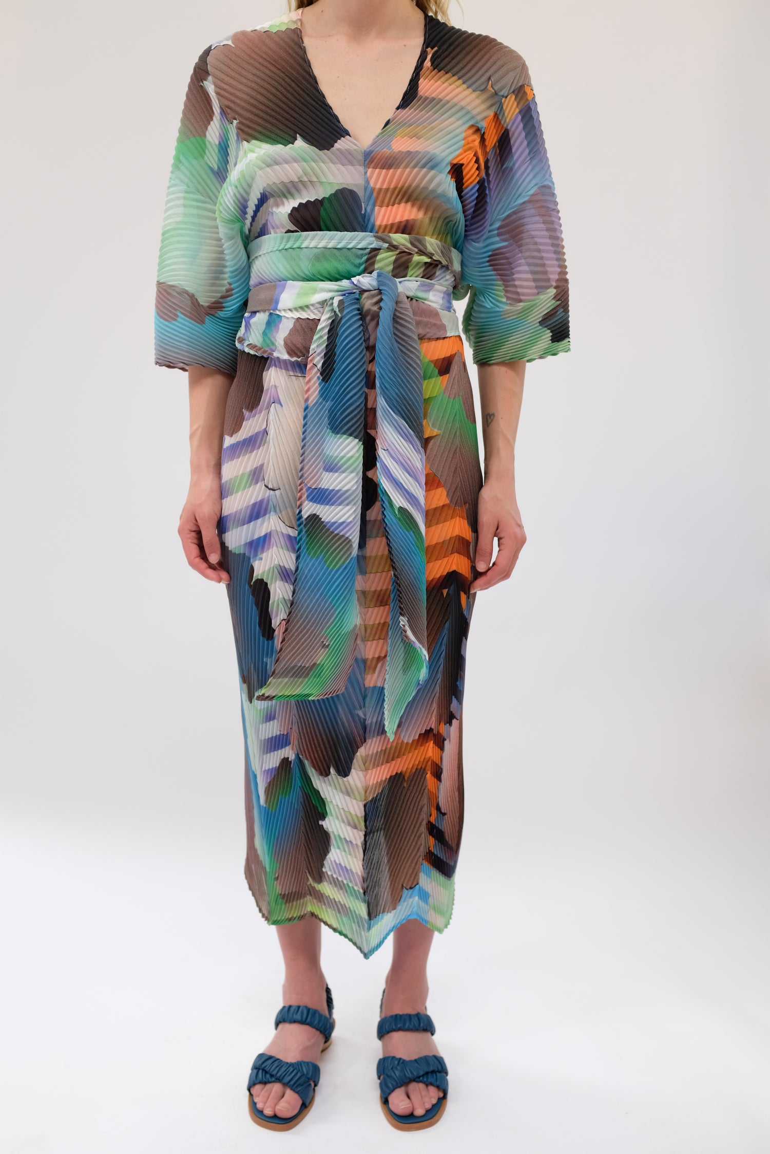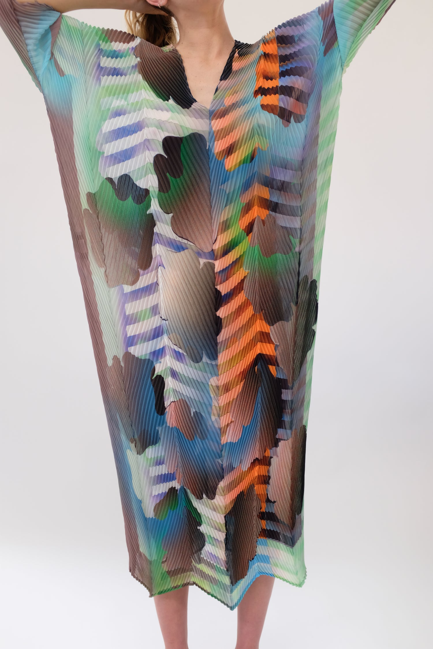 Beautiful hand made kaftan dress with removable belt. Very limited edition. Hand pleated using arashi shibori technique. Pattern placement, pleating and measurements vary as each dress is handmade individually. V-neck, zigzag hem line. Slightly sheer. One size fits most. 100% PES Chiffon.