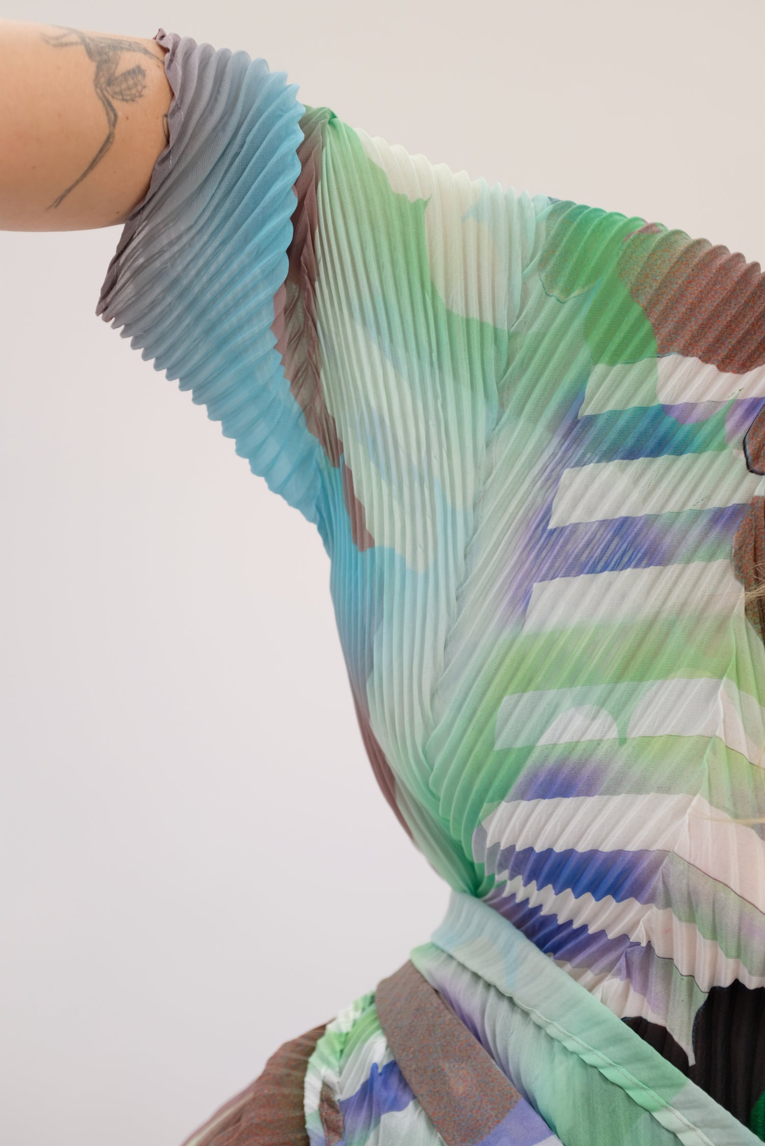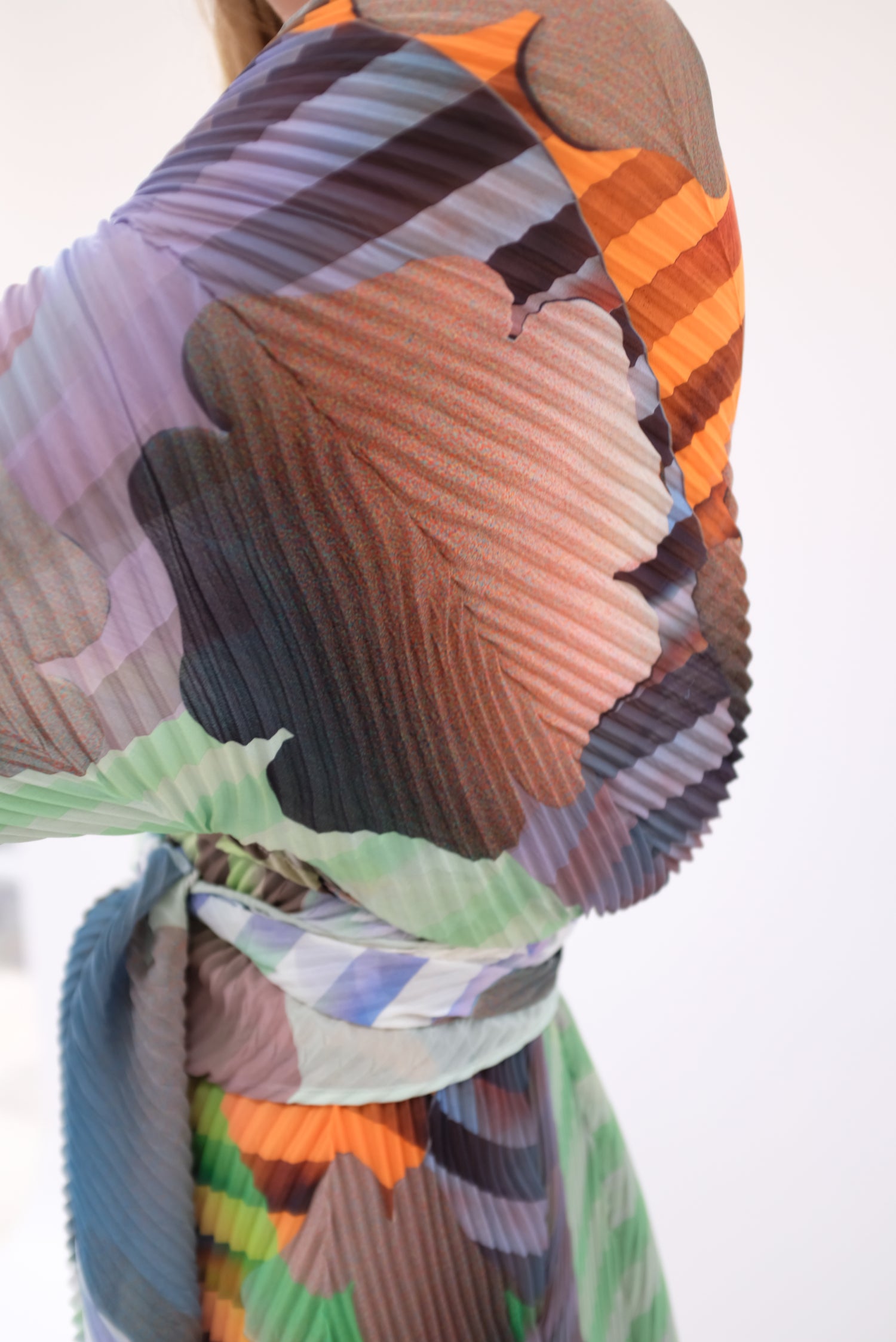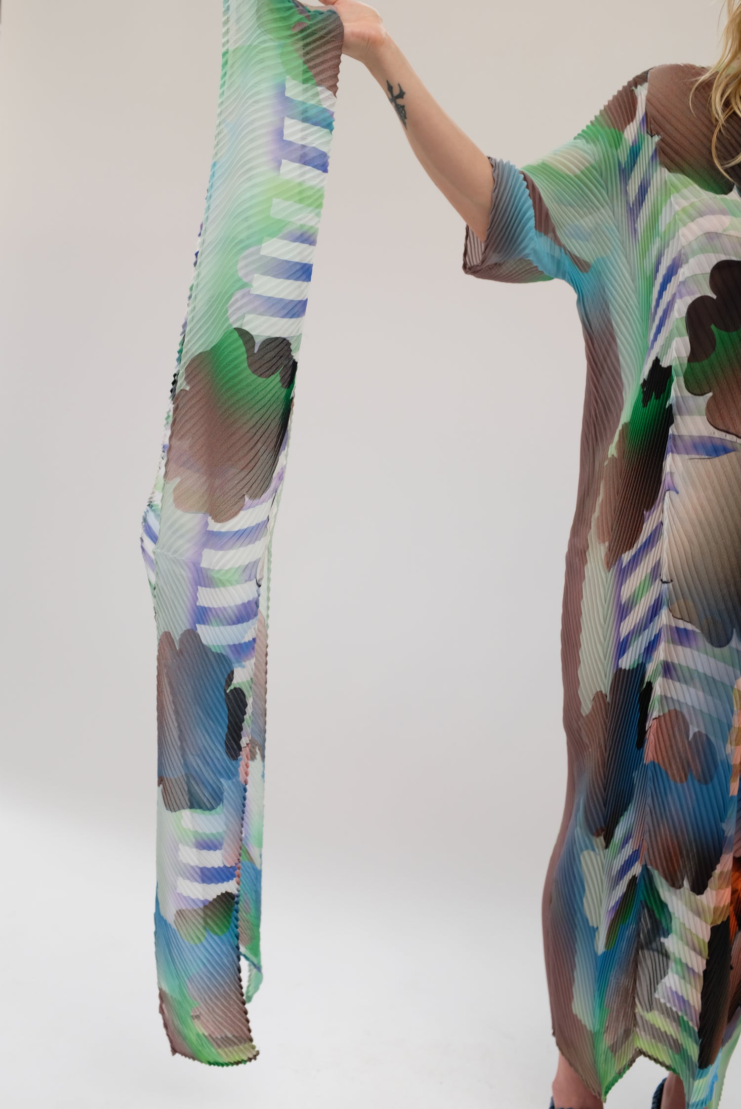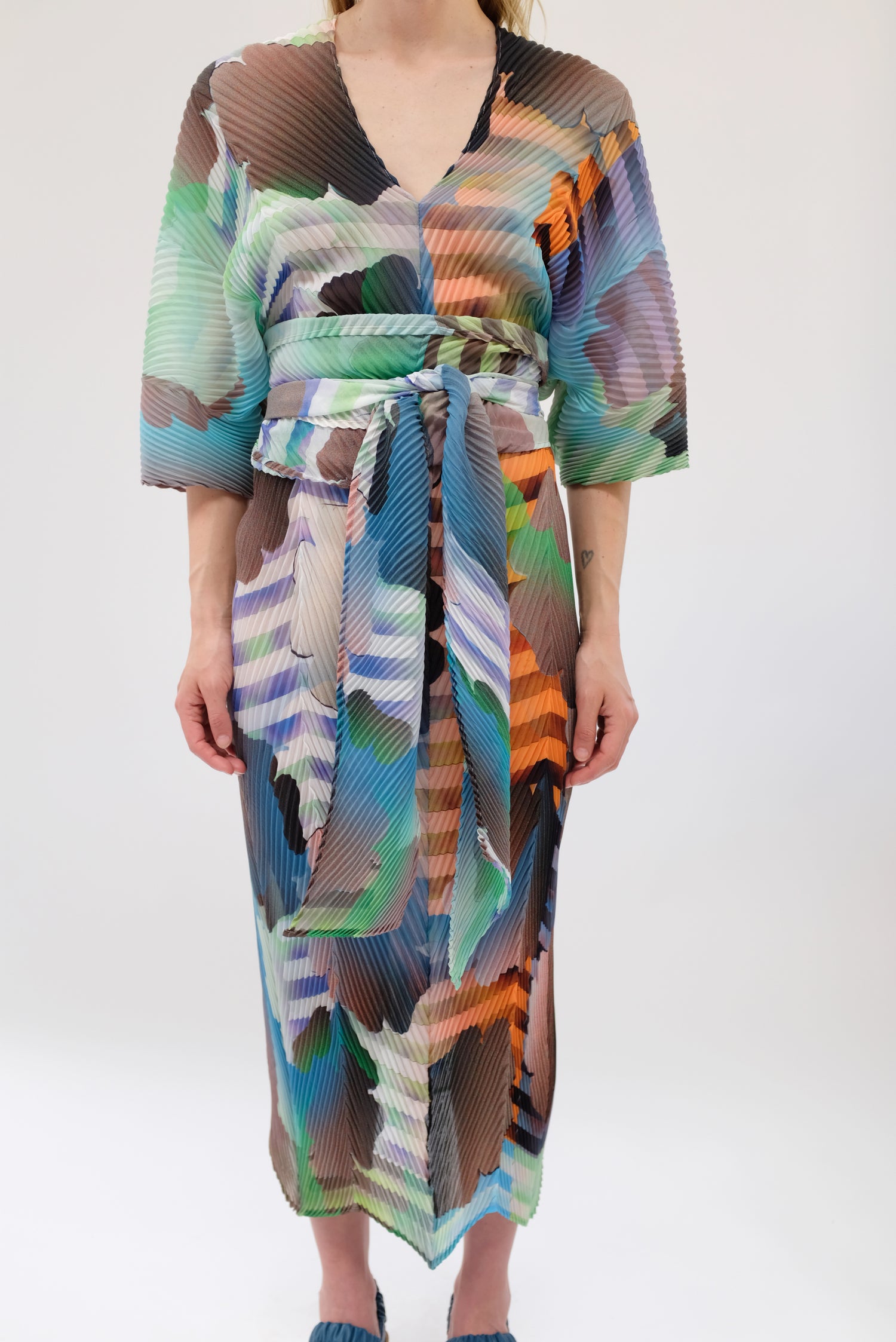 Beautiful hand made kaftan dress with removable belt. Very limited edition. Hand pleated using arashi shibori technique. Pattern placement, pleating and measurements vary as each dress is handmade individually. V-neck, zigzag hem line. Slightly sheer. One size fits most. 100% PES Chiffon.