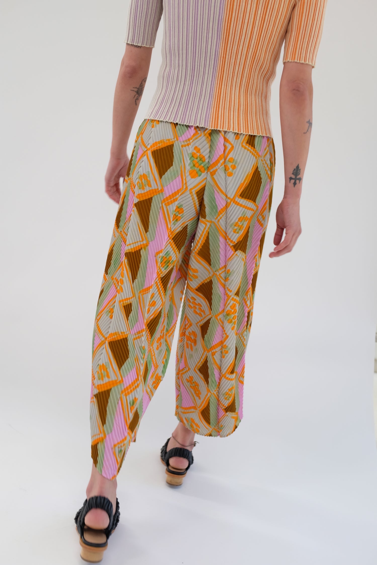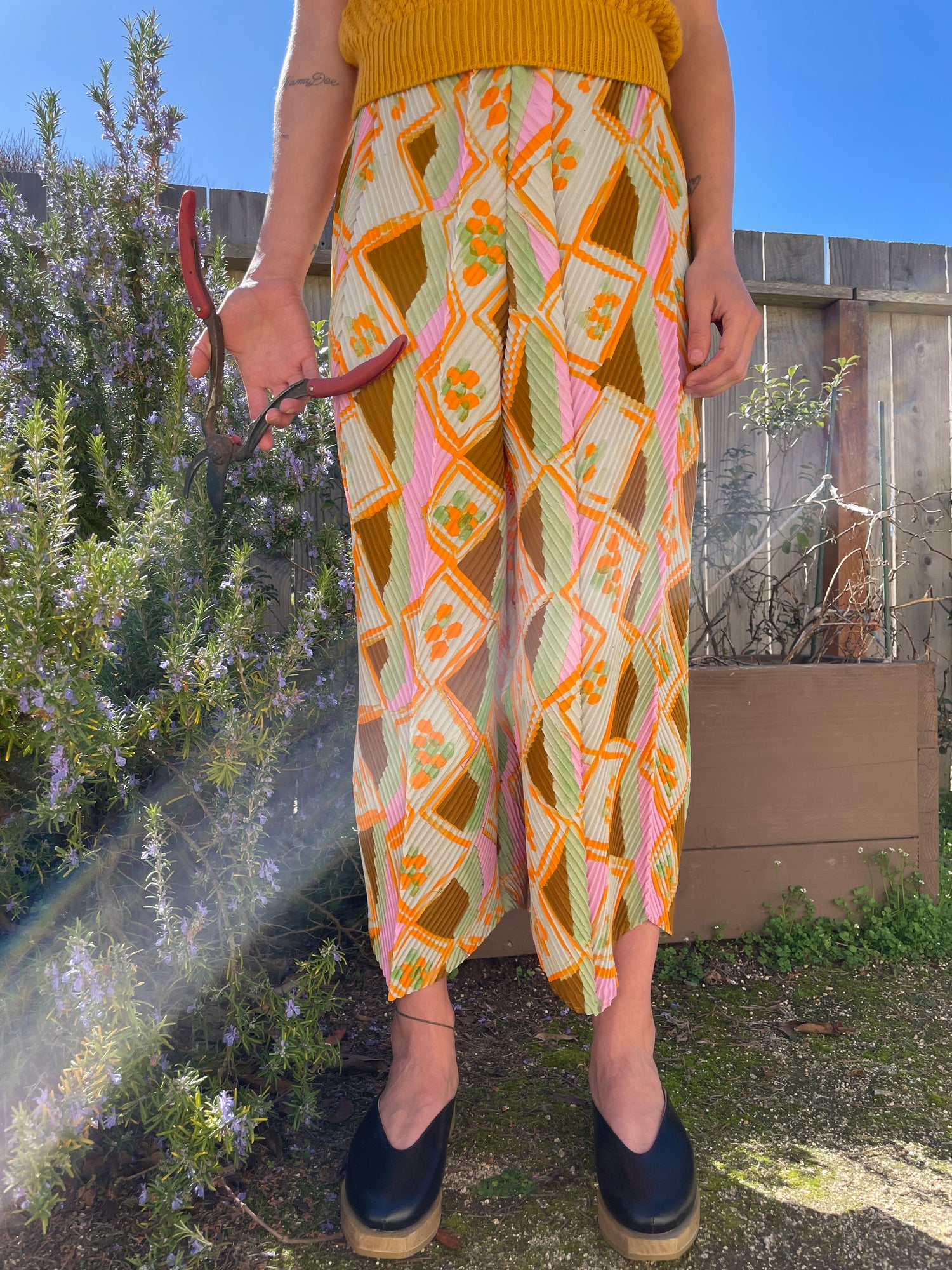 Beautiful hand dyed trousers. Hand pleated using arashi shibori technique. Pattern placement, pleating and measurements vary as each trouser is handmade individually. Zigzag hemline, elastic waist band. One size fits most. 100% PES Chiffon.
